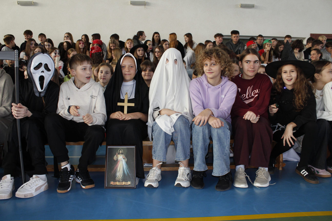 W dniu dzisiejszym uczniowie klas I - V III oraz przedszkolaki również aktywnie wzięli udział w konkursie pt. Święty na medal oraz w konkursie pt. Najstraszniejszy strój Halloween. Samorząd Uczniowski od godziny 8.00 rano aktywnie wybierał zwycięzców konkursów. Wyniki wszystkich konkursów zostały przedstawione na apelu porządkowym. W konkursie pt. Święty na medal zwyciężyli: