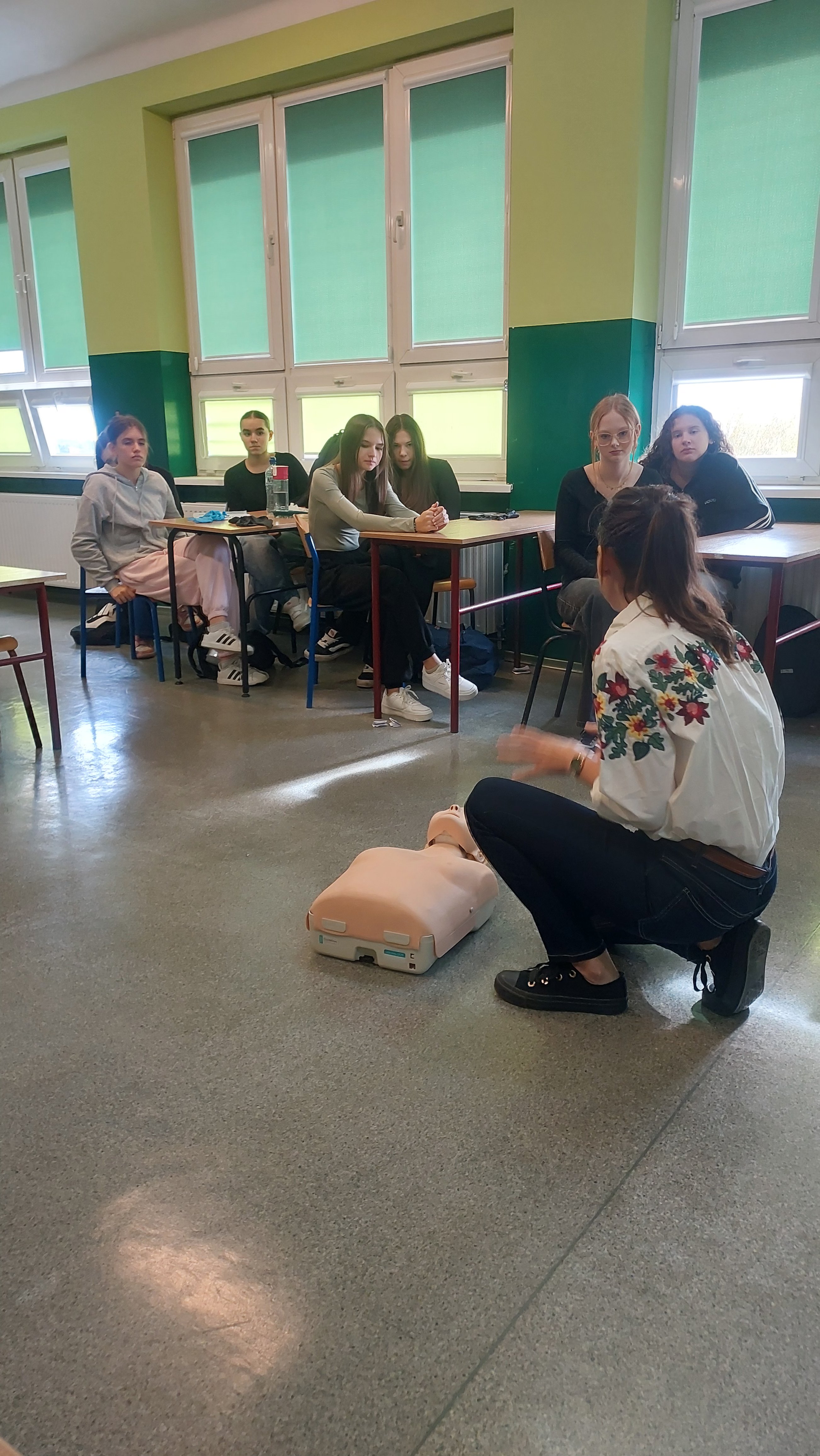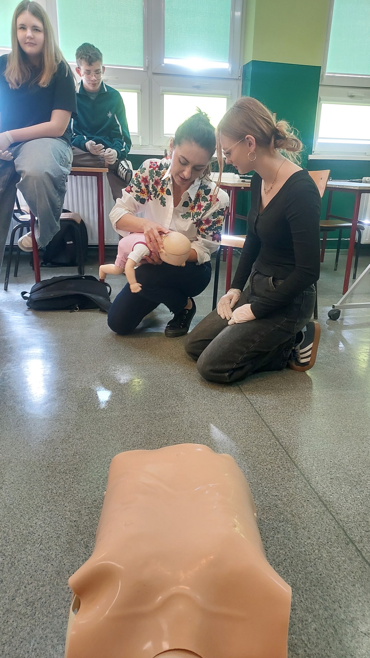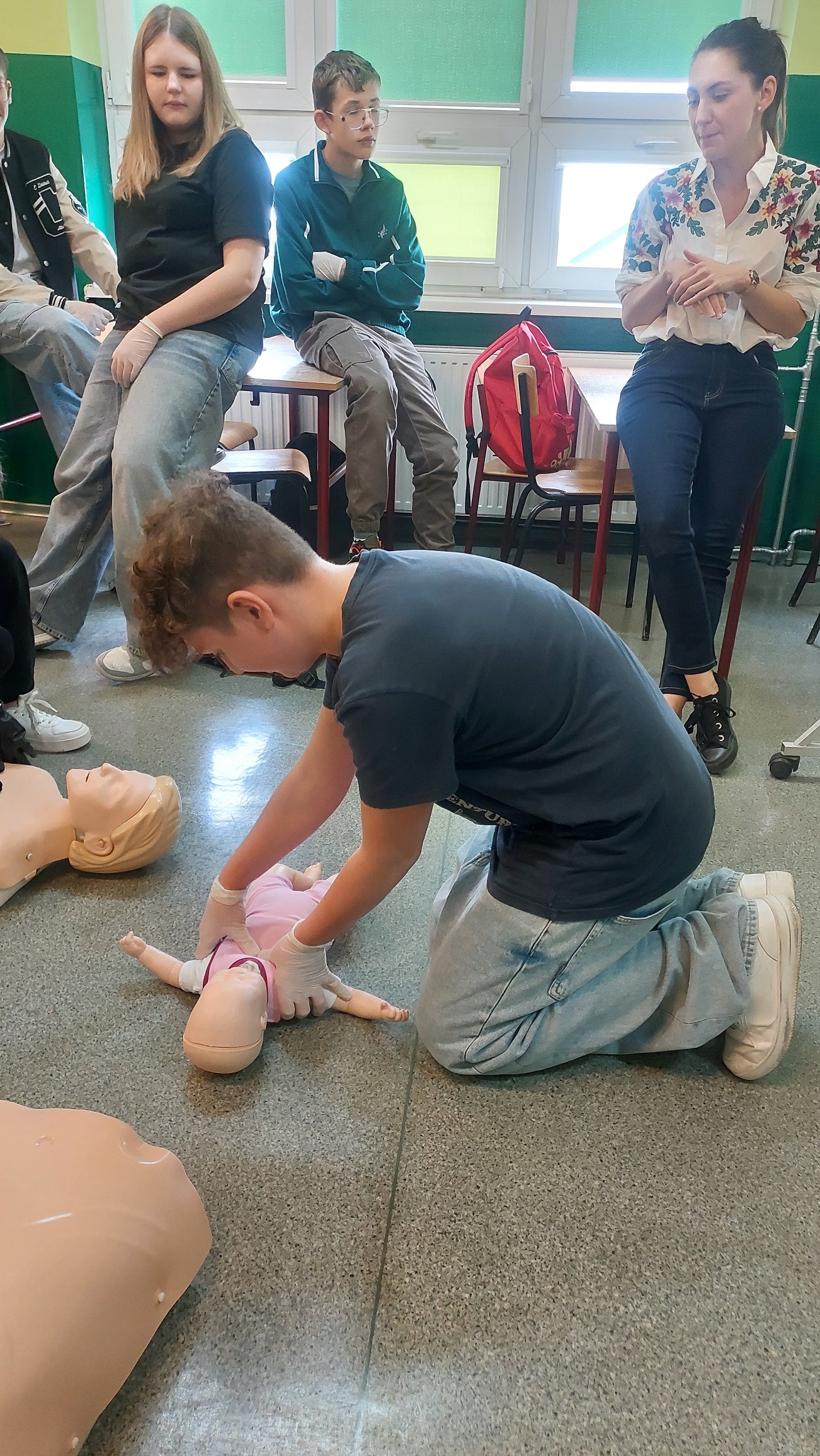 Ważnym punktem programu była prelekcja pani doktor Moniki Piecuch-Kilarowskiej, która szczegółowo omówiła schemat postępowania w sytuacji zatrzymania krążenia, wyjaśniając, jak prawidłowo przeprowadzić RKO w różnych grupach wiekowych. Uczniowie klasy VIIIb nie tylko zdobyli teoretyczną wiedzę, ale również praktycznie ją zastosowali, ćwicząc na fantomach.