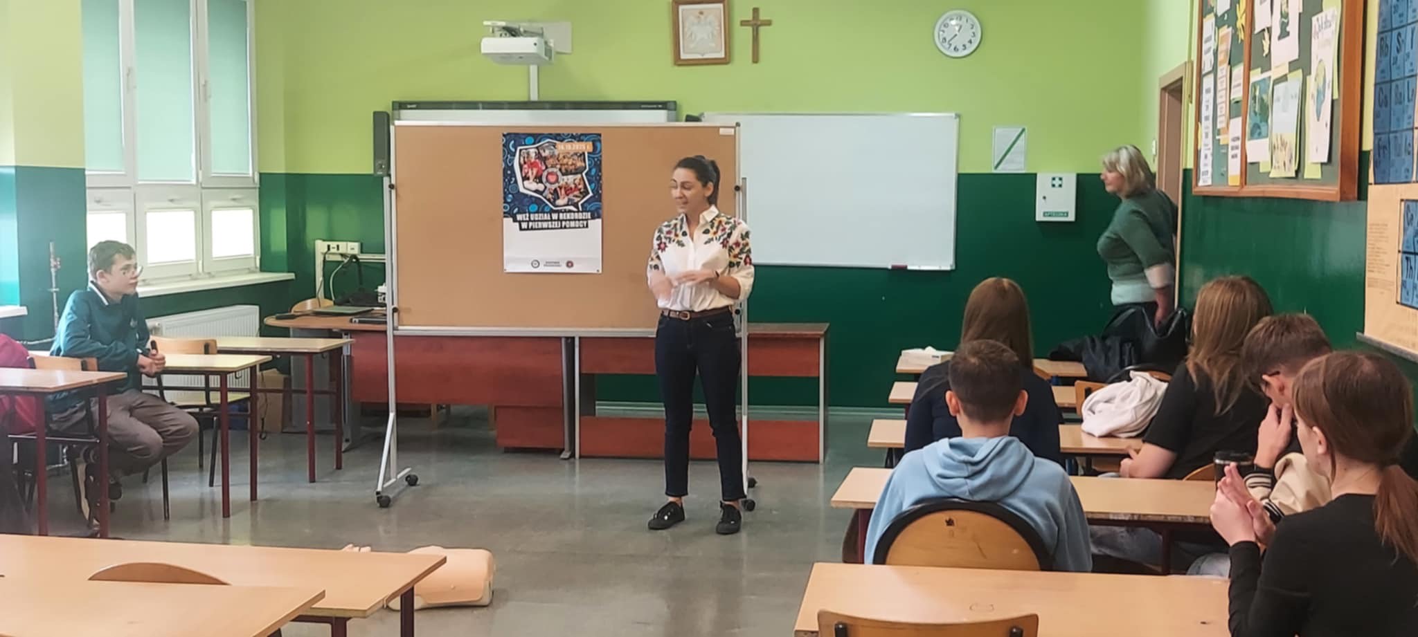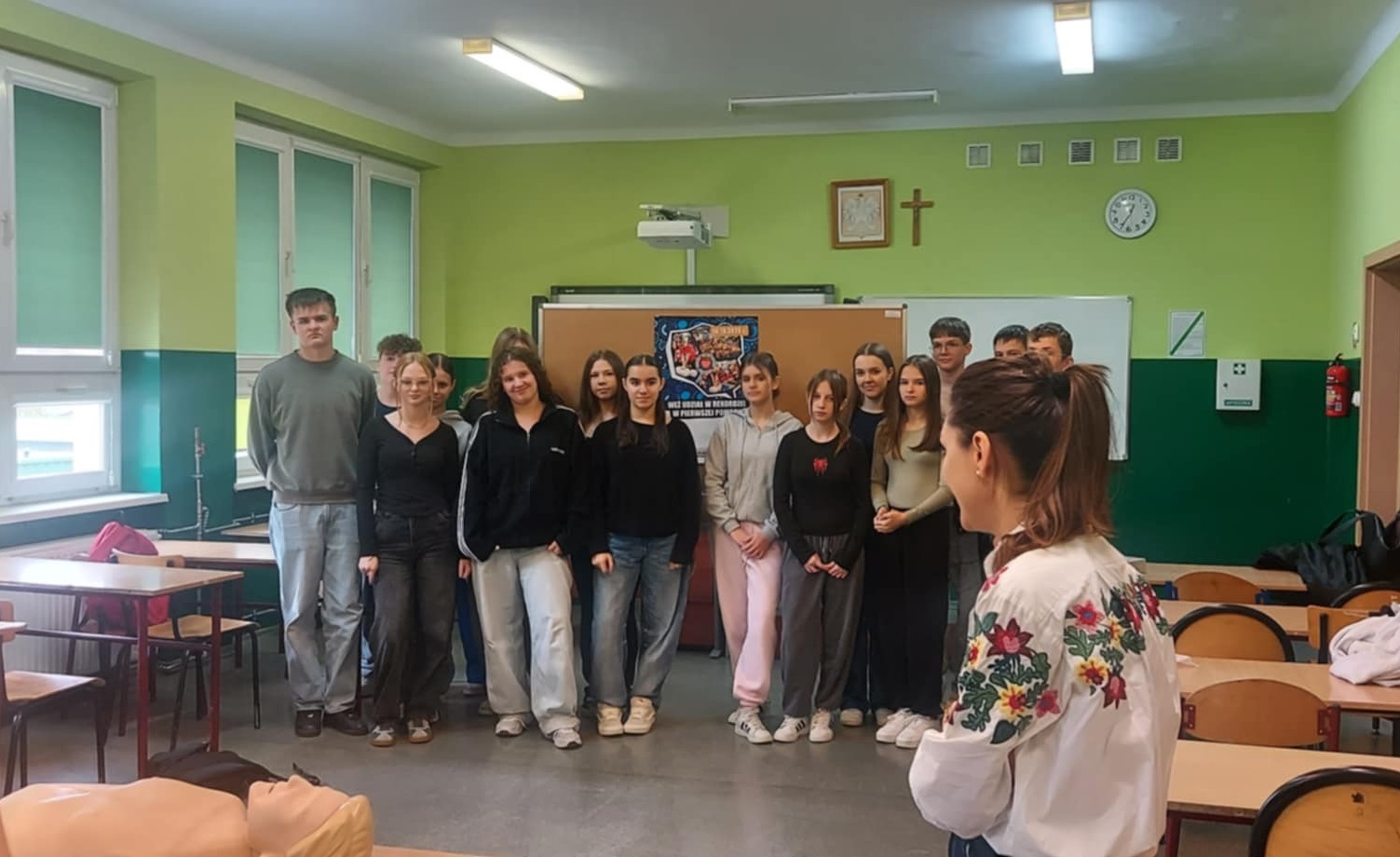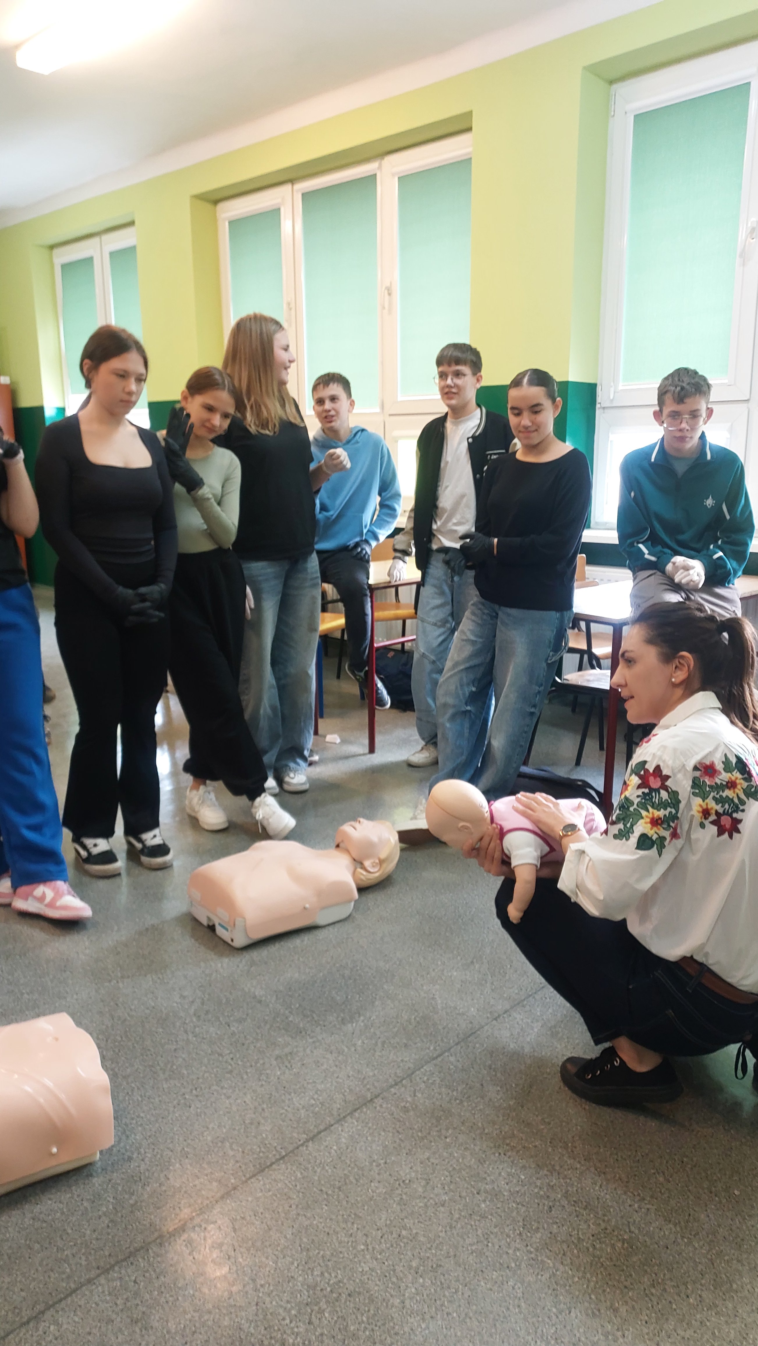 Ważnym punktem programu była prelekcja pani doktor Moniki Piecuch-Kilarowskiej, która szczegółowo omówiła schemat postępowania w sytuacji zatrzymania krążenia, wyjaśniając, jak prawidłowo przeprowadzić RKO w różnych grupach wiekowych. Uczniowie klasy VIIIb nie tylko zdobyli teoretyczną wiedzę, ale również praktycznie ją zastosowali, ćwicząc na fantomach.