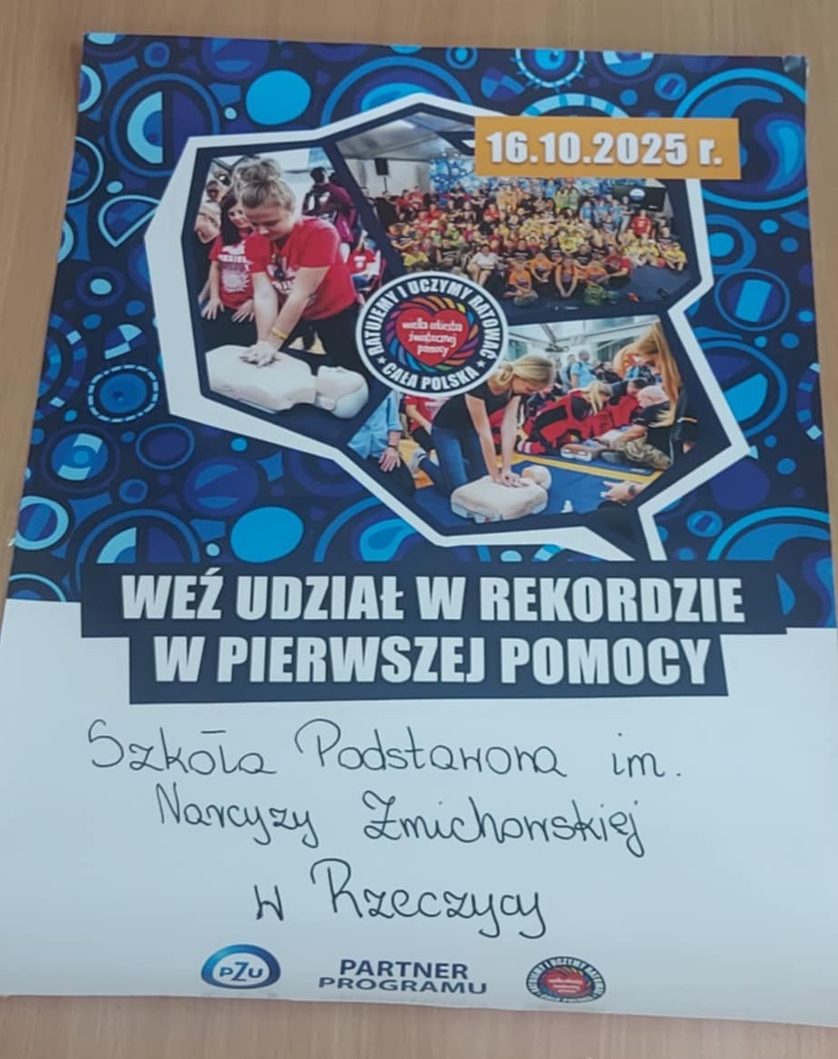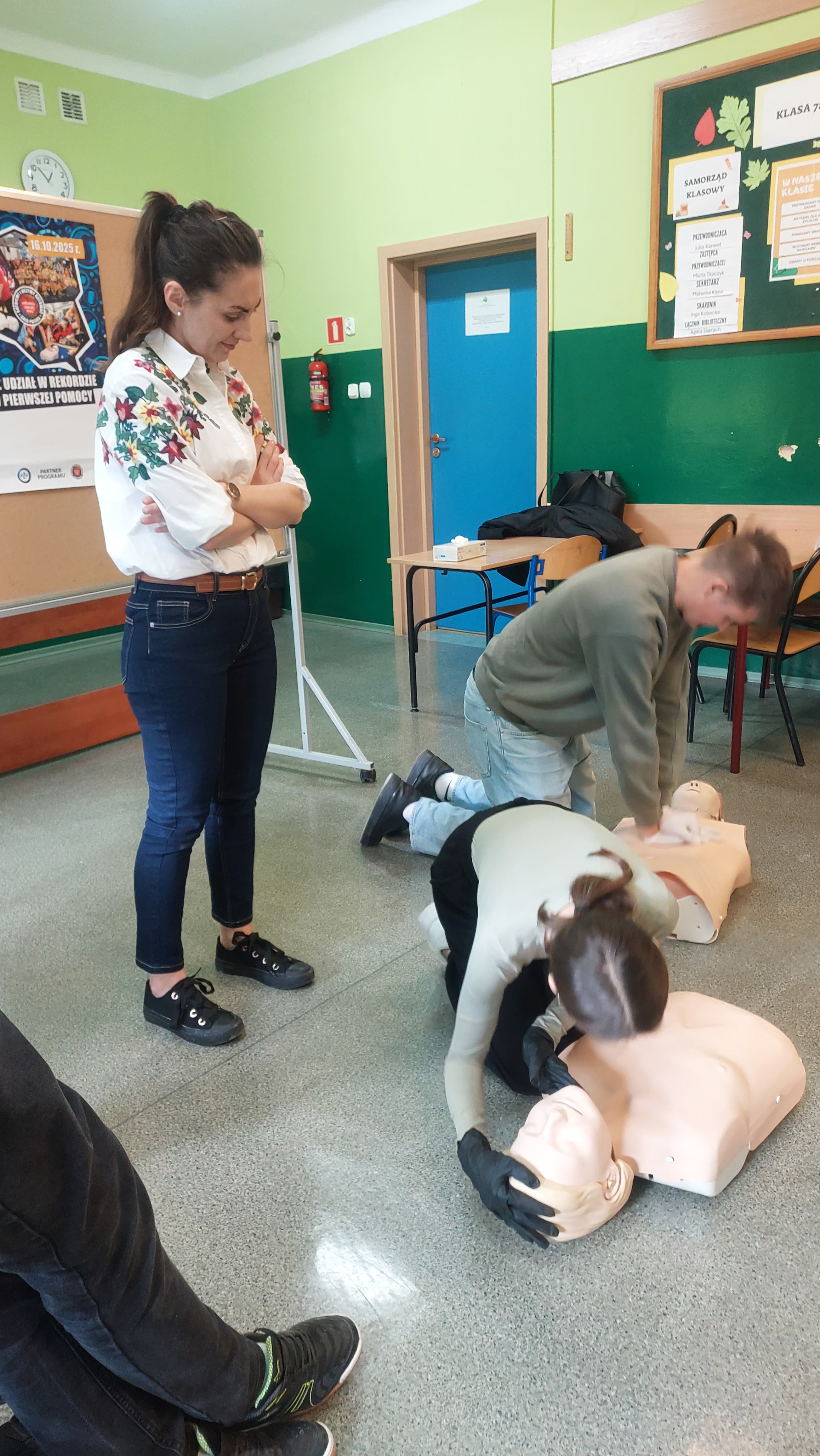 16 października 2025 roku o godz. 12:00 nasza szkoła wzięła udział w ogólnopolskim Biciu Rekordu w Pierwszej Pomocy, organizowanym przez Fundację Wielka Orkiestra Świątecznej Pomocy. W wydarzeniu uczestniczyli uczniowie klasy VIIIb, pod przewodnictwem wychowawcy pani Małgorzata Szczur. Celem akcji było szerzenie wiedzy na temat udzielania pierwszej pomocy, zwłaszcza w przypadku osoby, u której doszło do nagłego zatrzymania krążenia.