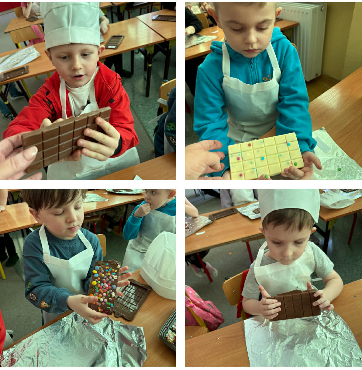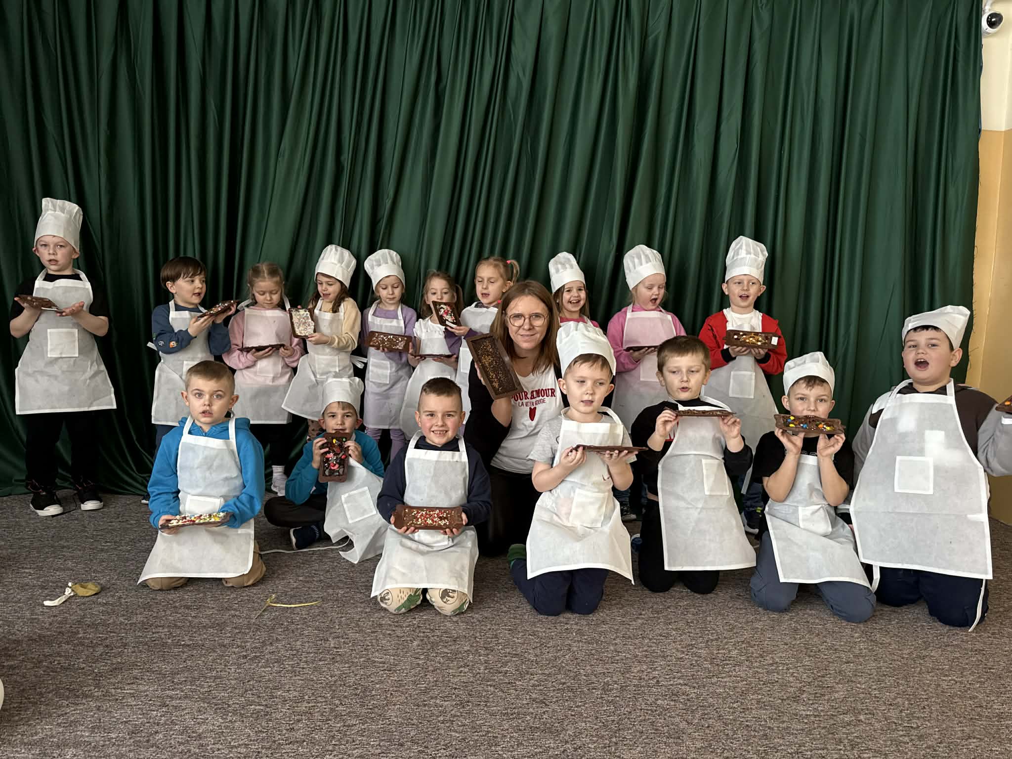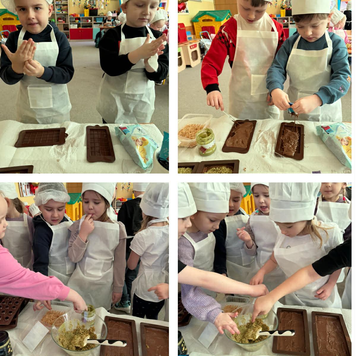 Dzieci z grupy Żabki w niezwykle kreatywny sposób utrwalały literkę „c” – poprzez słodkie warsztaty czekoladowe. Inspiracją do działania była oczywiście czekolada, która rozbudziła ciekawość i wyobraźnię małych odkrywców. Zanim przedszkolaki przystąpiły do pracy, najpierw poszerzyły swoją wiedzę. Dzieci dowiedziały się, jak powstaje czekolada – od ziaren kakaowca aż po gotową, płynną masę, którą wlewa się do foremek. Z zainteresowaniem oglądały prezentację o kakaowcu, sprawdzały skład czekolady kupionej w sklepie oraz przyglądały się, jak powstaje popularna dubajska czekolada. Następnie rozpoczęła się najbardziej wyczekiwana część zajęć. Dzieci z ogromnym zaangażowaniem wlewały płynną czekoladę do specjalnych silikonowych foremek, starannie ją wyrównywały i dekorowały różnorodnymi dodatkami według własnych pomysłów. Każda tabliczka była wyjątkowa i niepowtarzalna. Po intensywnej pracy przyszedł czas na ruch i zabawę. Żabki z radością tańczyły do piosenki „Chocolate”, rozładowując nadmiar energii i świetnie się przy tym bawiąc. Na zakończenie z dumą prezentowały swoje zastygnięte, schłodzone tabliczki czekolady, ciesząc się z efektów własnej pracy. Warsztaty były nie tylko doskonałą okazją do utrwalenia literki „c”, ale także do zdobywania nowej wiedzy, rozwijania samodzielności oraz przeżywania radości ze wspólnego tworzenia. To był dzień pełen słodkich emocji i czekoladowych sukcesów!