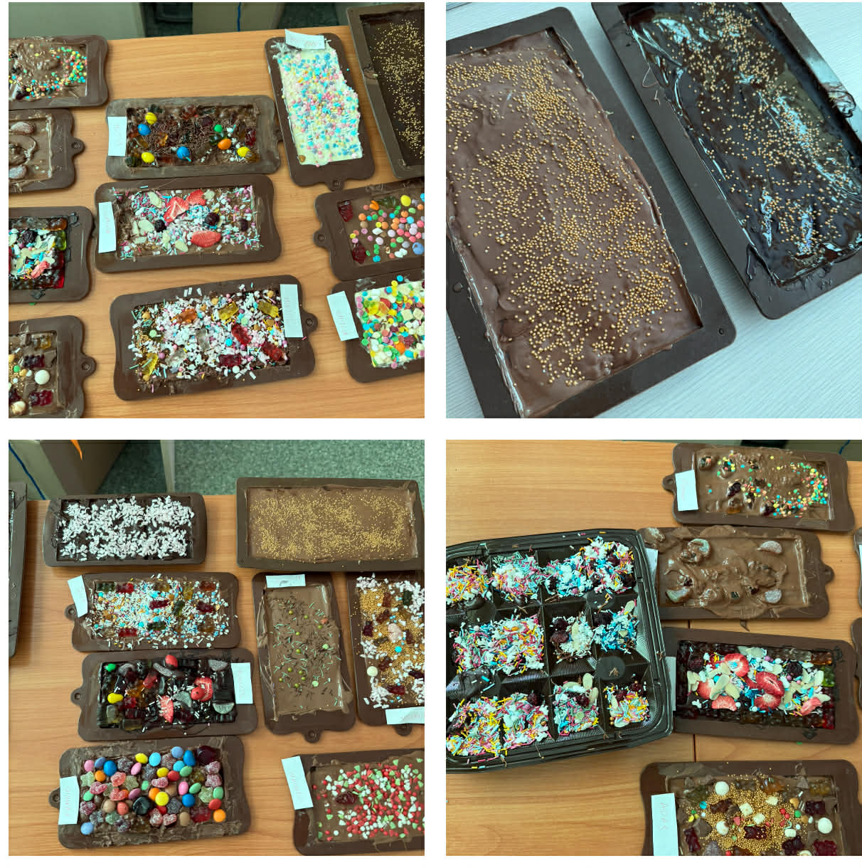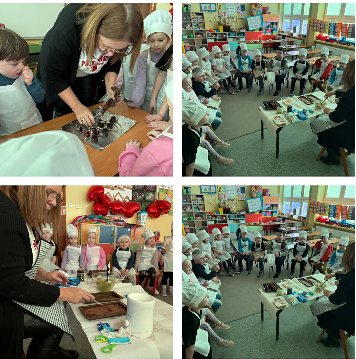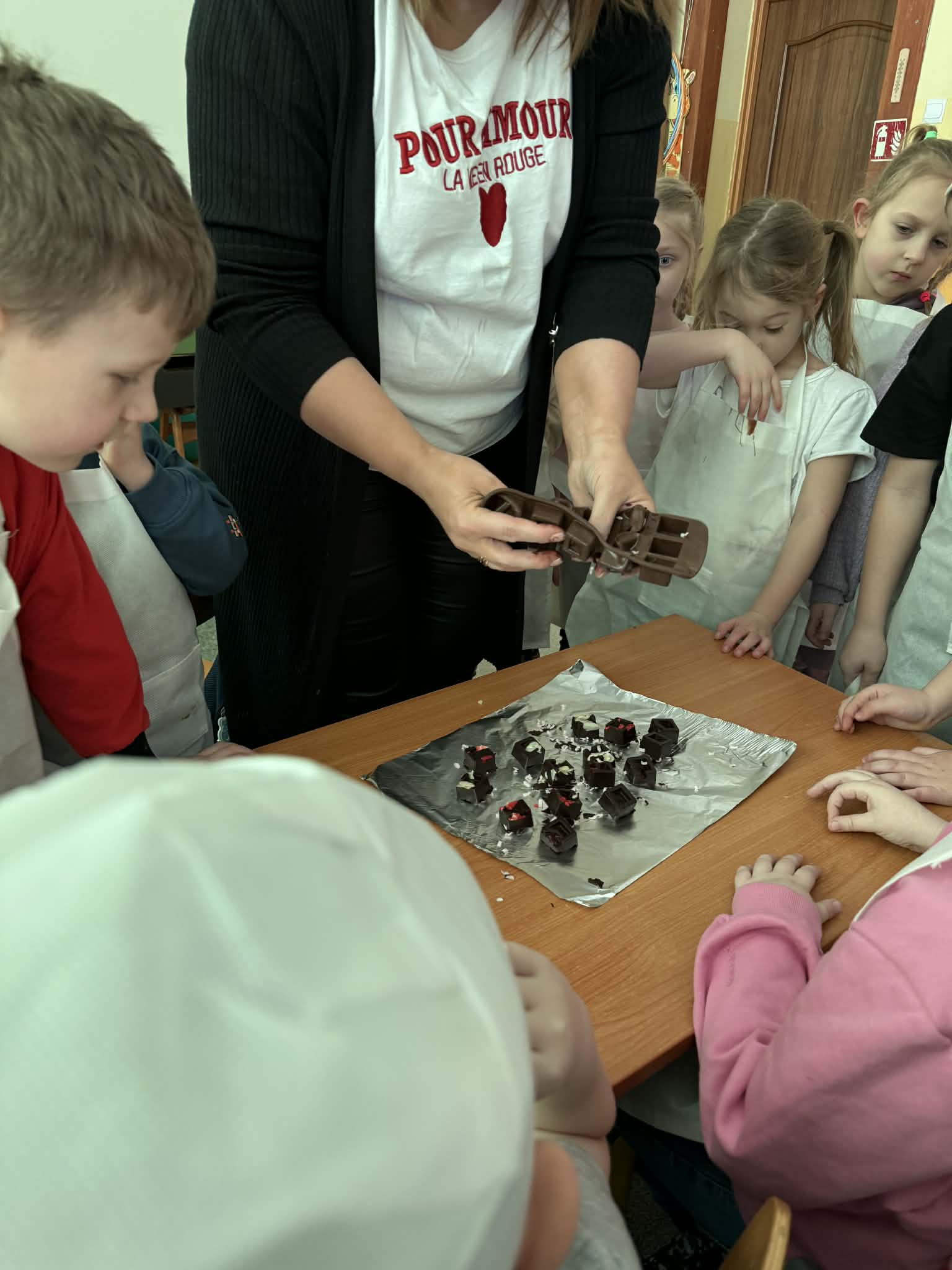 Dzieci z grupy Żabki w niezwykle kreatywny sposób utrwalały literkę „c” – poprzez słodkie warsztaty czekoladowe. Inspiracją do działania była oczywiście czekolada, która rozbudziła ciekawość i wyobraźnię małych odkrywców. Zanim przedszkolaki przystąpiły do pracy, najpierw poszerzyły swoją wiedzę. Dzieci dowiedziały się, jak powstaje czekolada – od ziaren kakaowca aż po gotową, płynną masę, którą wlewa się do foremek. Z zainteresowaniem oglądały prezentację o kakaowcu, sprawdzały skład czekolady kupionej w sklepie oraz przyglądały się, jak powstaje popularna dubajska czekolada. Następnie rozpoczęła się najbardziej wyczekiwana część zajęć. Dzieci z ogromnym zaangażowaniem wlewały płynną czekoladę do specjalnych silikonowych foremek, starannie ją wyrównywały i dekorowały różnorodnymi dodatkami według własnych pomysłów. Każda tabliczka była wyjątkowa i niepowtarzalna. Po intensywnej pracy przyszedł czas na ruch i zabawę. Żabki z radością tańczyły do piosenki „Chocolate”, rozładowując nadmiar energii i świetnie się przy tym bawiąc. Na zakończenie z dumą prezentowały swoje zastygnięte, schłodzone tabliczki czekolady, ciesząc się z efektów własnej pracy. Warsztaty były nie tylko doskonałą okazją do utrwalenia literki „c”, ale także do zdobywania nowej wiedzy, rozwijania samodzielności oraz przeżywania radości ze wspólnego tworzenia. To był dzień pełen słodkich emocji i czekoladowych sukcesów!