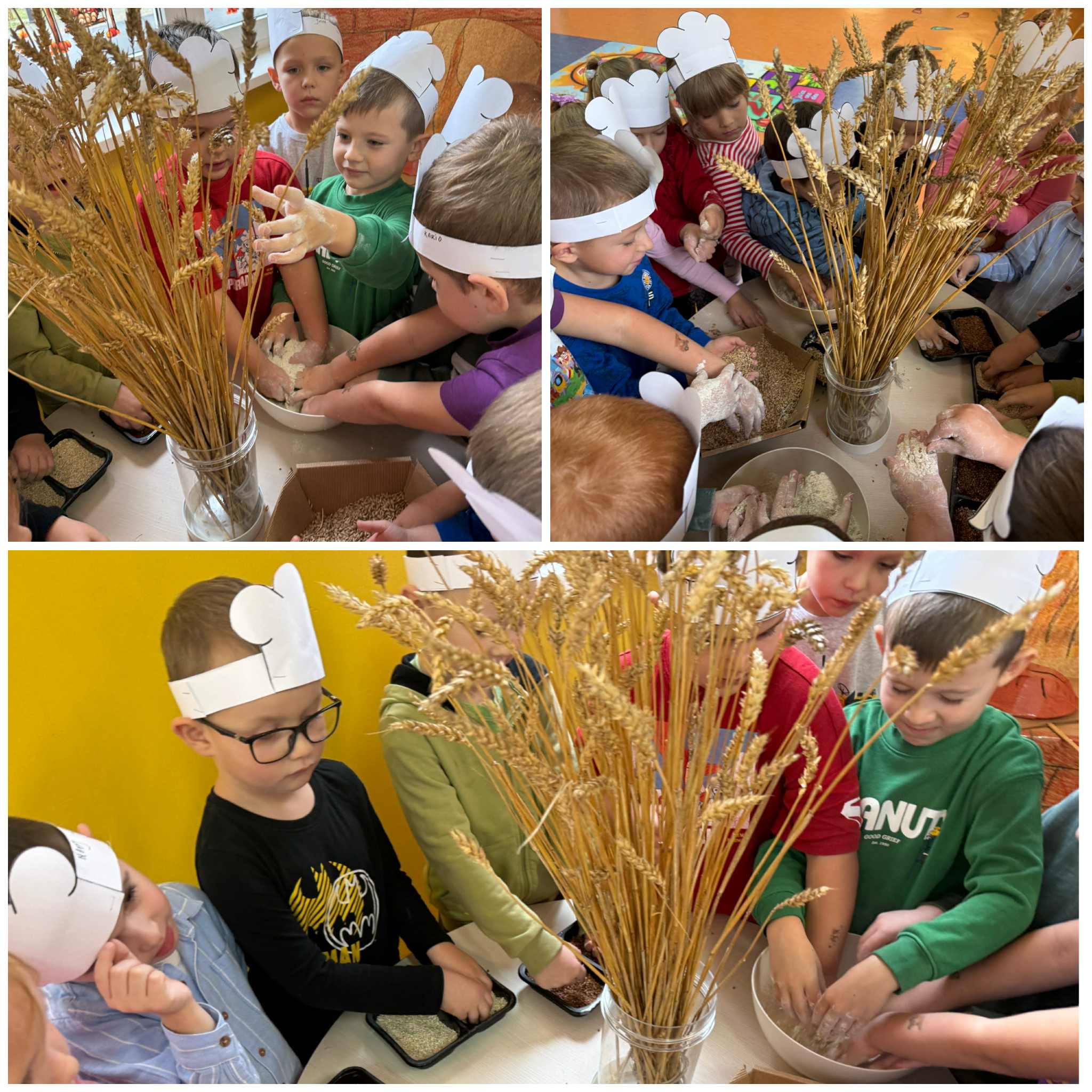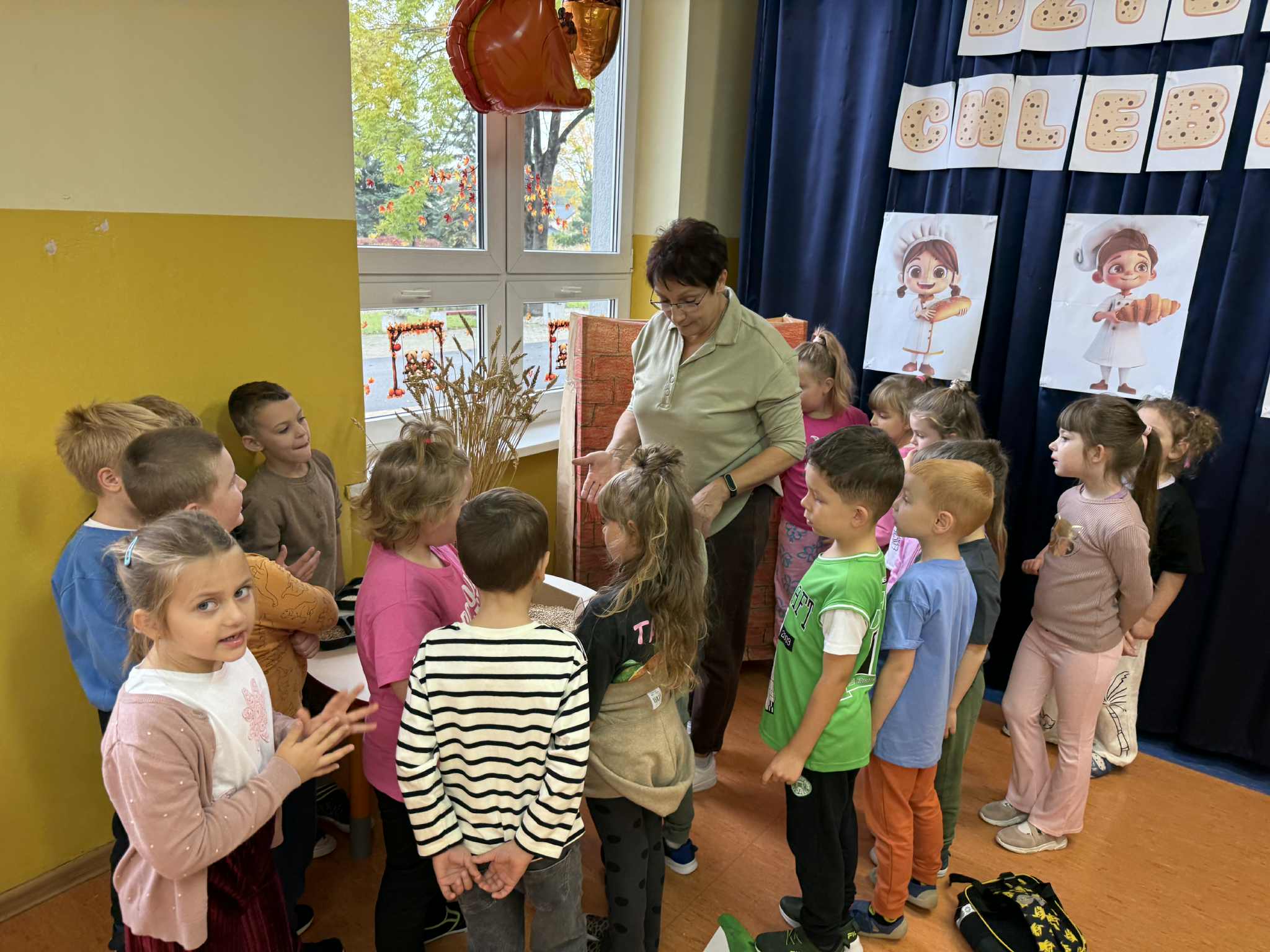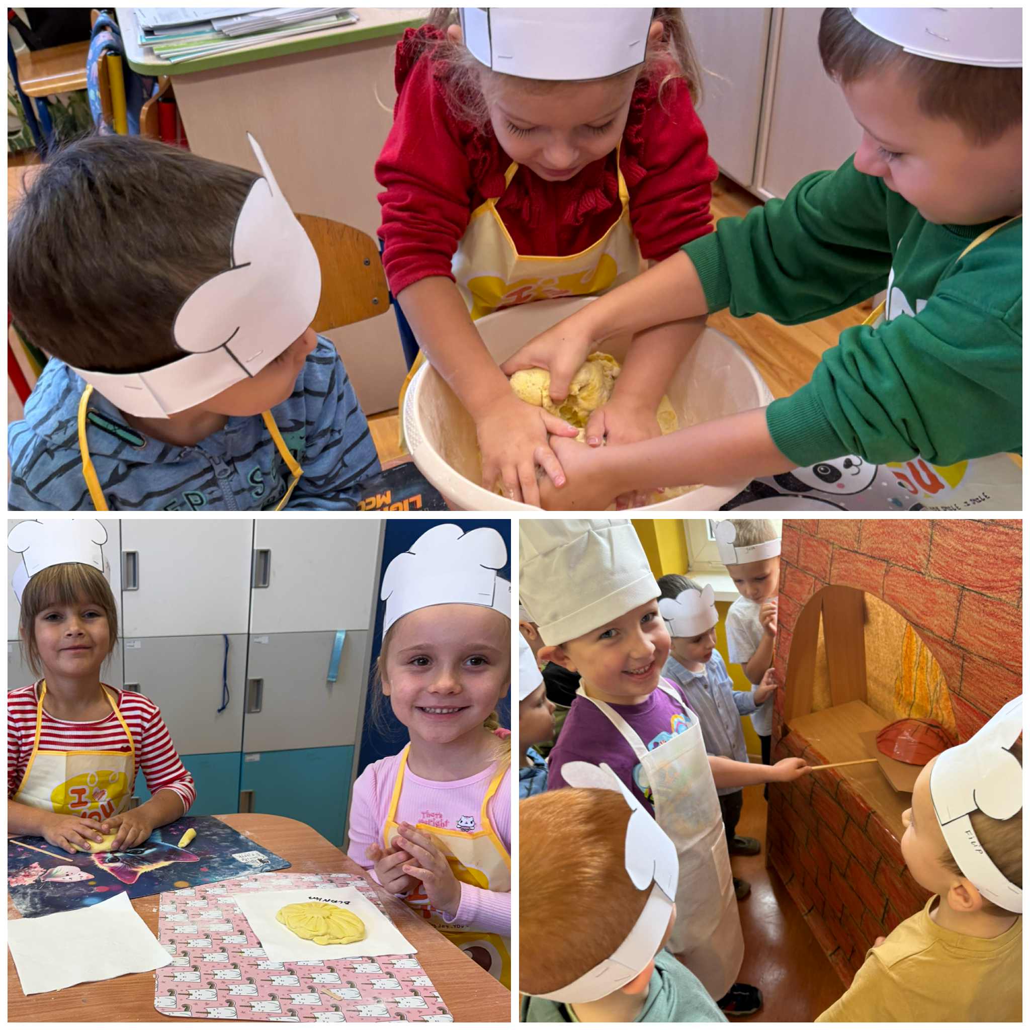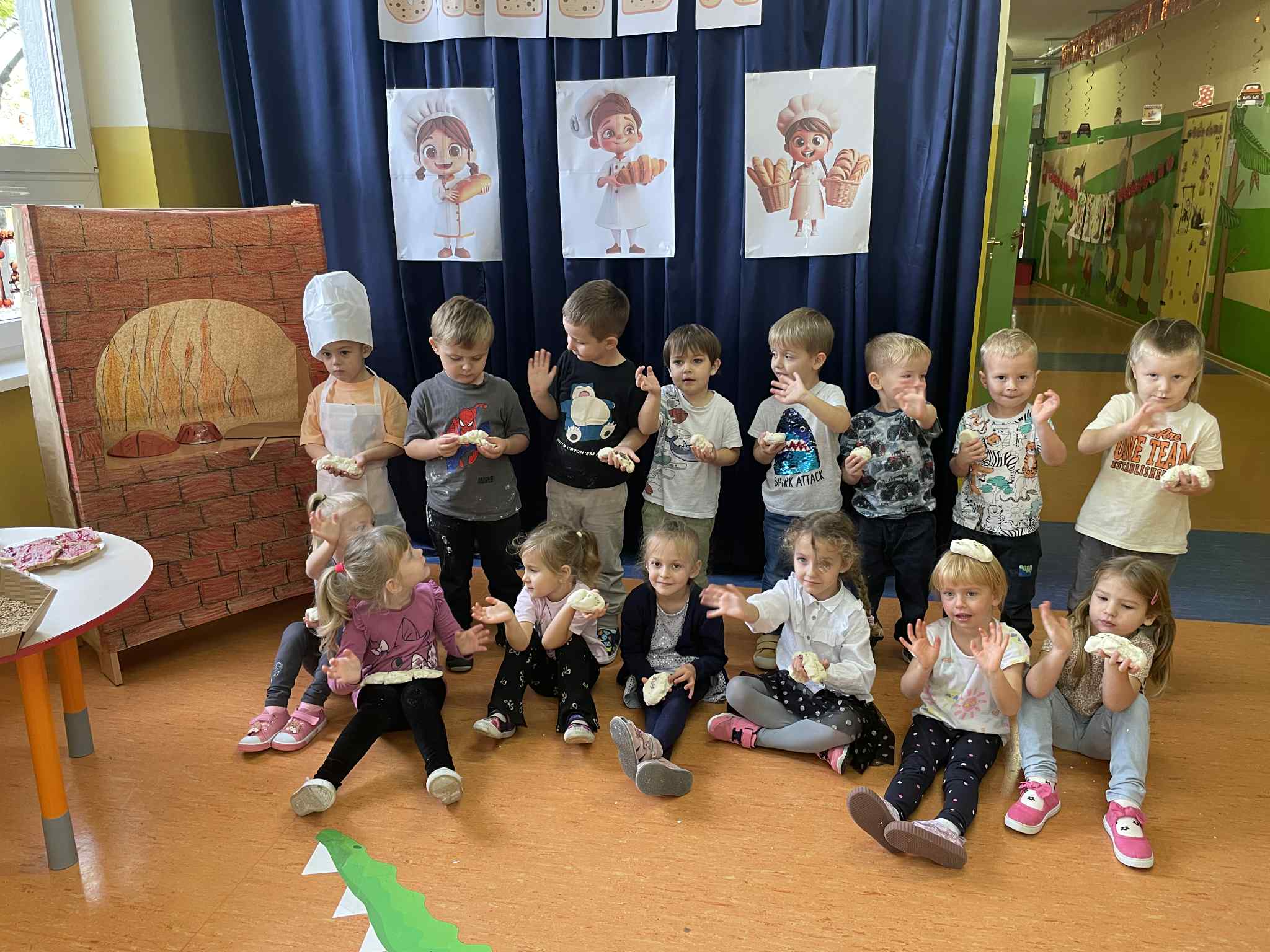 Przez dwa dni tj. 16 i 17 października nasze przedszkole zamieniło się w prawdziwą piekarnię! Dzieci wcieliły się w rolę piekarzy – z zapałem ugniatały, formowały i wyrabiały masę solną, z której powstały bochenki, rogale, bagietki i bułeczki, a następnie wszystko powędrowało do „piekarnianego pieca”. Każdy bochenek był wyjątkowy – tak jak jego mały twórca. Nie zabrakło również zabaw sensorycznych– dzieci mogły dotknąć kłosów zbóż, obejrzeć ziarenka, porównać różne rodzaje mąki i… umączyć sobie rączki po same łokcie! Niektórzy stwierdzili, że „to chyba magiczny pył, który zamienia się w kanapkę”. Przedszkolaki poznały zawód piekarza, jego codzienną pracę i tajniki wypieku pieczywa. Na zakończenie wszyscy bawili się w znaną zabawę „Mało nas do pieczenia chleba”, przy której nie zabrakło śmiechu, tańca i wspólnego śpiewania.
