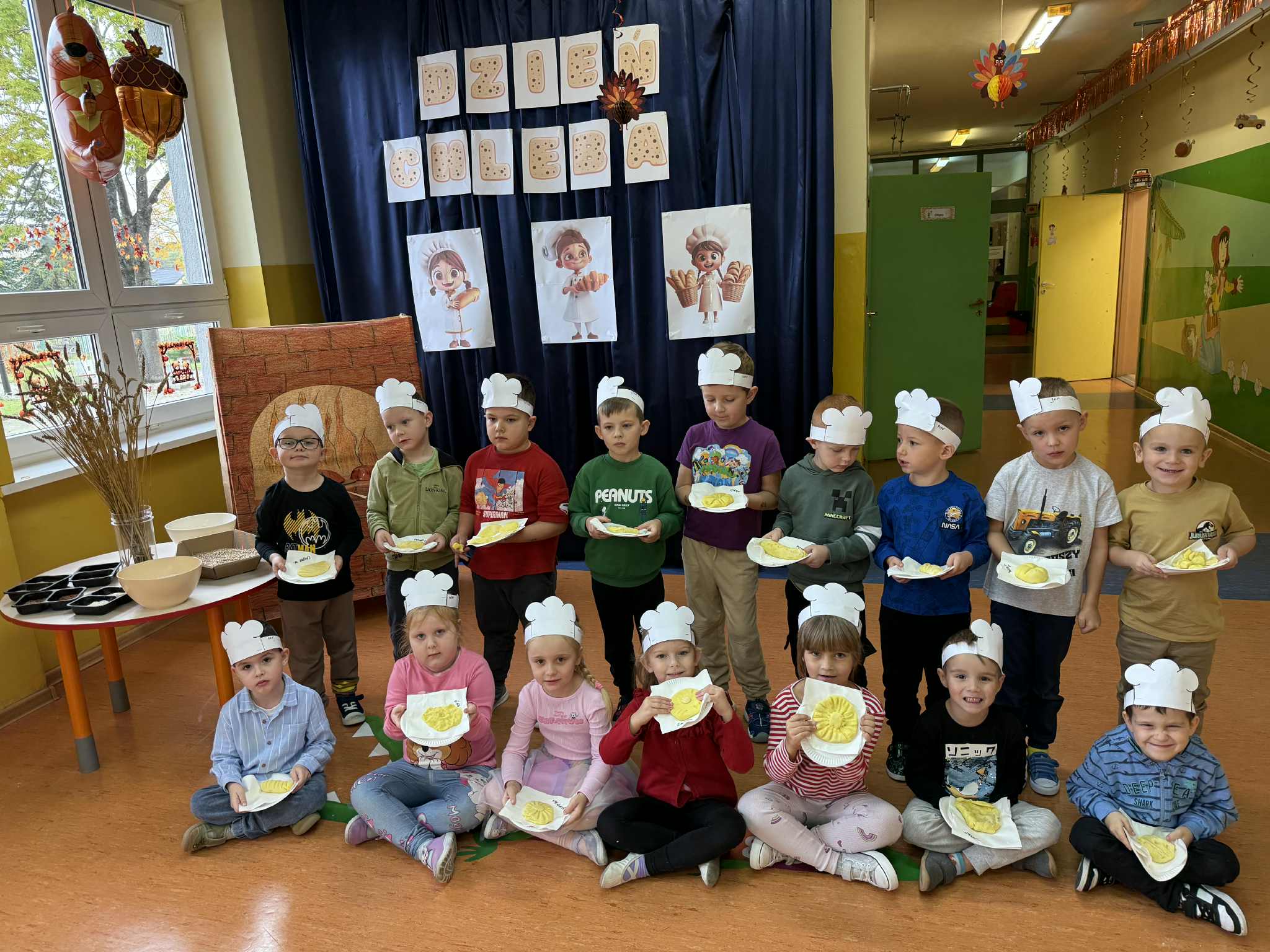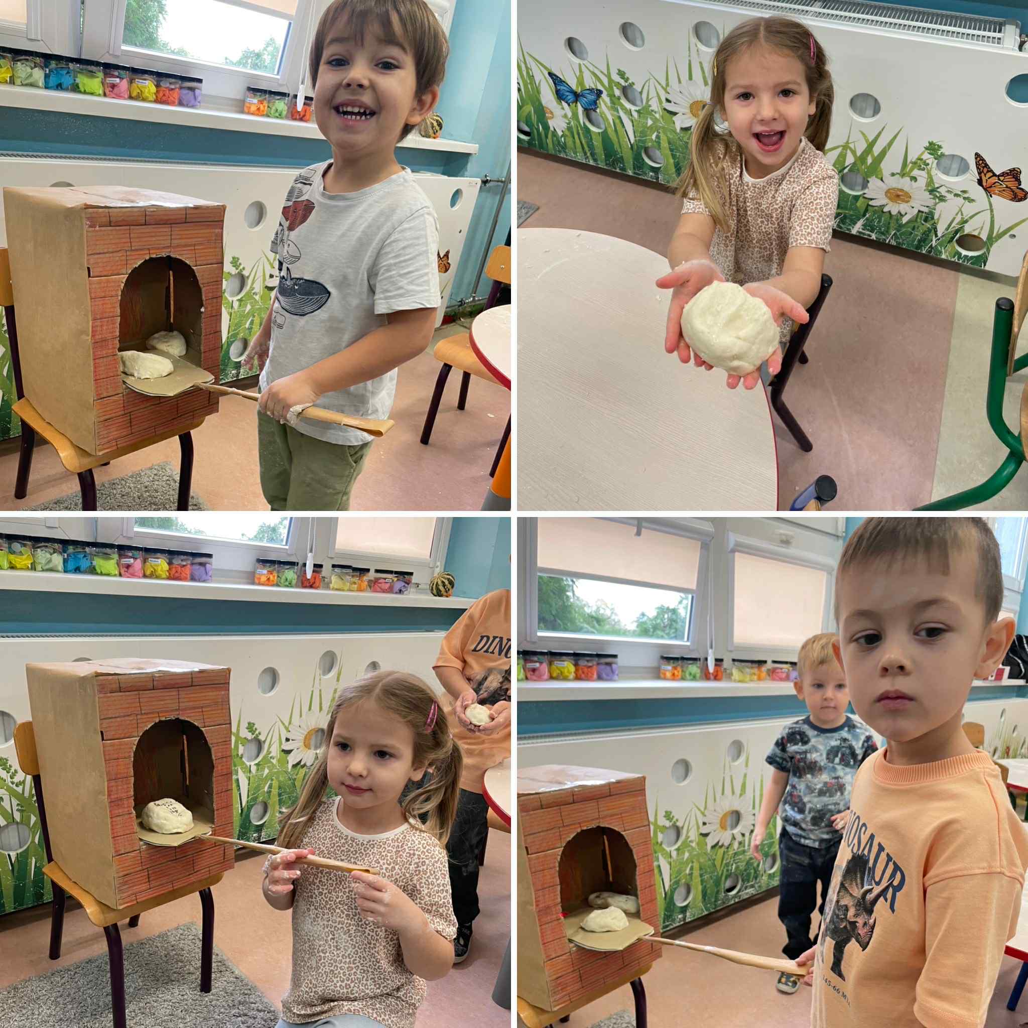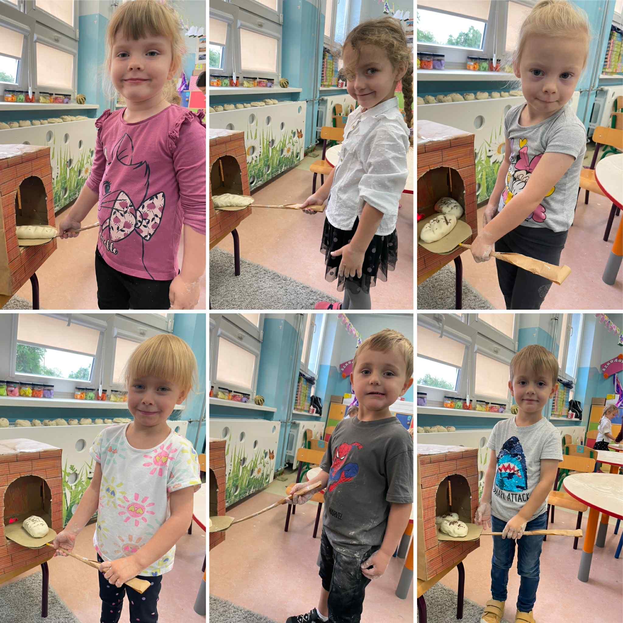 Przez dwa dni tj. 16 i 17 października nasze przedszkole zamieniło się w prawdziwą piekarnię! Dzieci wcieliły się w rolę piekarzy – z zapałem ugniatały, formowały i wyrabiały masę solną, z której powstały bochenki, rogale, bagietki i bułeczki, a następnie wszystko powędrowało do „piekarnianego pieca”. Każdy bochenek był wyjątkowy – tak jak jego mały twórca. Nie zabrakło również zabaw sensorycznych– dzieci mogły dotknąć kłosów zbóż, obejrzeć ziarenka, porównać różne rodzaje mąki i… umączyć sobie rączki po same łokcie! Niektórzy stwierdzili, że „to chyba magiczny pył, który zamienia się w kanapkę”. Przedszkolaki poznały zawód piekarza, jego codzienną pracę i tajniki wypieku pieczywa. Na zakończenie wszyscy bawili się w znaną zabawę „Mało nas do pieczenia chleba”, przy której nie zabrakło śmiechu, tańca i wspólnego śpiewania.