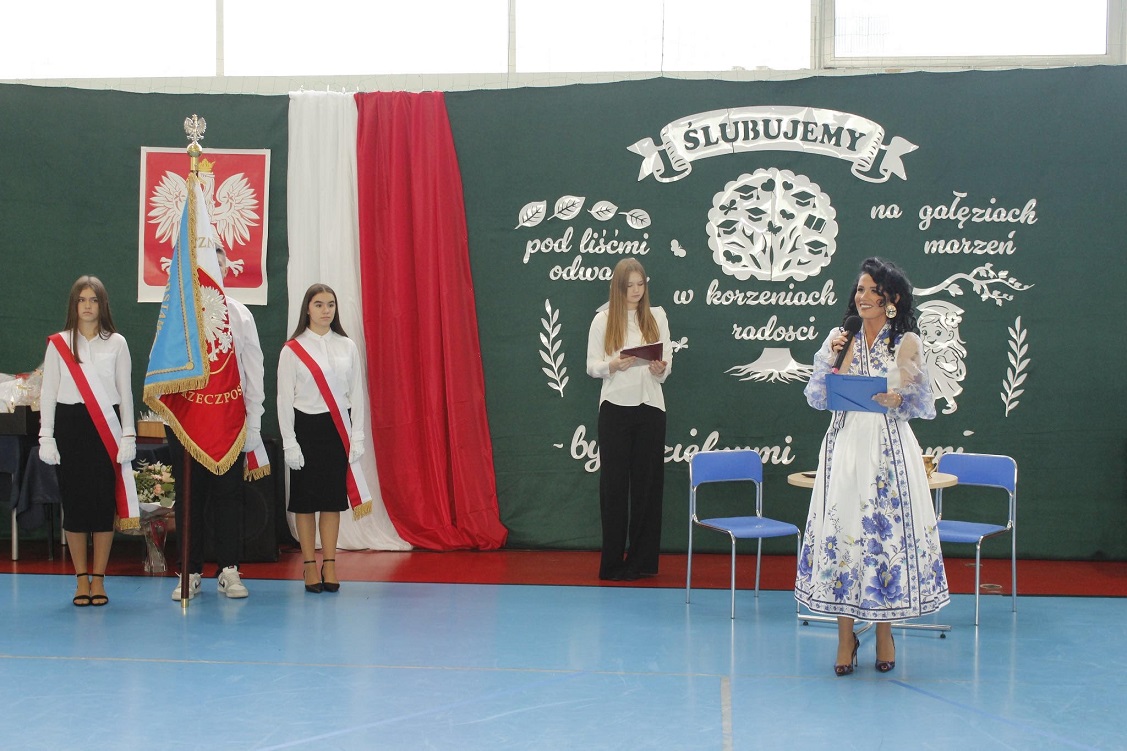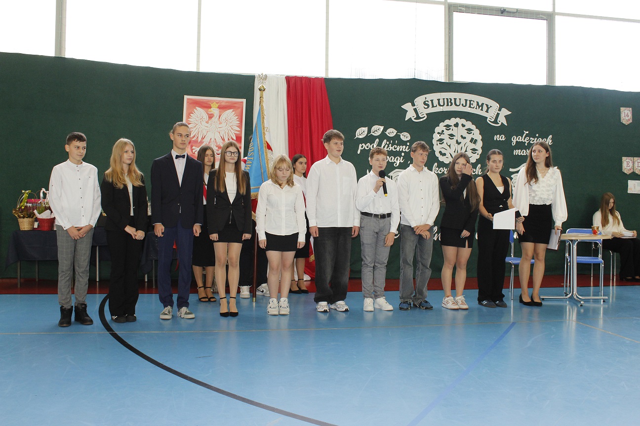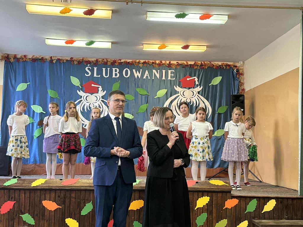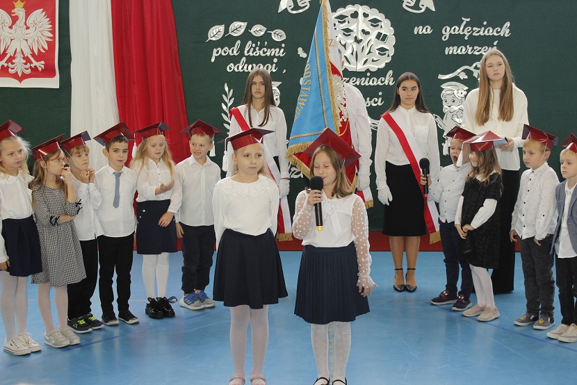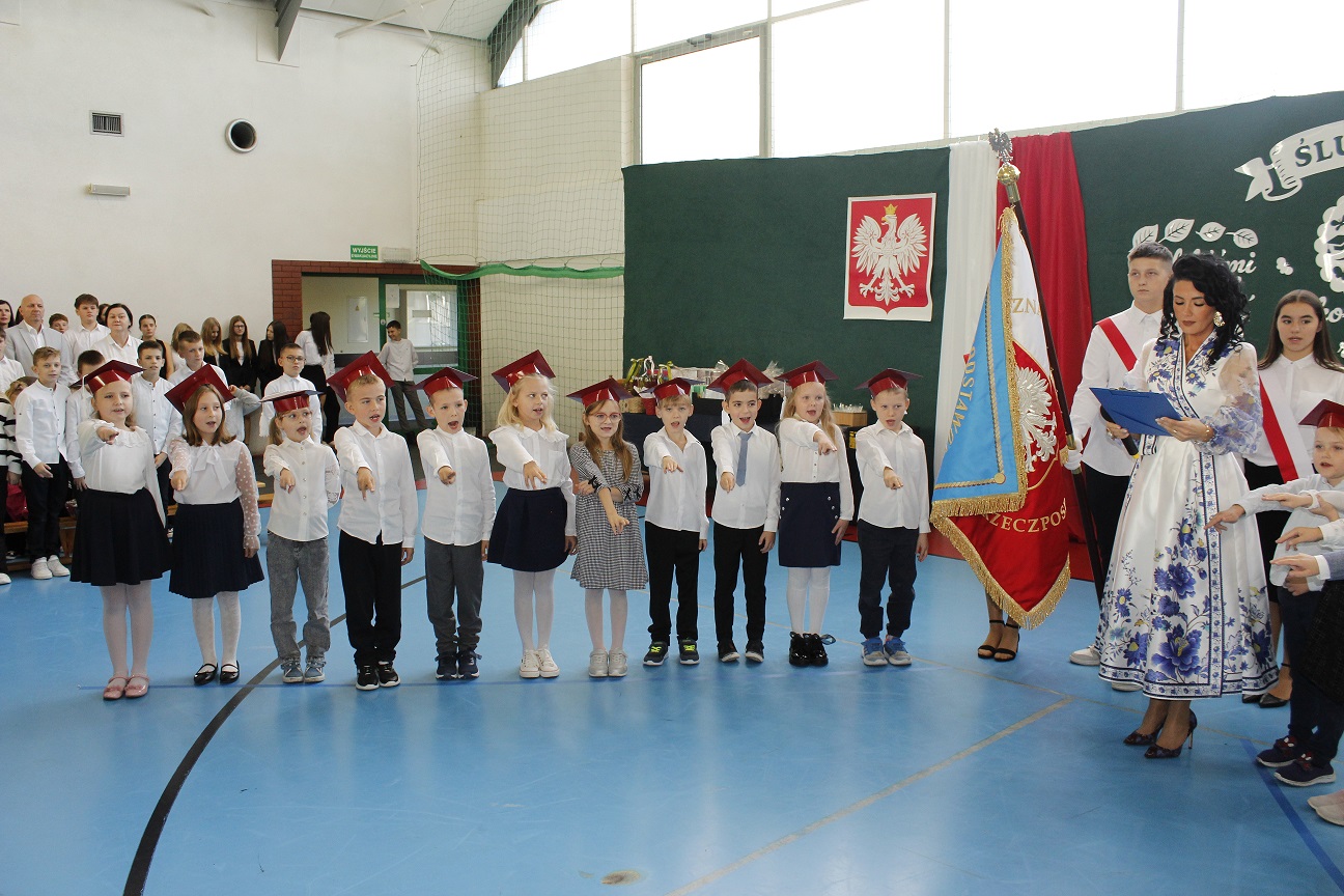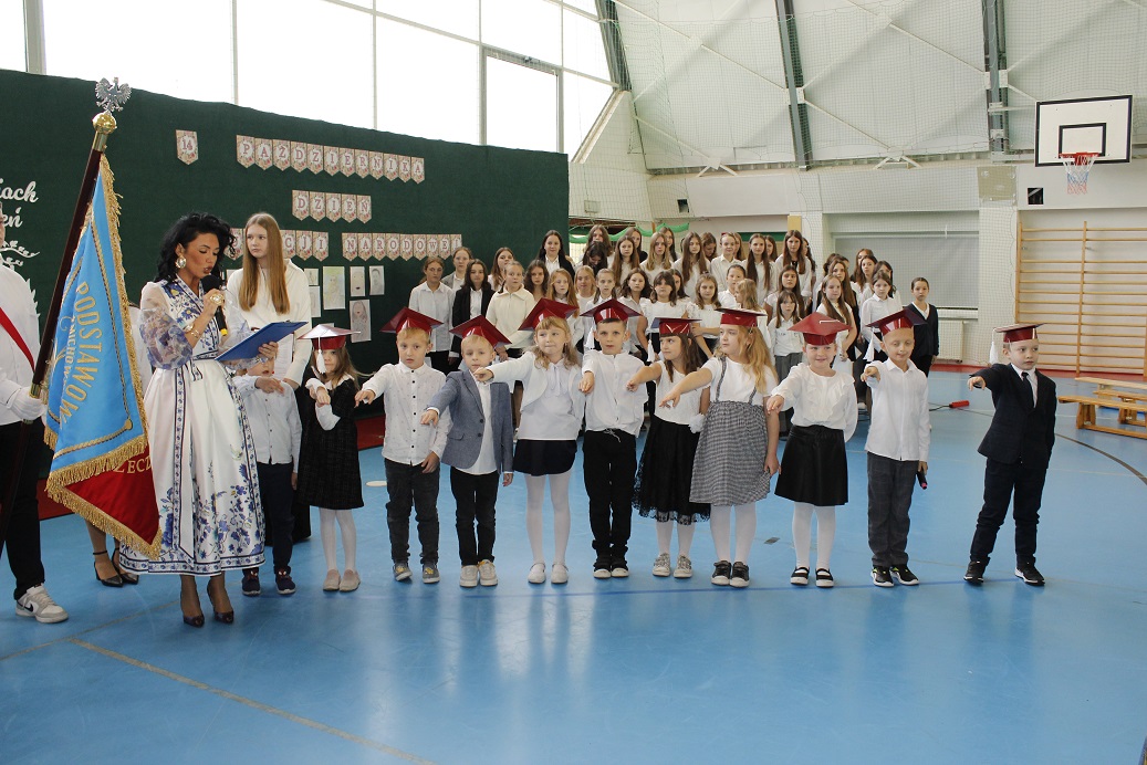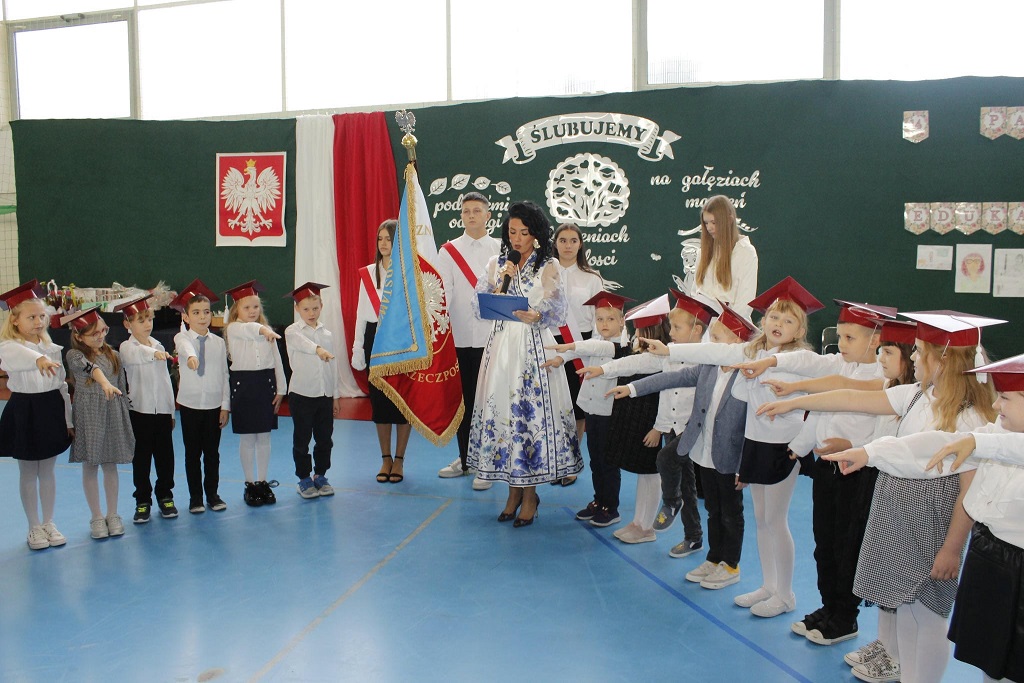 Tego dnia swoje święto mieli uczniowie klasy pierwszej, którzy wspaniale przygotowali się to tego niezwykłego wydarzenia – Ślubowania. Na początku Pani Dyrektor Agata Ewa Ostalska skierowała do pierwszoklasistów wspaniałe słowa, mówiące o tym, że tego dnia otwiera się przed nimi nowy fascynujący świat wiedzy i nauki. Następnie wszystkim uczniom życzyła tego, aby to była wspaniała przygoda, pełna radości, ciekawości i nowych odkryć. Po miłych słowach uczniowie przystąpili do ślubowania i stali się pełnoprawnymi członkami naszej szkolnej społeczności.