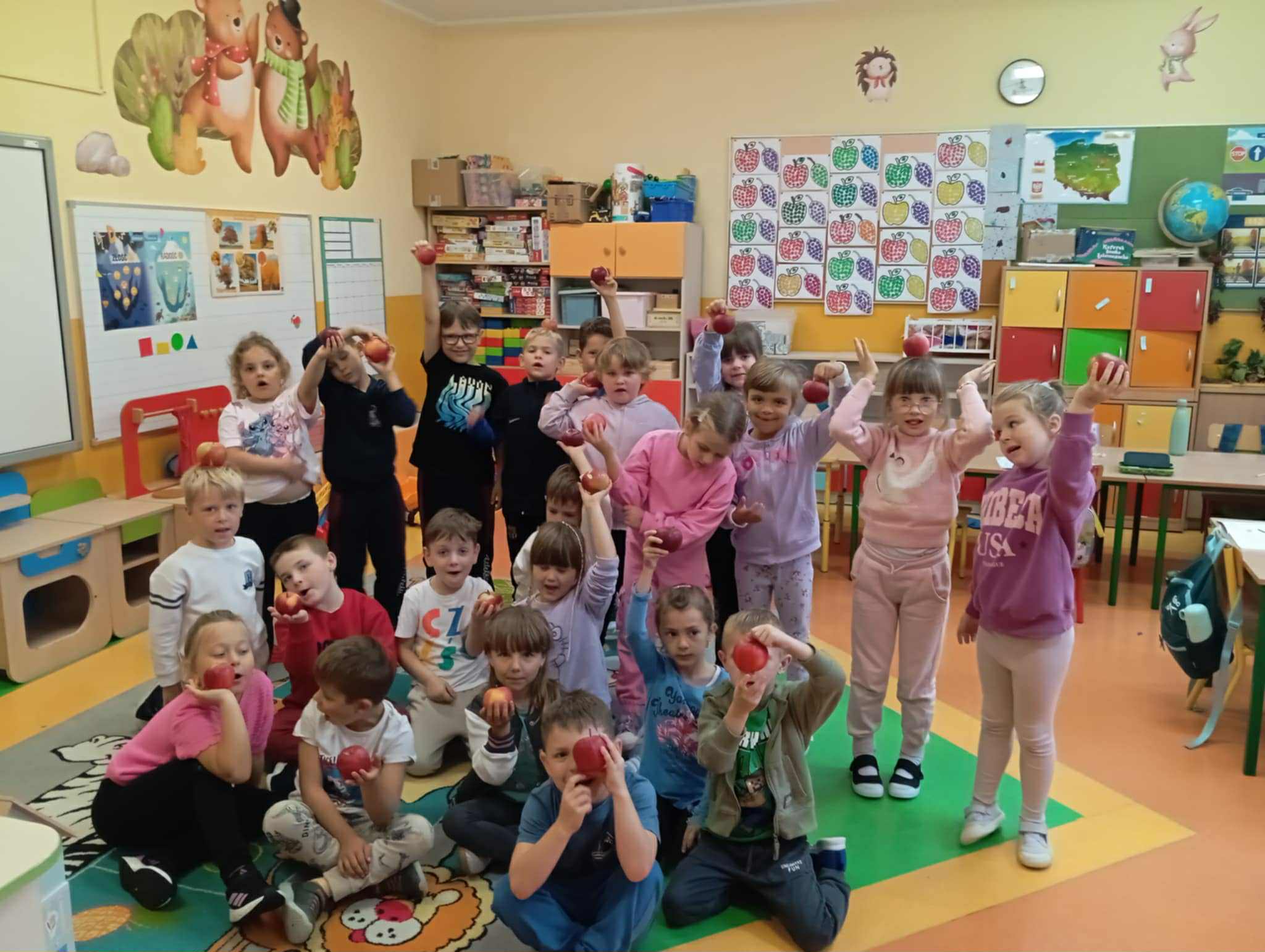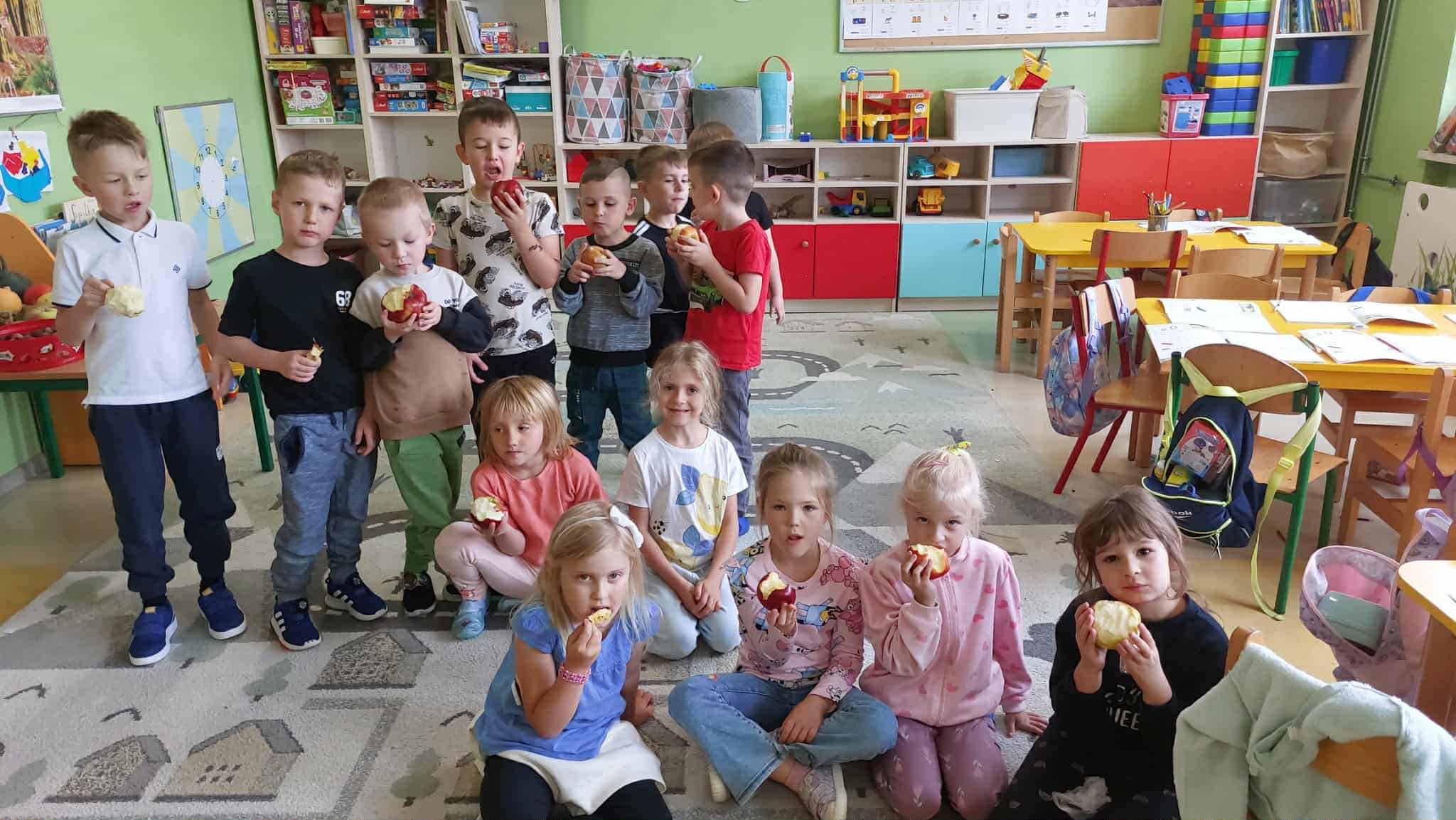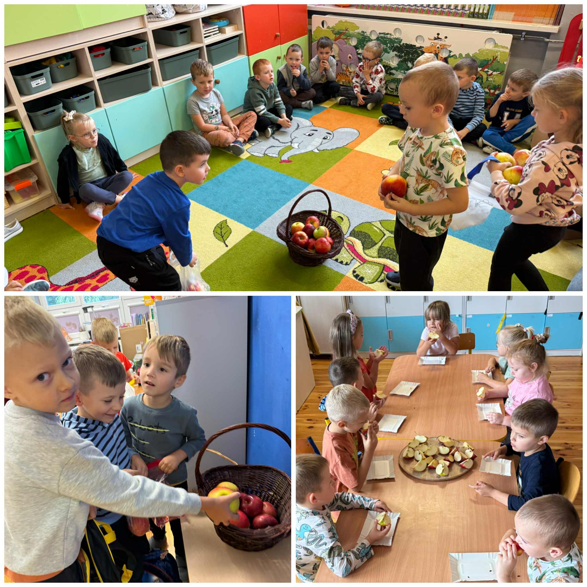 W minionym tygodniu w każdej grupie przedszkolnej odbył się Dzień Jabłka. Dzieci poznały wartości odżywcze najbardziej popularnego owocu jesieni – jabłka oraz dowiedziały się, jak ważną rolę odgrywają owoce w codziennej diecie. Przedszkolaki poznawały jabłka wszystkimi zmysłami – wąchały, dotykały, smakowały oraz porównywały ich wielkość i wygląd. W ramach zajęć dzieci wykonywały prace plastyczne z motywem jabłka, uczestniczyły w zabawach matematycznych i ruchowych, w których główną rolę odgrywał ten pyszny owoc. Najbardziej smakowitym punktem dnia była wspólna degustacja różnych odmian jabłek.