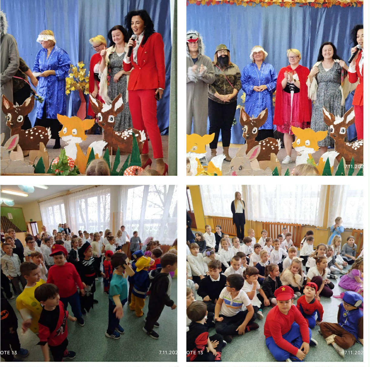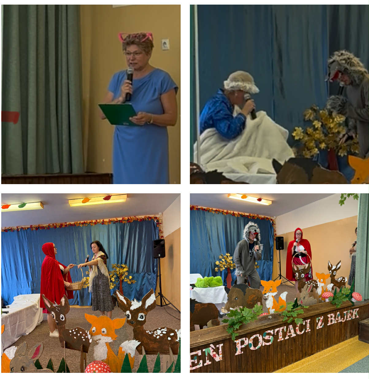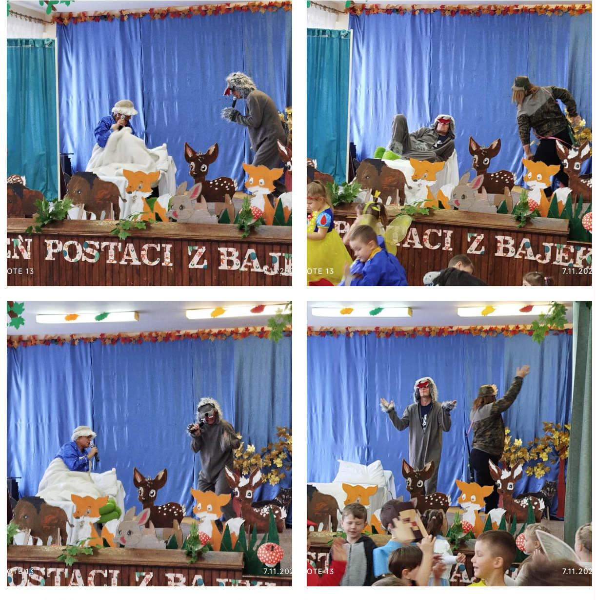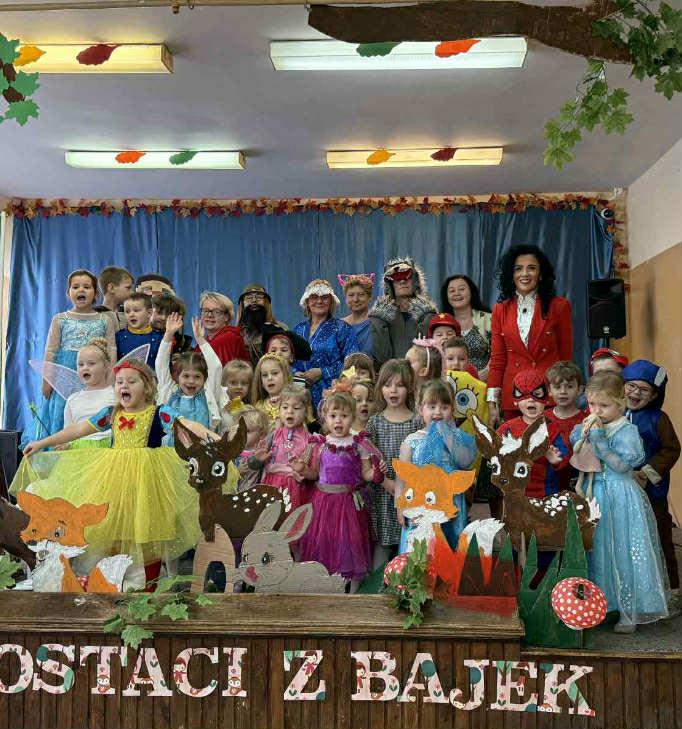 7 listopada obchodziliśmy w naszym przedszkolu Dzień Postaci z Bajek – wyjątkowy, pełen radości i fantazji dzień. Wszystkie dzieci przyszły ubrane w piękne, bajkowe stroje – aż trudno było je rozpoznać! Uroczystość rozpoczęła Pani Kierownik Bernadetta Grot, która wprowadziła wszystkich w magiczny nastrój słowami: „Dzień Postaci z Bajek to dzień wyjątkowy. To wspaniałe, że już od najmłodszych lat uczymy się poprzez bajki różnych zachowań, emocji i wartości. Bajki możemy czytać, oglądać w telewizji, ale najbardziej poruszają nas te pokazywane na żywo – prawdziwa, żywa sztuka. I właśnie taką sztukę zobaczycie dzisiaj. Usiądźcie wygodnie, otwórzcie serca i posłuchajcie, kochani…” I tak rozpoczęła się totalna improwizacja – inscenizacja bajki o Czerwonym Kapturku. Usłyszeliśmy głos mamy wołającej Kapturka, który posłusznie ruszył leśną ścieżką do domu babci. Nagle zza krzaków wyskoczył wilk i przestraszył bohaterkę. Jak wiemy, wilk miał niecny plan – pobiegł do domu babci, połknął ją, a potem również Kapturka. Na szczęście pojawił się leśniczy ze strzelbą, który obudził wilka i… wraz z dziećmi zaprosił go do tańca! Wilk zaczął skakać, dostał czkawki, a z jego brzucha wyskoczyły całe i zdrowe– babcia oraz Czerwony Kapturek. Podczas występu nie zabrakło humoru, dialogów i wspólnej zabawy – dzieci aktywnie uczestniczyły w przedstawieniu, podpowiadając aktorom, co powinni zrobić w danej sytuacji. Po inscenizacji Pani Dyrektor przygotowała zagadki i pytania dotyczące bajki, na które dzieci odpowiedziały z uśmiechem. Podziękowała również nauczycielom za udział w bajkowym występie oraz Pani Kierownik za role narratora. Na zakończenie wszyscy mali bajkowi bohaterowie otrzymali dyplomy Super Znawcy Bajek i wraz z Wilkiem i Czerwonym Kapturkiem bawili się do bajkowych piosenek z repertuaru dziecięcego. To był dzień pełen śmiechu, emocji i wspólnego przeżywania bajkowych przygód – prawdziwa podróż do świata, w którym wszystko jest możliwe!