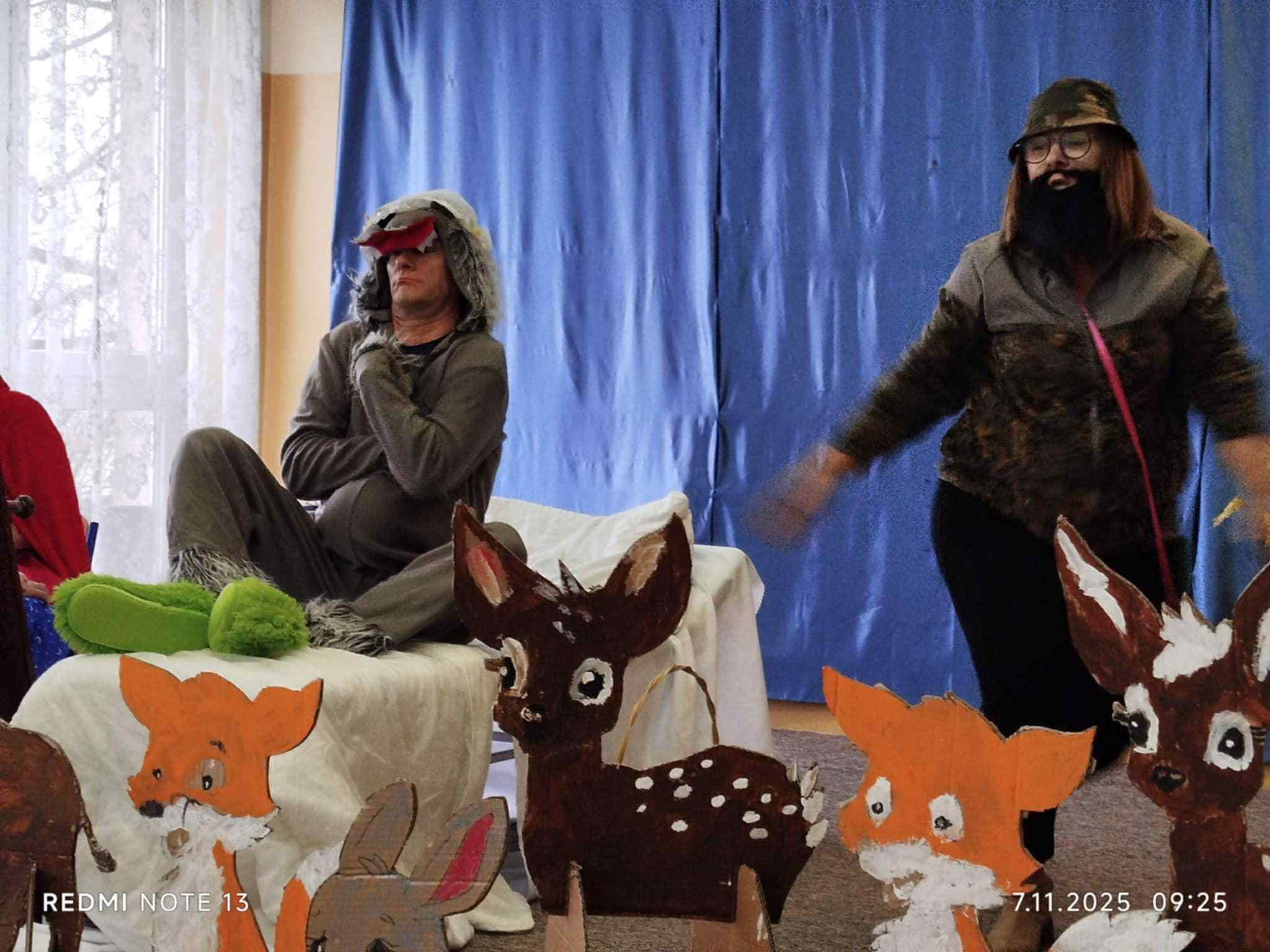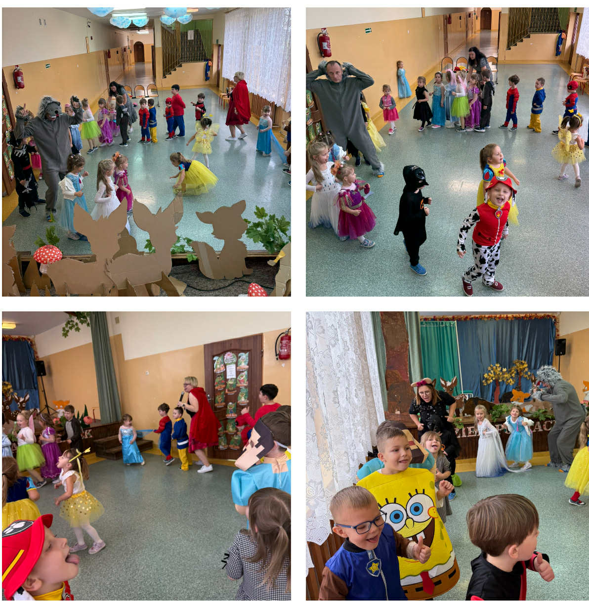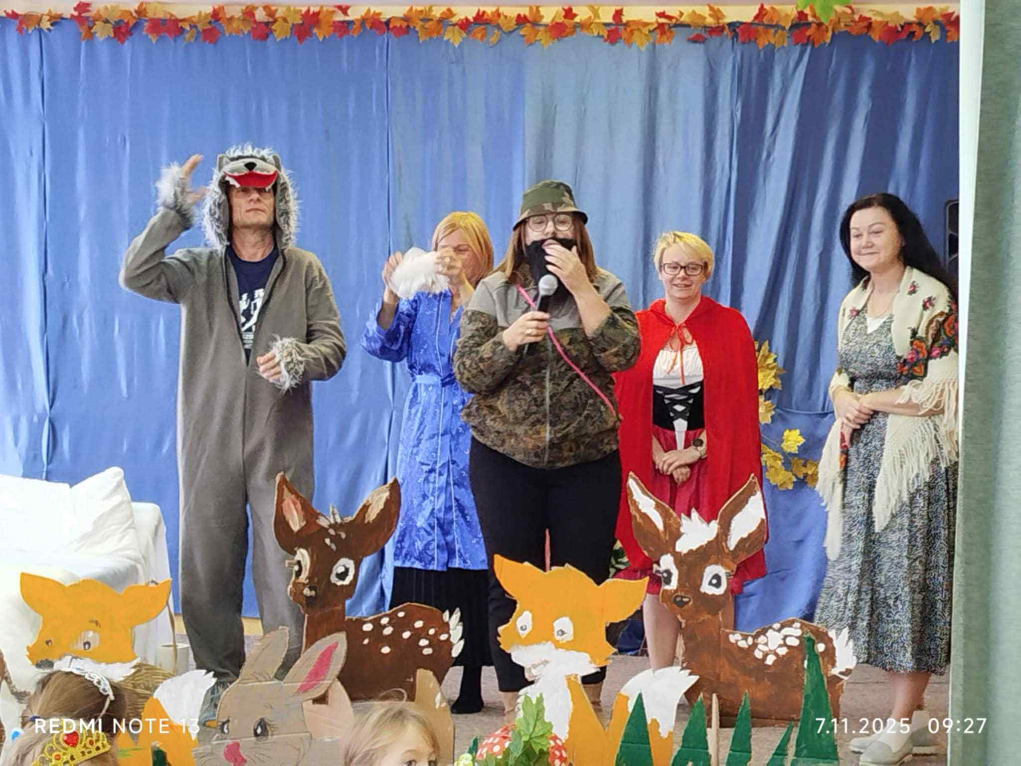 7 listopada obchodziliśmy w naszym przedszkolu Dzień Postaci z Bajek – wyjątkowy, pełen radości i fantazji dzień. Wszystkie dzieci przyszły ubrane w piękne, bajkowe stroje – aż trudno było je rozpoznać! Uroczystość rozpoczęła Pani Kierownik Bernadetta Grot, która wprowadziła wszystkich w magiczny nastrój słowami: „Dzień Postaci z Bajek to dzień wyjątkowy. To wspaniałe, że już od najmłodszych lat uczymy się poprzez bajki różnych zachowań, emocji i wartości. Bajki możemy czytać, oglądać w telewizji, ale najbardziej poruszają nas te pokazywane na żywo – prawdziwa, żywa sztuka. I właśnie taką sztukę zobaczycie dzisiaj. Usiądźcie wygodnie, otwórzcie serca i posłuchajcie, kochani…” I tak rozpoczęła się totalna improwizacja – inscenizacja bajki o Czerwonym Kapturku. Usłyszeliśmy głos mamy wołającej Kapturka, który posłusznie ruszył leśną ścieżką do domu babci. Nagle zza krzaków wyskoczył wilk i przestraszył bohaterkę. Jak wiemy, wilk miał niecny plan – pobiegł do domu babci, połknął ją, a potem również Kapturka. Na szczęście pojawił się leśniczy ze strzelbą, który obudził wilka i… wraz z dziećmi zaprosił go do tańca! Wilk zaczął skakać, dostał czkawki, a z jego brzucha wyskoczyły całe i zdrowe– babcia oraz Czerwony Kapturek. Podczas występu nie zabrakło humoru, dialogów i wspólnej zabawy – dzieci aktywnie uczestniczyły w przedstawieniu, podpowiadając aktorom, co powinni zrobić w danej sytuacji. Po inscenizacji Pani Dyrektor przygotowała zagadki i pytania dotyczące bajki, na które dzieci odpowiedziały z uśmiechem. Podziękowała również nauczycielom za udział w bajkowym występie oraz Pani Kierownik za role narratora. Na zakończenie wszyscy mali bajkowi bohaterowie otrzymali dyplomy Super Znawcy Bajek i wraz z Wilkiem i Czerwonym Kapturkiem bawili się do bajkowych piosenek z repertuaru dziecięcego. To był dzień pełen śmiechu, emocji i wspólnego przeżywania bajkowych przygód – prawdziwa podróż do świata, w którym wszystko jest możliwe!