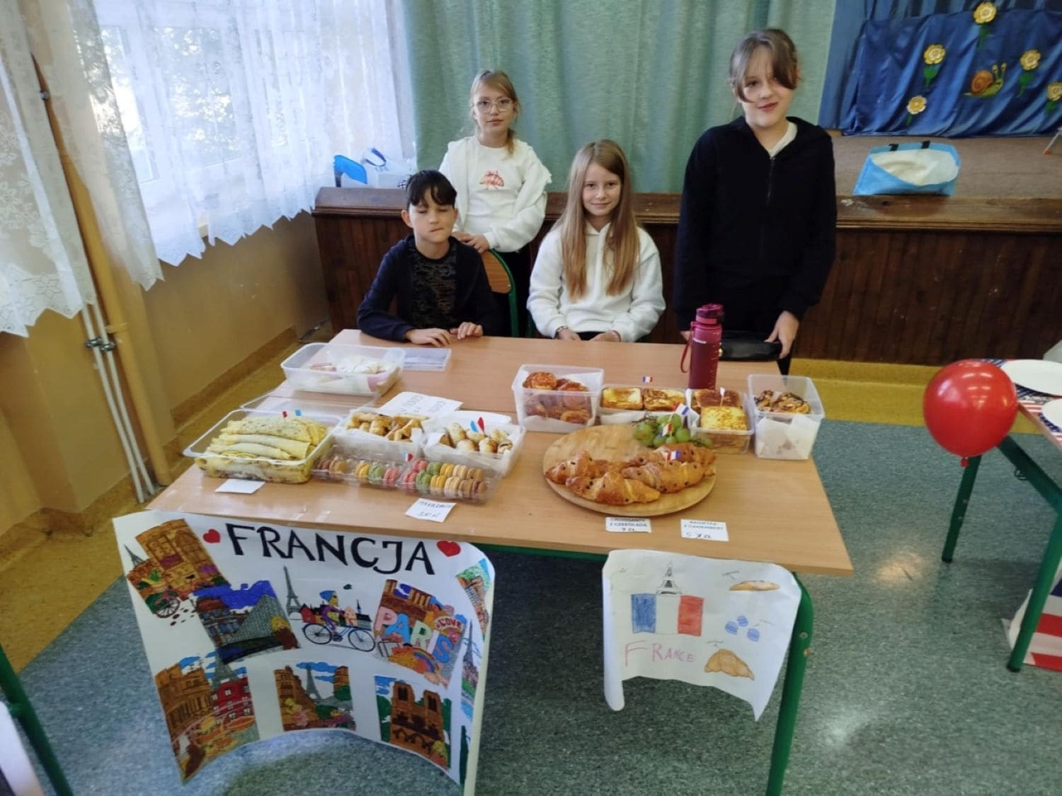Klasa 4 przygotowała Francję (croissanty, naleśniki, makaroniki) oraz Hiszpanię (kanapeczki, chipsy, czekolada).