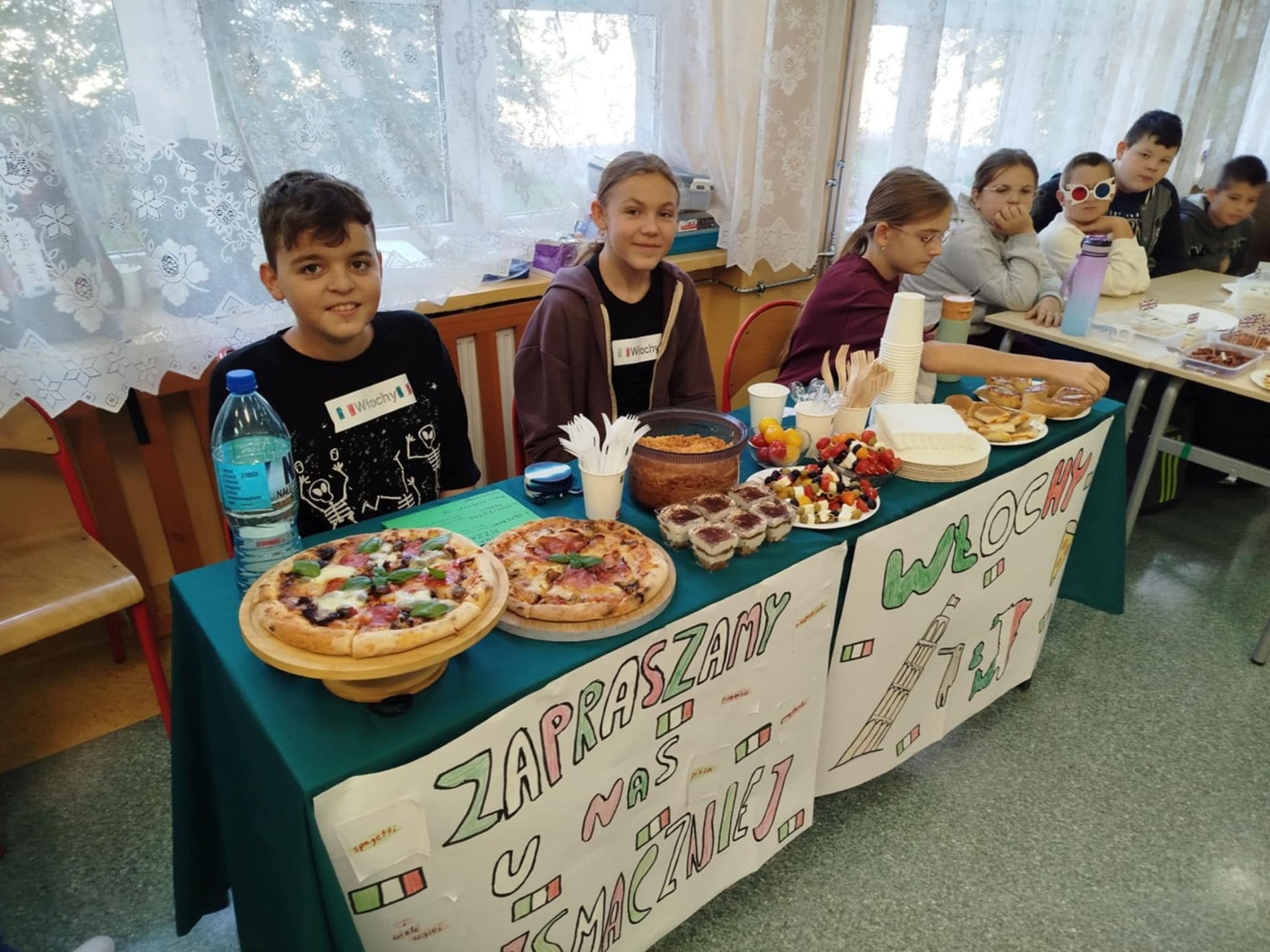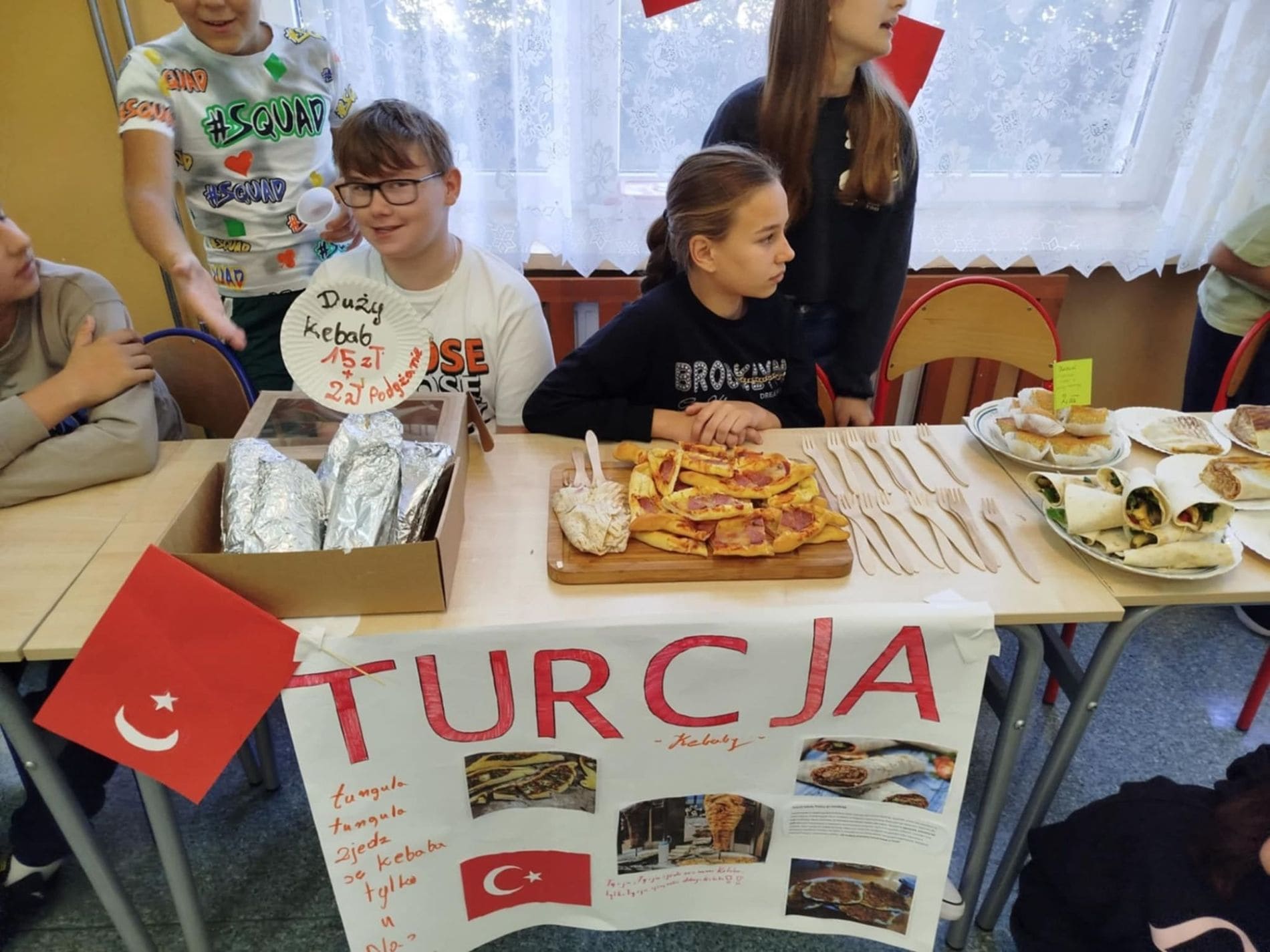 Klasa 6 zaprezentowała Turcję (kebaby, mini pizze, ciasto) oraz Włochy (pizza, spaghetti, tiramisu, bruschetta).