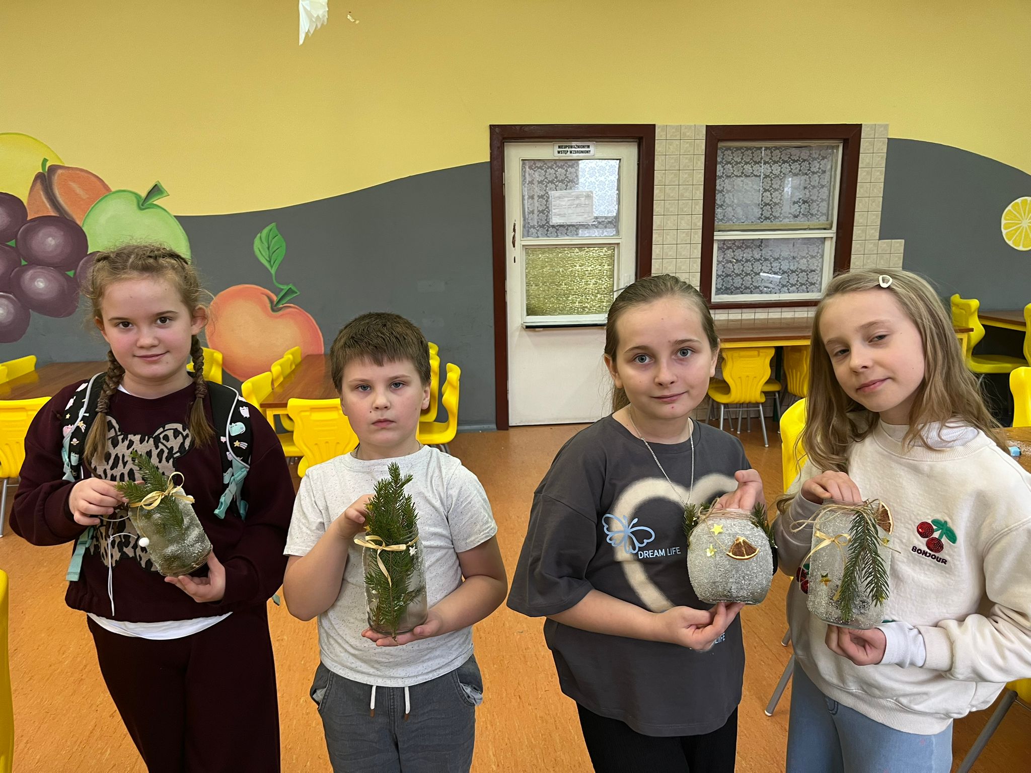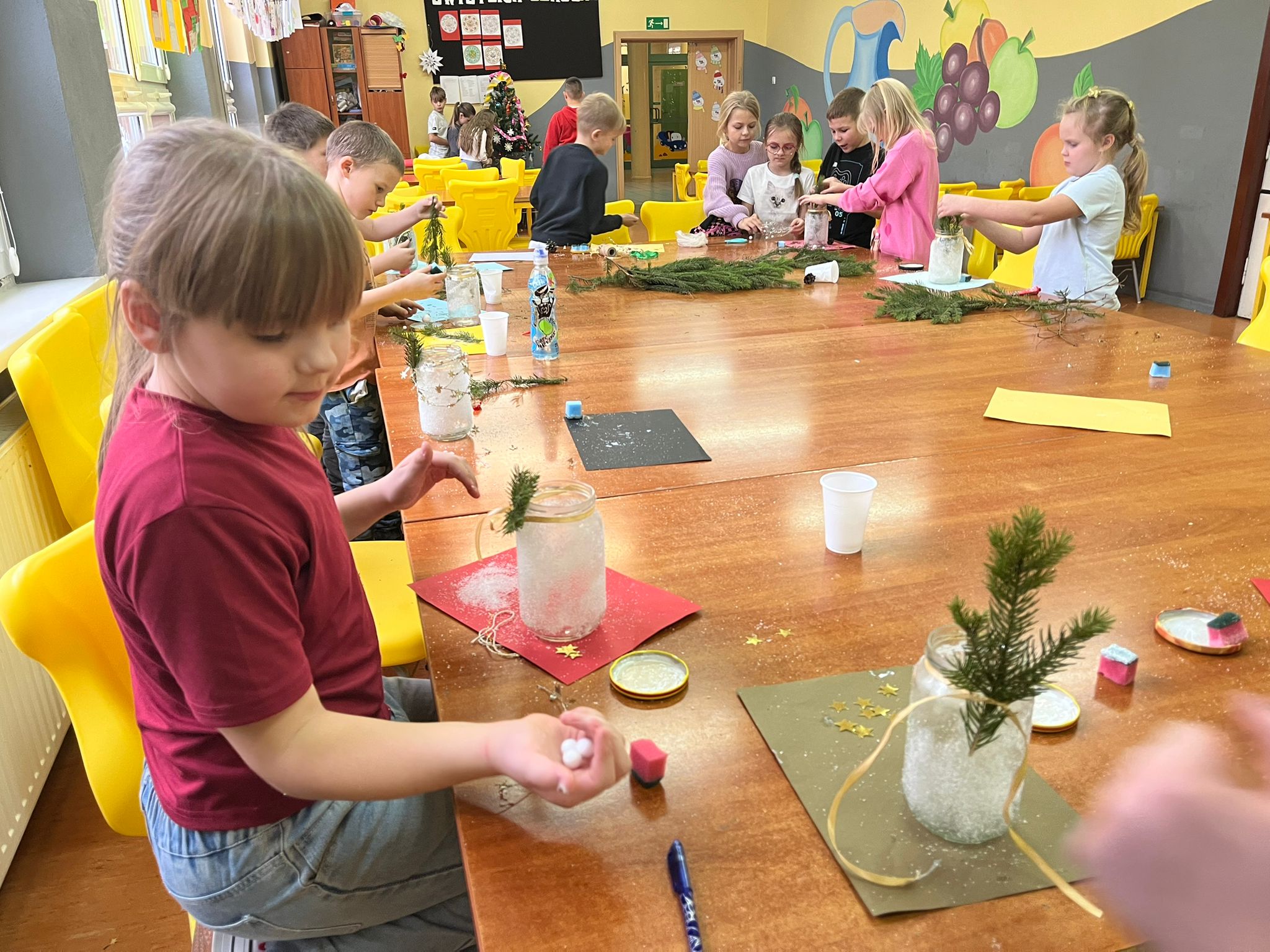 W grudniu w świetlicy szkolnej realizowane były zajęcia o tematyce świątecznej, których celem było rozwijanie kreatywności dzieci, sprawności manualnej oraz umiejętności współpracy w grupie. Zajęcia miały charakter plastyczny i eksperymentalny, a ich przebieg sprzyjał wprowadzeniu uczestników w atmosferę zbliżających się świąt.