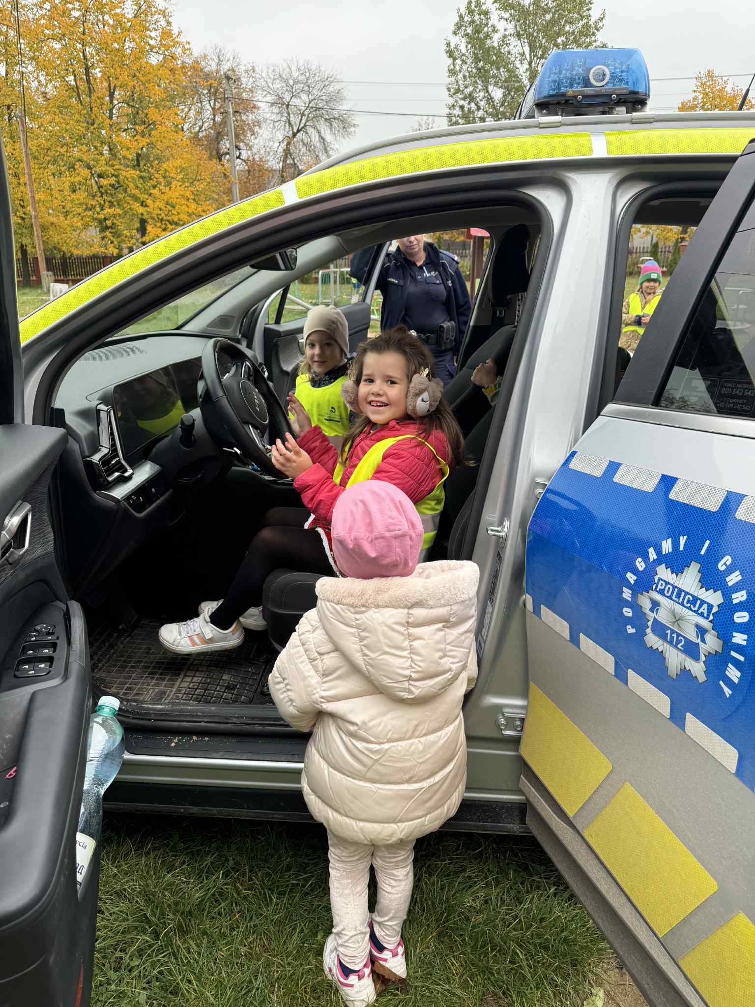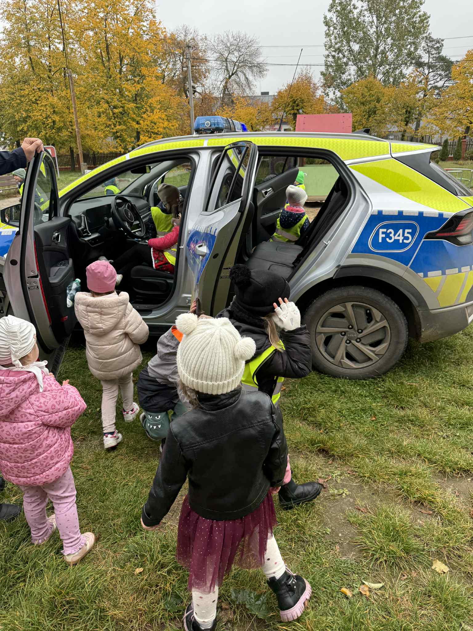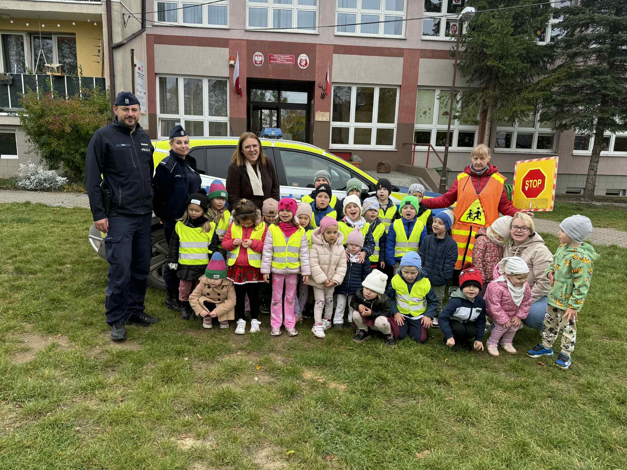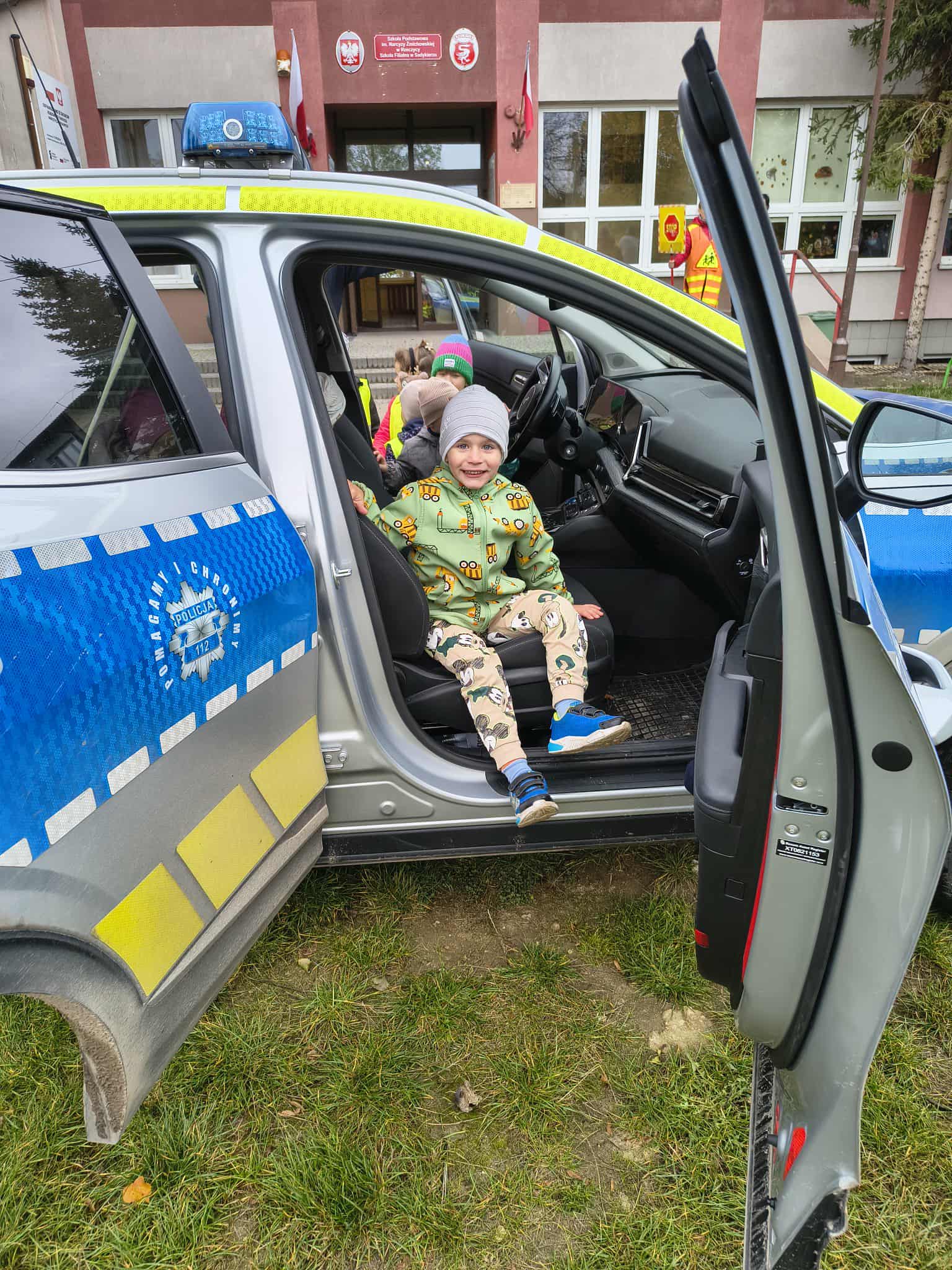 W naszym przedszkolu i szkole odbyło się spotkanie z policjantami. Tematem spotkania było utrwalenie z dziećmi z oddziału przedszkolnego oraz klas 1-3, zasad ruchu drogowego oraz przypomnienie zagadnień dotyczących bezpieczeństwa dzieci w przedszkolu i w domu. Policjanci, w formie praktycznej, przypomnieli podstawowe zasady zachowania się podczas przechodzenia przez jezdnię oraz sposoby poruszania się hulajnogą na chodniku i przejściu dla pieszych. Następnie wytłumaczyli, jak należy zachować się w kontaktach z obcymi ludźmi, jak dbać o bezpieczeństwo własne i innych oraz do kogo zwracać się o pomoc w sytuacji zagrożenia. Dzieci z dużym zainteresowaniem słuchały rad i wskazówek zaproszonych gości. Przedszkolaki mogły również zobaczyć, jak wygląda policyjny radiowóz od środka, używały sygnałów świetlnych, dźwiękowych oraz korzystały z megafonu. Na zakończenie wizyty dzieci wręczyły policjantom podziękowanie.