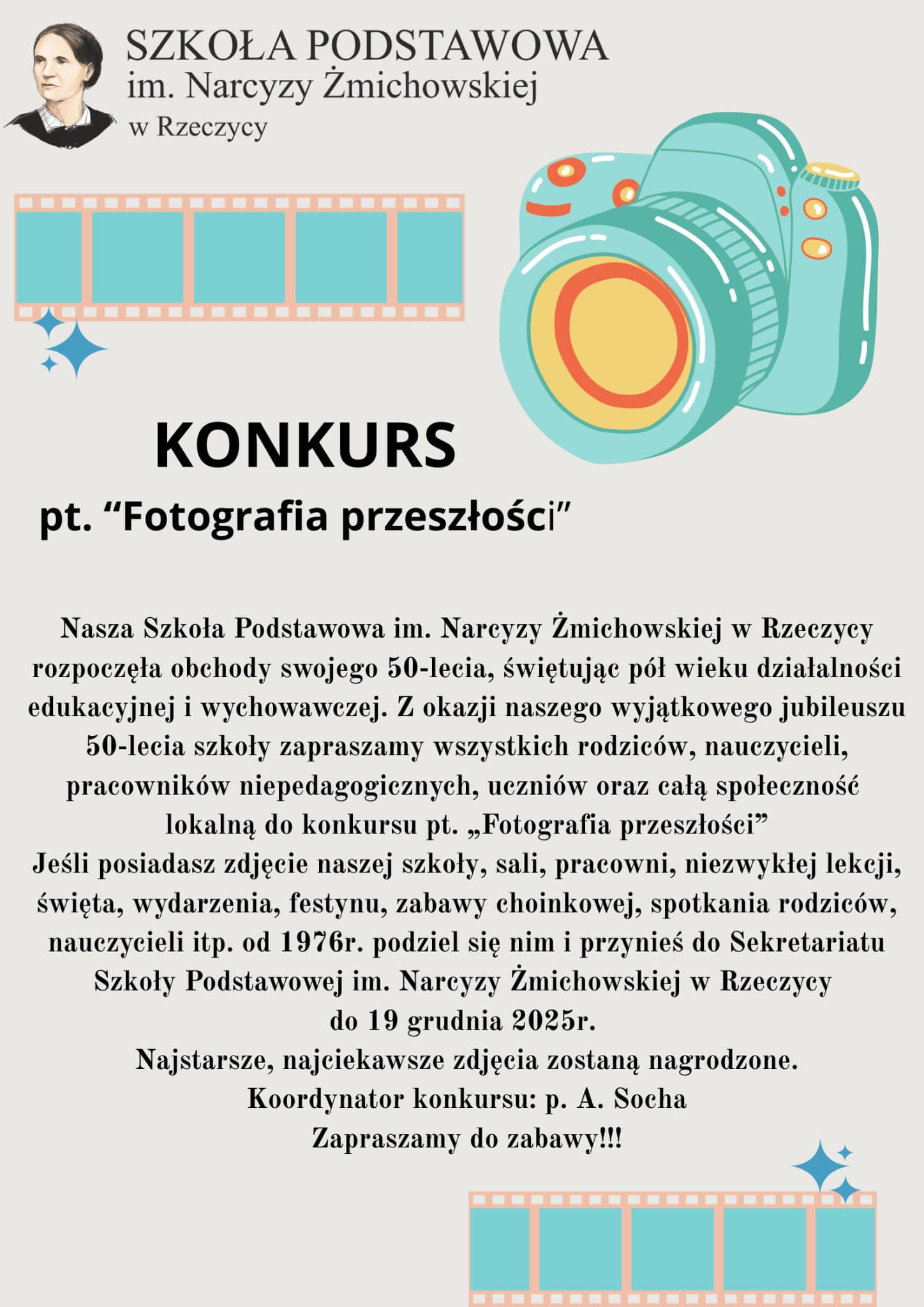 Nasza Szkoła Podstawowa im. Narcyzy Żmichowskiej w Rzeczycy rozpoczęła obchody swojego 50-lecia, świętując pół wieku działalności edukacyjnej i wychowawczej. Z okazji naszego wyjątkowego jubileuszu 50-lecia szkoły zapraszamy wszystkich rodziców, nauczycieli, pracowników niepedagogicznych, uczniów oraz całą społeczność lokalną do konkursu pt. „Fotografia przeszłości”.