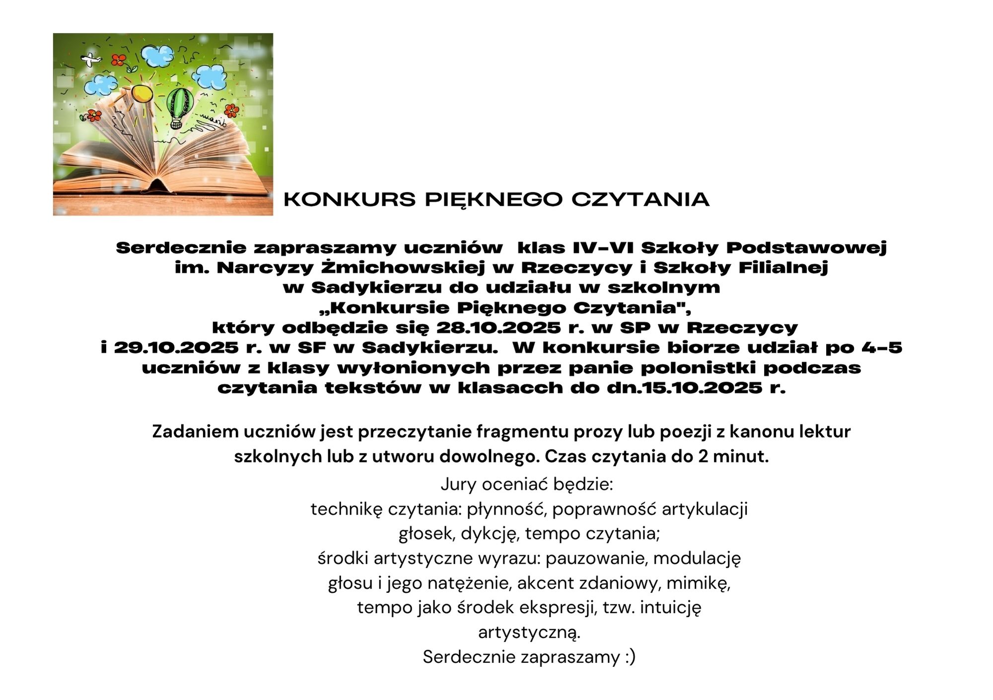 Serdecznie zapraszamy uczniów klas IV-VI Szkoły Podstawowej im. Narcyzy Żmichowskiej w Rzeczycy i Szkoły Filialnej w Sadykierzu do udziału w szkolnym „Konkursie Pięknego Czytania", który odbędzie się 28.10.2025 r. w SP w Rzeczycy i 29.10.2025 r. w SF w Sadykierzu. W konkursie biorze udział po 4-5 uczniów z klasy wyłonionych przez panie polonistki podczas czytania tekstów w klasacch do dn. 15.10.2025 r.