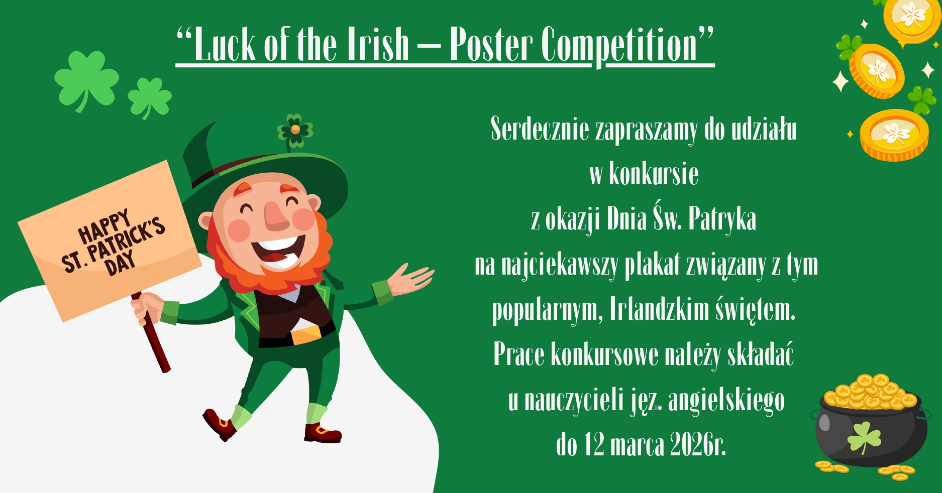 Regulamin szkolnego konkursu na plakat z okazji Dnia Świętego Patryka pt. „Luck of the Irish – Poster Competition”