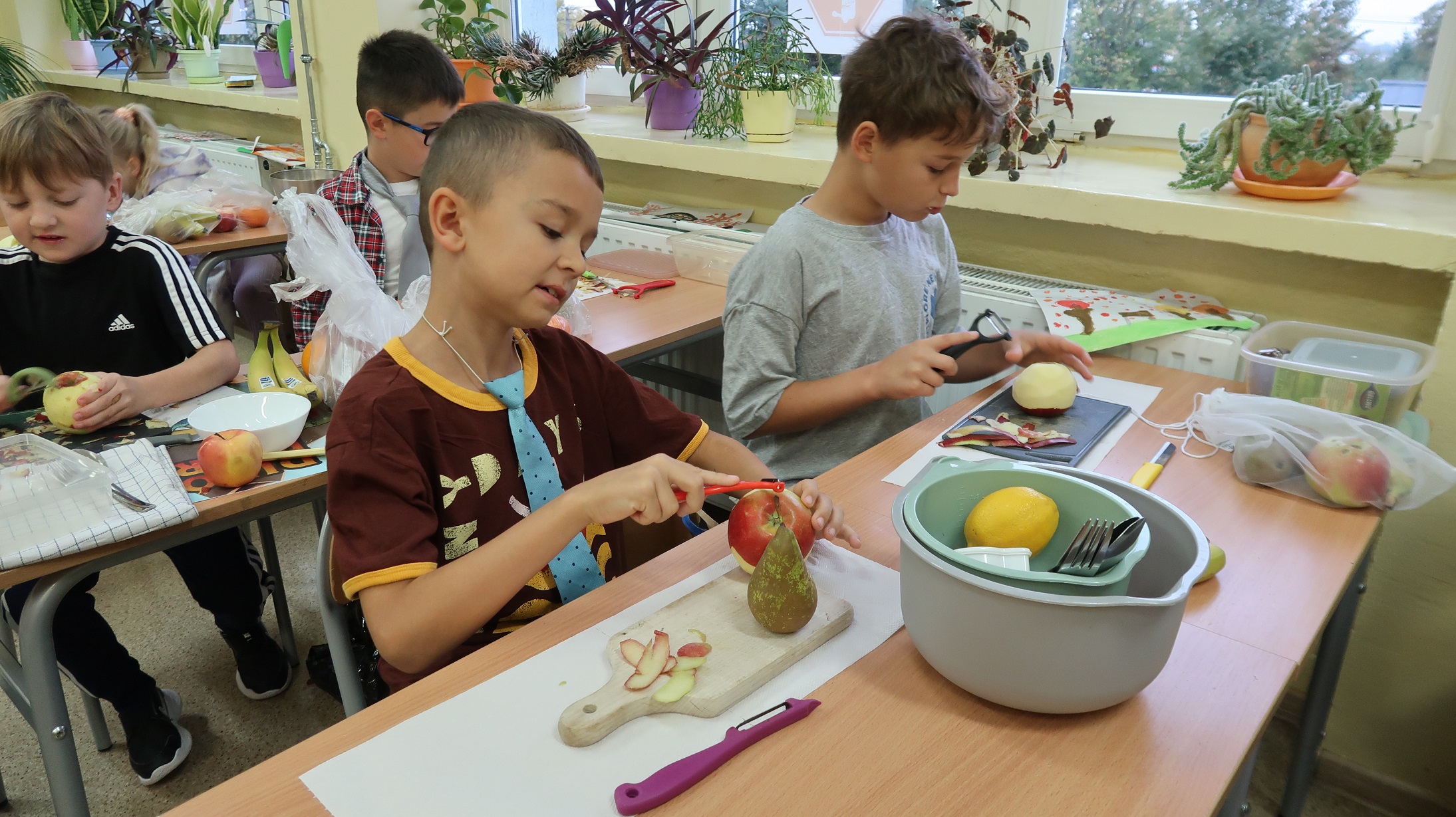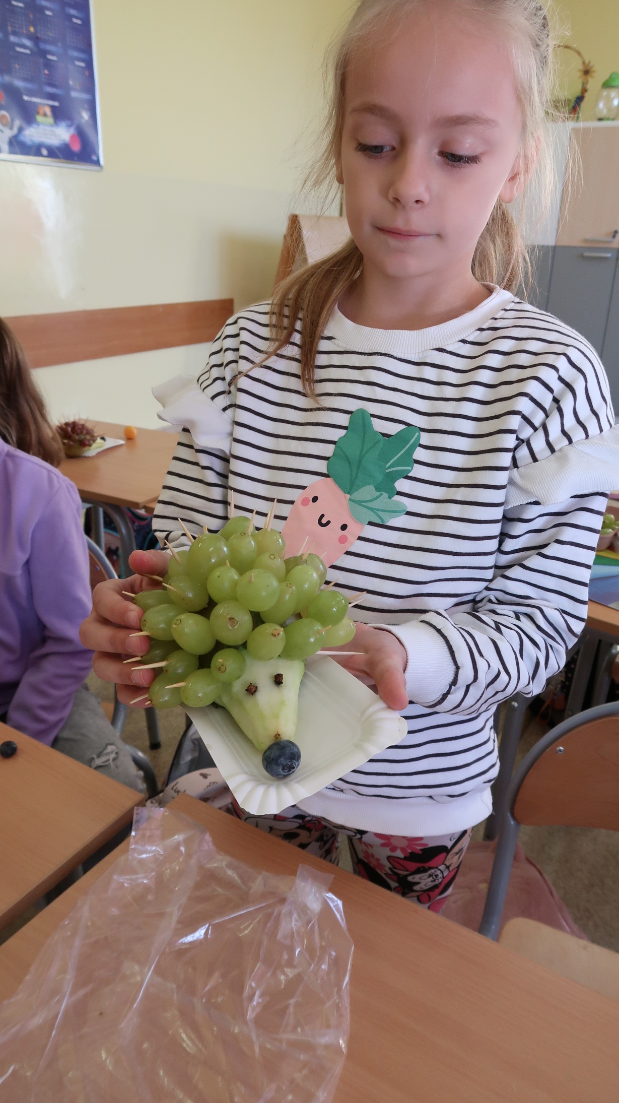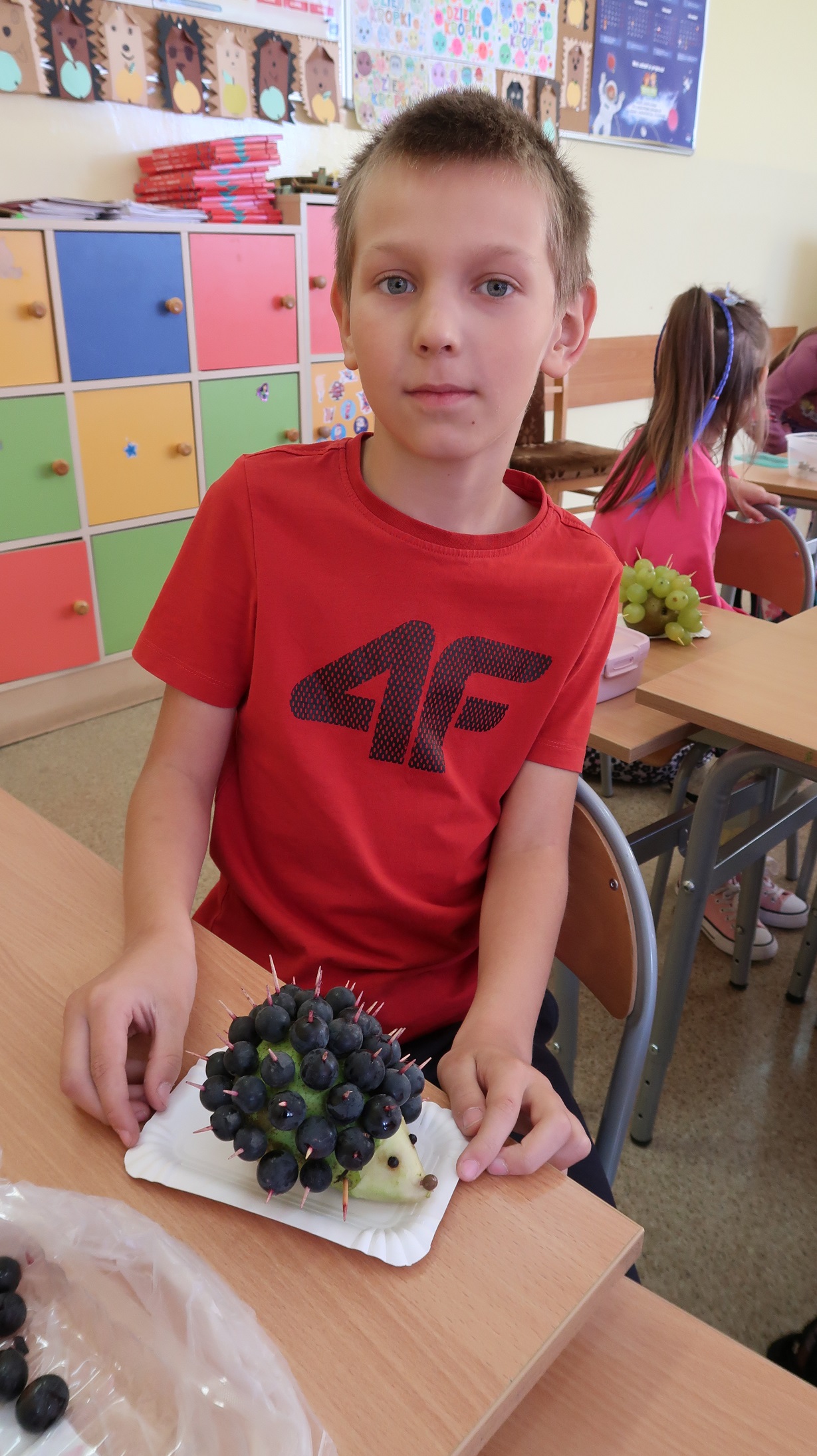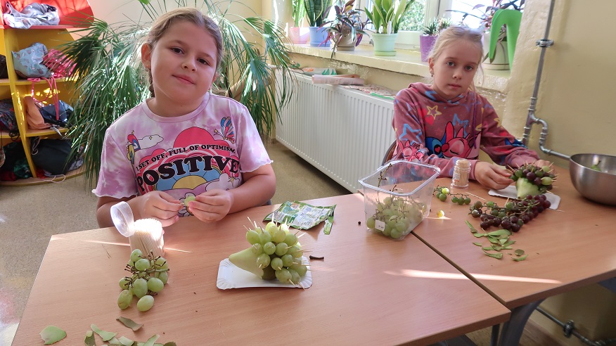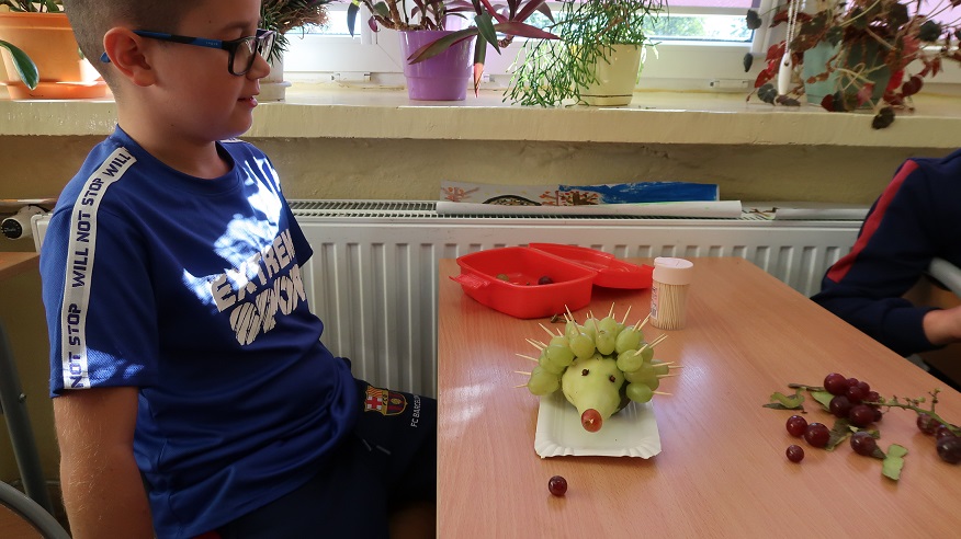 W klasie drugiej odbyły się zajęcia kulinarne, podczas których uczniowie wykonywali owocowe jeżyki z gruszek i winogron oraz wspólnie przygotowywali sałatkę owocową. Na początku dzieci przypomniały zasady higieny związane z przygotowywaniem posiłków – mycie rąk i owoców oraz zachowanie porządku na stanowisku pracy. Następnie każdy uczeń z gruszki i winogron wykonał swojego jeża, ćwicząc przy tym sprawność manualną i kreatywność.