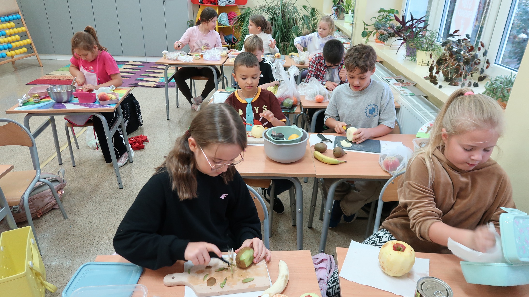 W dalszej części zajęć uczniowie zajęli się krojeniem różnych owoców: jabłek, bananów, kiwi, mandarynek i winogron. Wszystkie owoce zostały połączone w dużej misce. Powstała kolorowa i smaczna sałatka owocowa.