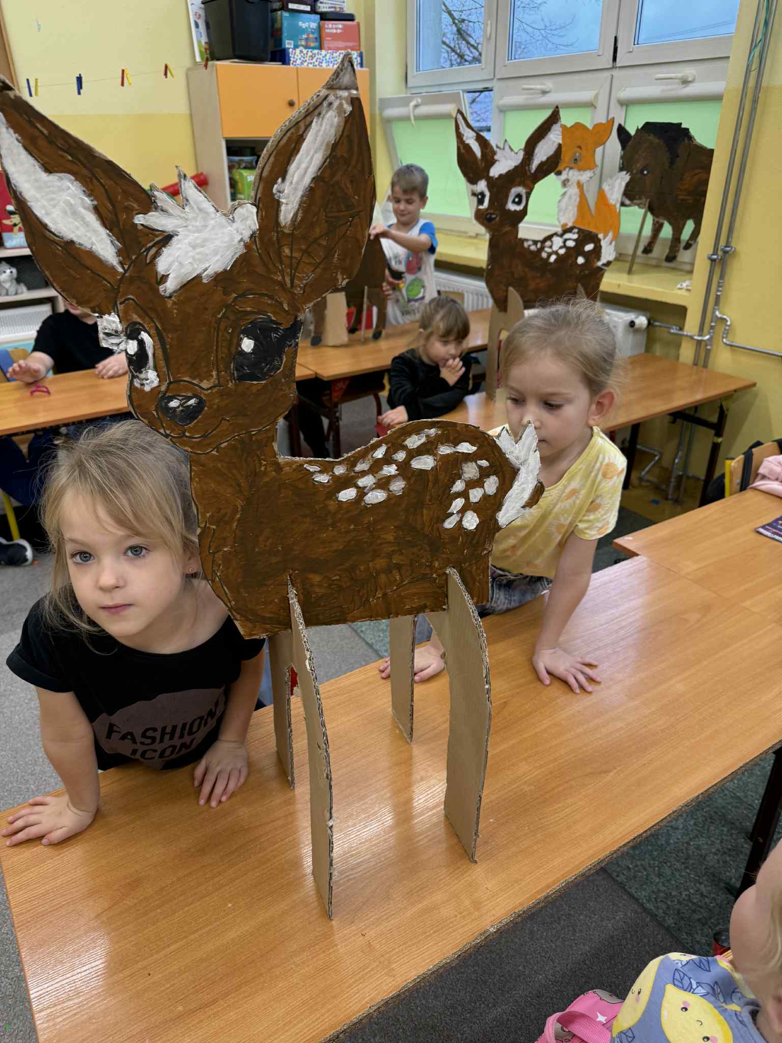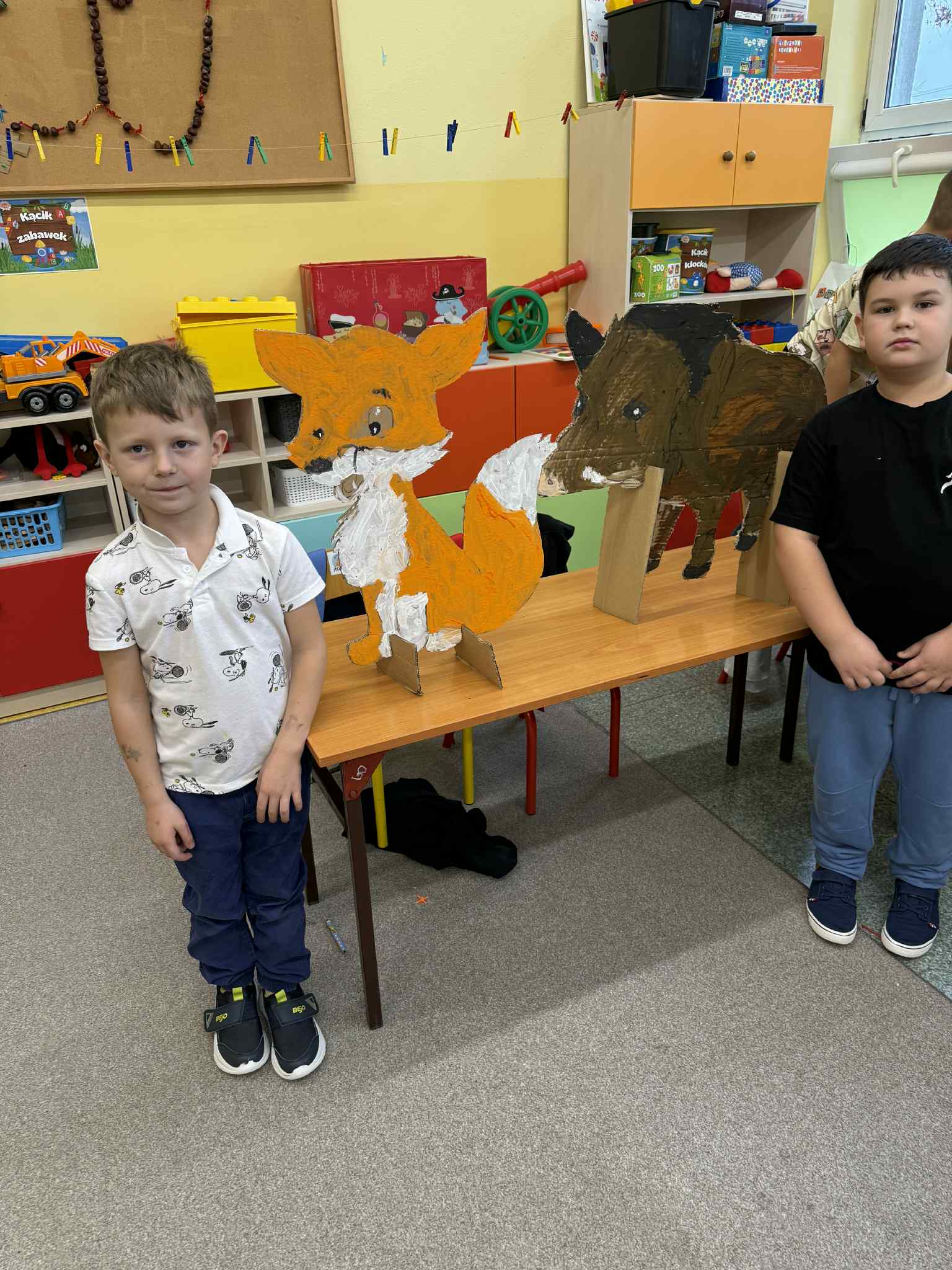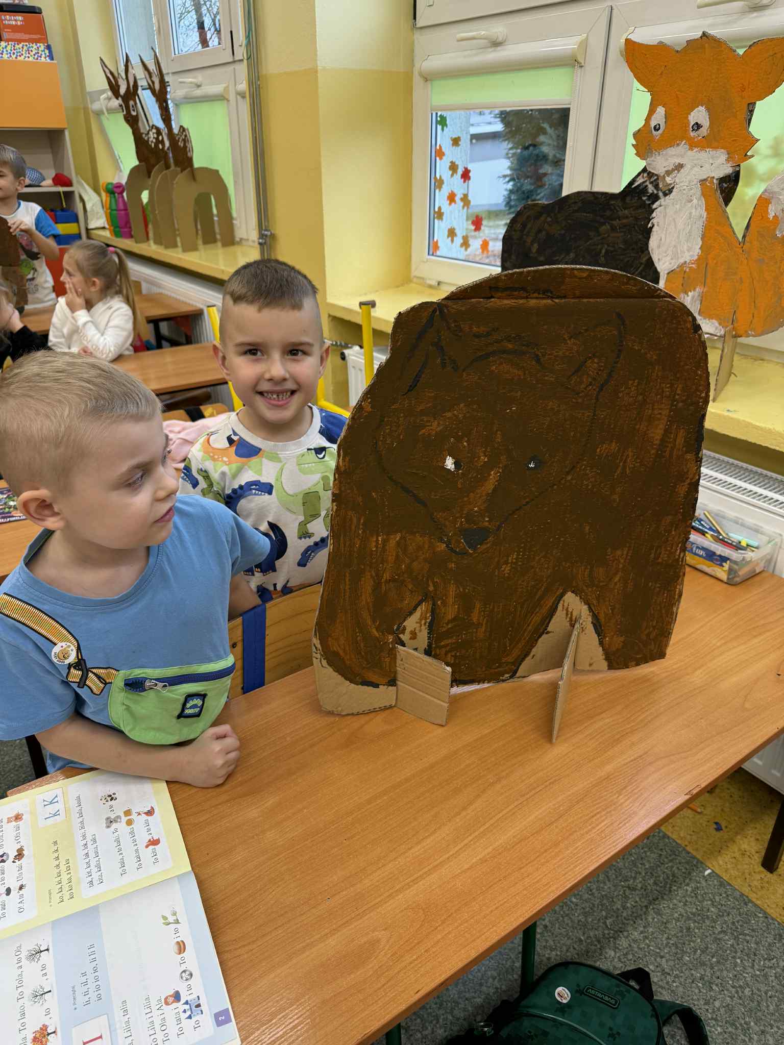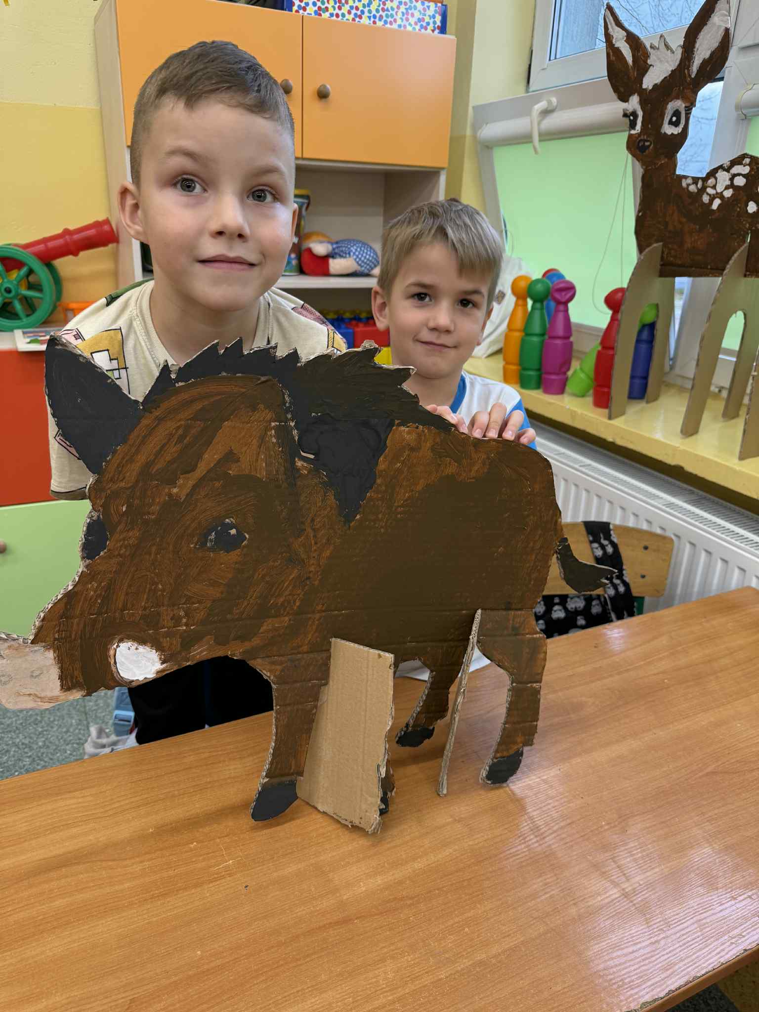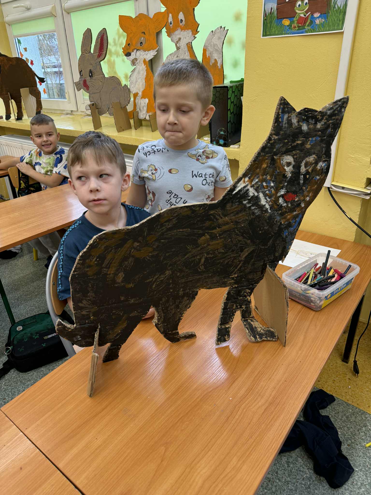 Dzieci z grupy Żabki przeniosły się w świat lasu i jego mieszkańców. Rozmawialiśmy o tym, jakie zwierzęta można spotkać w lesie, czym się charakteryzują, jak wyglądają i jak należy o nie dbać. Po krótkiej rozmowie edukacyjnej przedszkolaki przystąpiły do pracy plastycznej. Każde dziecko otrzymało wyciętą z tektury sylwetę leśnego zwierzęcia – były wśród nich m.in. sarny, lisy, dziki, wilki i niedźwiedzie. Zadaniem dzieci było pomalowanie ich farbami, zwracając uwagę na odpowiednie kolory i szczegóły. Dzięki temu ćwiczeniu dzieci nie tylko rozwijały sprawność manualną i wyobraźnię, ale przede wszystkim utrwalały wiedzę o zwierzętach leśnych – ich wyglądzie, kolorach futra i charakterystycznych cechach. To były kreatywne, pełne skupienia i radości zajęcia, które przybliżyły dzieciom piękno i bogactwo leśnej przyrody.