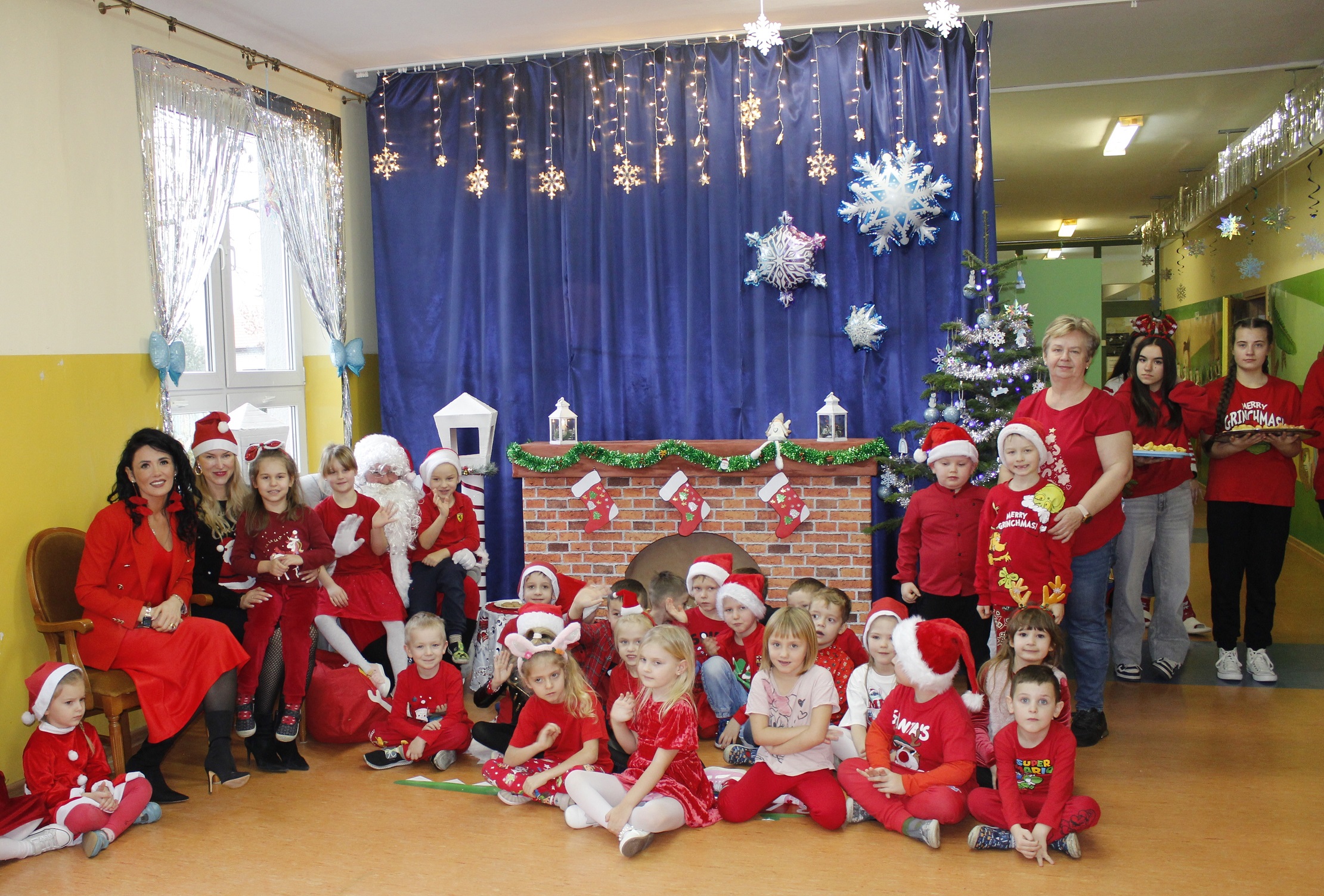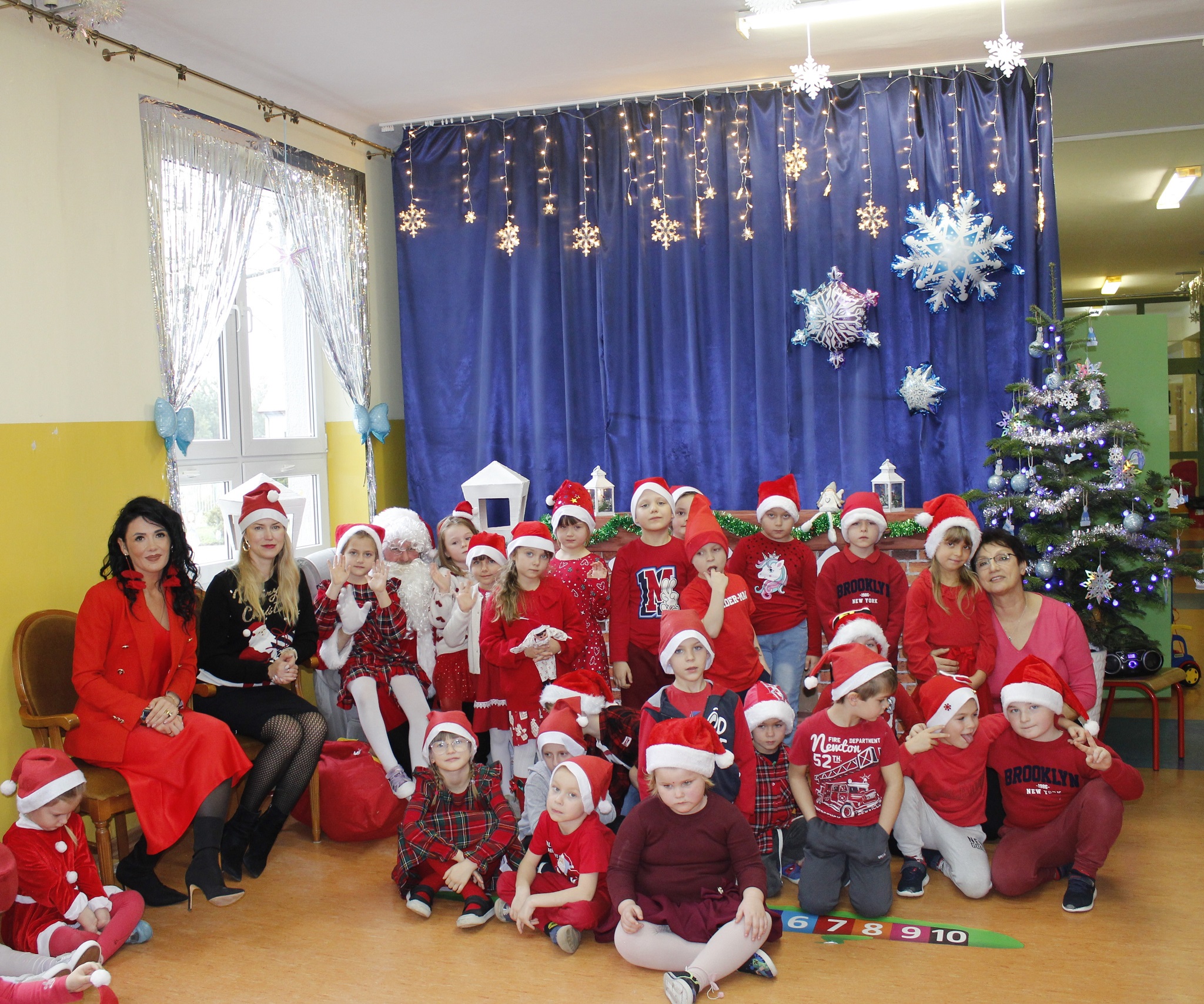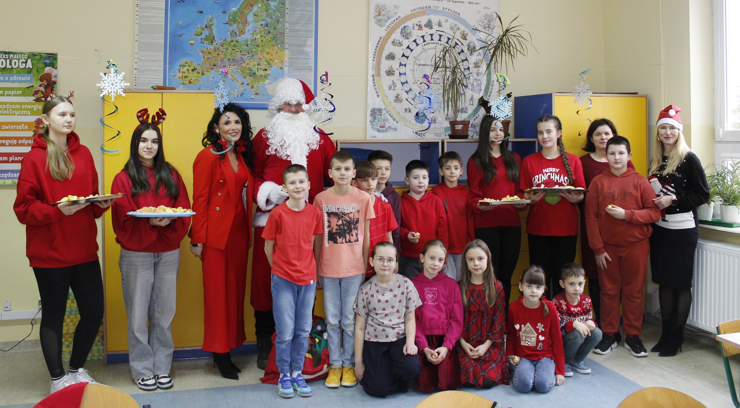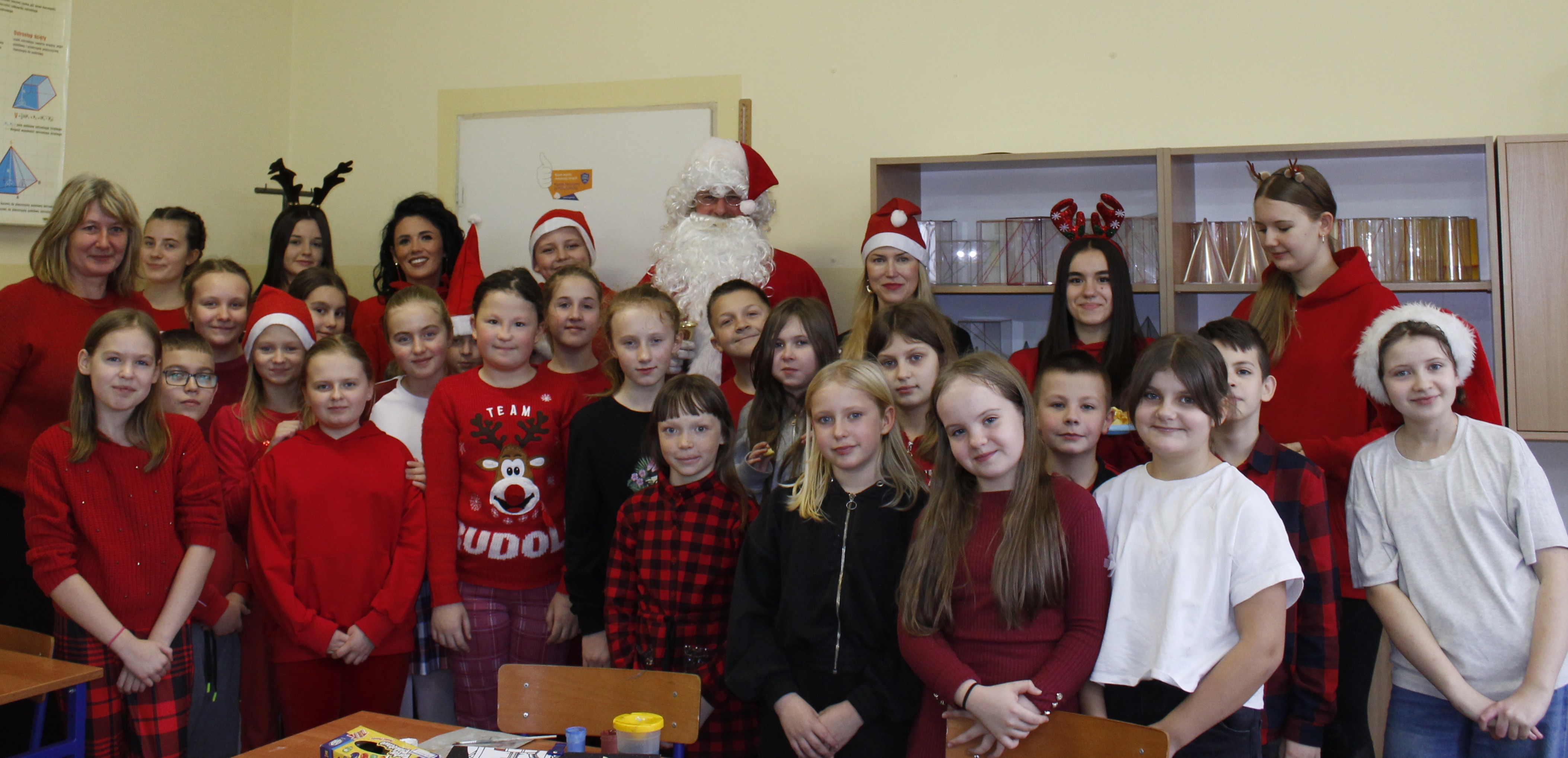 Dzisiejszy dzień wypełniła wyjątkowa, świąteczna atmosfera. Wśród dzieci dominowały czerwone akcenty, mikołajowe czapki oraz wesołe „Ho, ho, ho!” rozbrzmiewało w całej szkole i oddziale przedszkolnym. Najważniejszym punktem dnia była oczywiście wizyta Świętego Mikołaja, który sprawił, że na twarzach wszystkich dzieci pojawiły się szerokie uśmiechy. W towarzystwie Pani Dyrektor Agaty Ewy Ostalskiej oraz Zastępcy Wójta Pani Iwony Łuszcz-Krawczyk odwiedzał przedszkole i klasy, obdarowując drobnymi upominkami. Dzieci chętnie rozmawiały z Mikołajem, prezentowały piosenki i wierszyki, a niektórzy odważnie odpowiadali na jego żartobliwe pytania. Magiczny nastrój udzielił się wszystkim - pełen radości, ciepła i świątecznego czaru!
