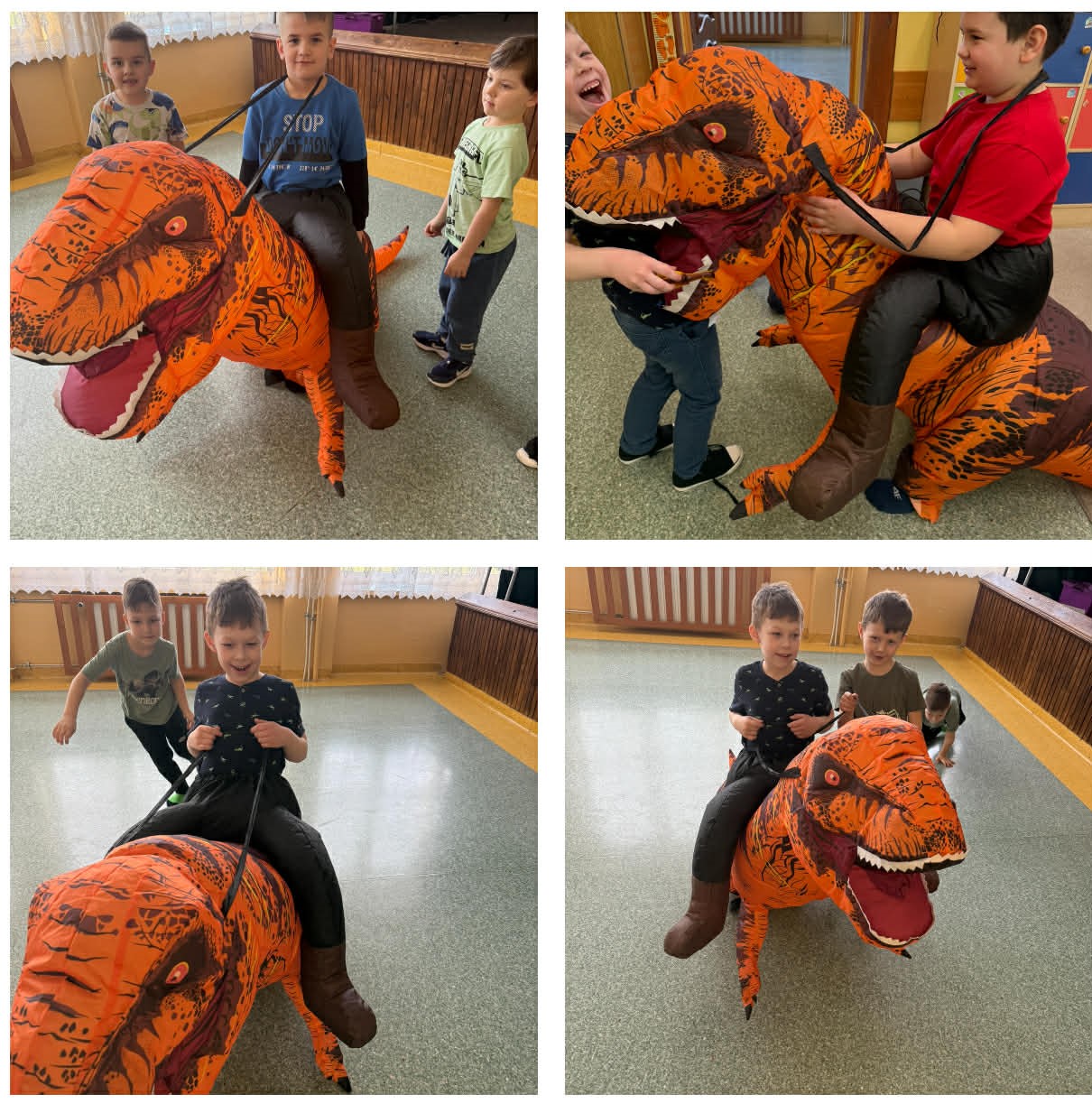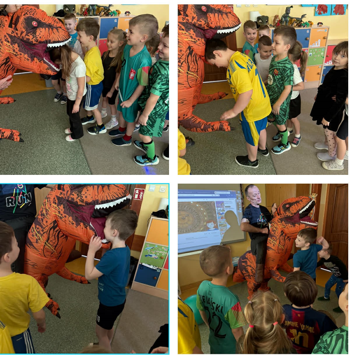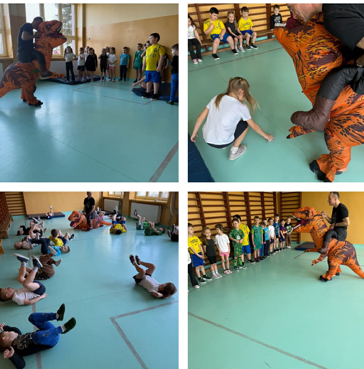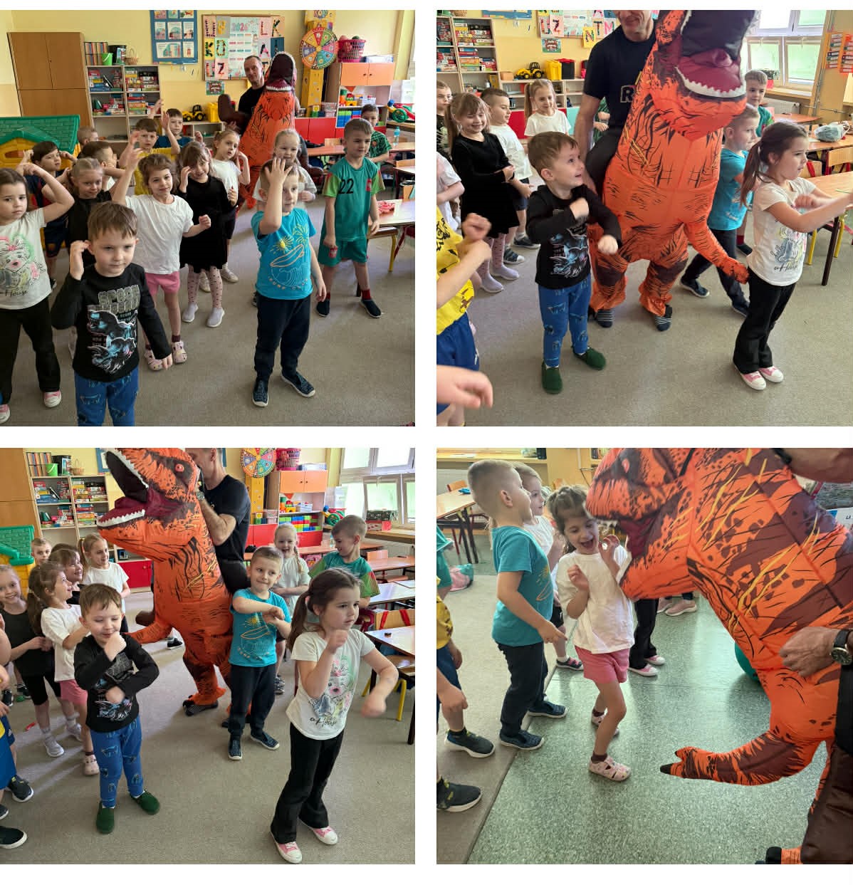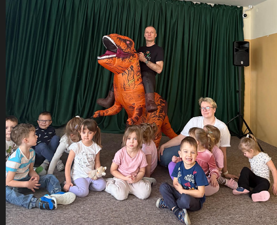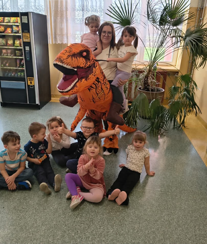 W grupach Żabki i Słoneczka odbył się wyjątkowy Dzień Dinozaura, który na długo pozostanie w pamięci naszych przedszkolaków. Tego dnia dzieci przeniosły się miliony lat wstecz, do fascynującego świata prehistorycznych gadów. Przedszkolaki poznały nazwy różnych dinozaurów, oglądały je z bliska, a nawet… zaglądały do ich paszczy i brzuszków, by odgadnąć, co mogły zjeść. Dopasowywały dinozaury do odpowiednich jaj, tańczyły w rytm dinozaurowych przebojów i z ogromnym zaangażowaniem brały udział w przygotowanych aktywnościach. Na chwilę wszystkie dzieci stały się prawdziwymi paleontologami – poszukiwały szczątków kości i śladów dinozaurów, a następnie z wielką starannością składały odkryte elementy w całość, odtwarzając sylwetki prehistorycznych stworzeń. W grupie Słoneczka przedszkolaki wykazały się ogromną skutecznością, budując z wielu elementów imponująco dużego dinozaura. Niespodziewanie wydarzył się moment, który wywołał prawdziwą eksplozję emocji! Rozległ się głośny huk do drzwi… a po chwili okazało się, że odwiedził nas Wujek Andrzej, który przyjechał… na ogromnym dinozaurze! Wielki, z potężnymi zębami, wzbudził najpierw podziw, a potem szerokie uśmiechy. Okazał się niezwykle przyjaznym gościem i chętne dzieci mogły przejechać się na jego grzbiecie. To był prawdziwy hit dnia! Dinozaur został zaproszony również na zajęcia ruchowe. Po intensywnym wysiłku wydarzyło się coś zupełnie niespodziewanego – zaczął znosić jajka! Zniósł aż cztery, a dzieci z niecierpliwością i radością obserwowały to niezwykłe zjawisko, zastanawiając się, kto zabierze dinozaurowe jajko do domu. Teraz już każdy wie, skąd biorą się dinozaury! Ogromne wrażenie zrobiły także wybuchające wulkany, które „eksplodowały” w obu grupach, wywołując wielkie „wow!” na twarzach dzieci. Było mnóstwo emocji, radości i naukowych odkryć. Na zakończenie tego niezwykłego dnia przedszkolaki radośnie pozowały do zdjęć w fotobudce oraz z wyjątkowym gościem – dinozaurem. To był dzień pełen śmiechu, ruchu, odkryć i niezapomnianych wrażeń. Jedno jest pewne – prehistoria jeszcze nigdy nie była tak blisko nas!