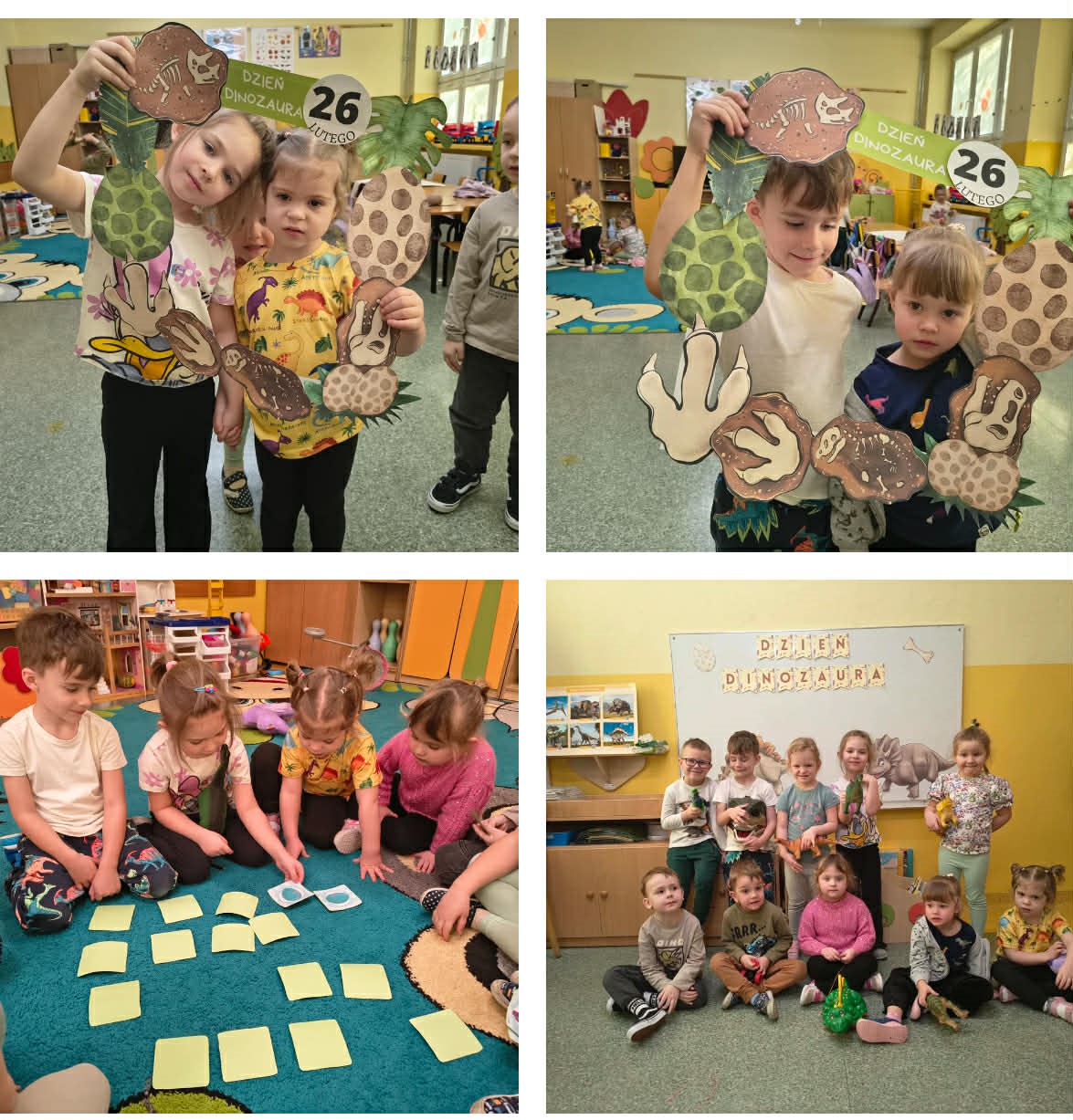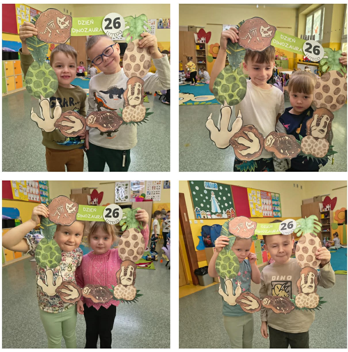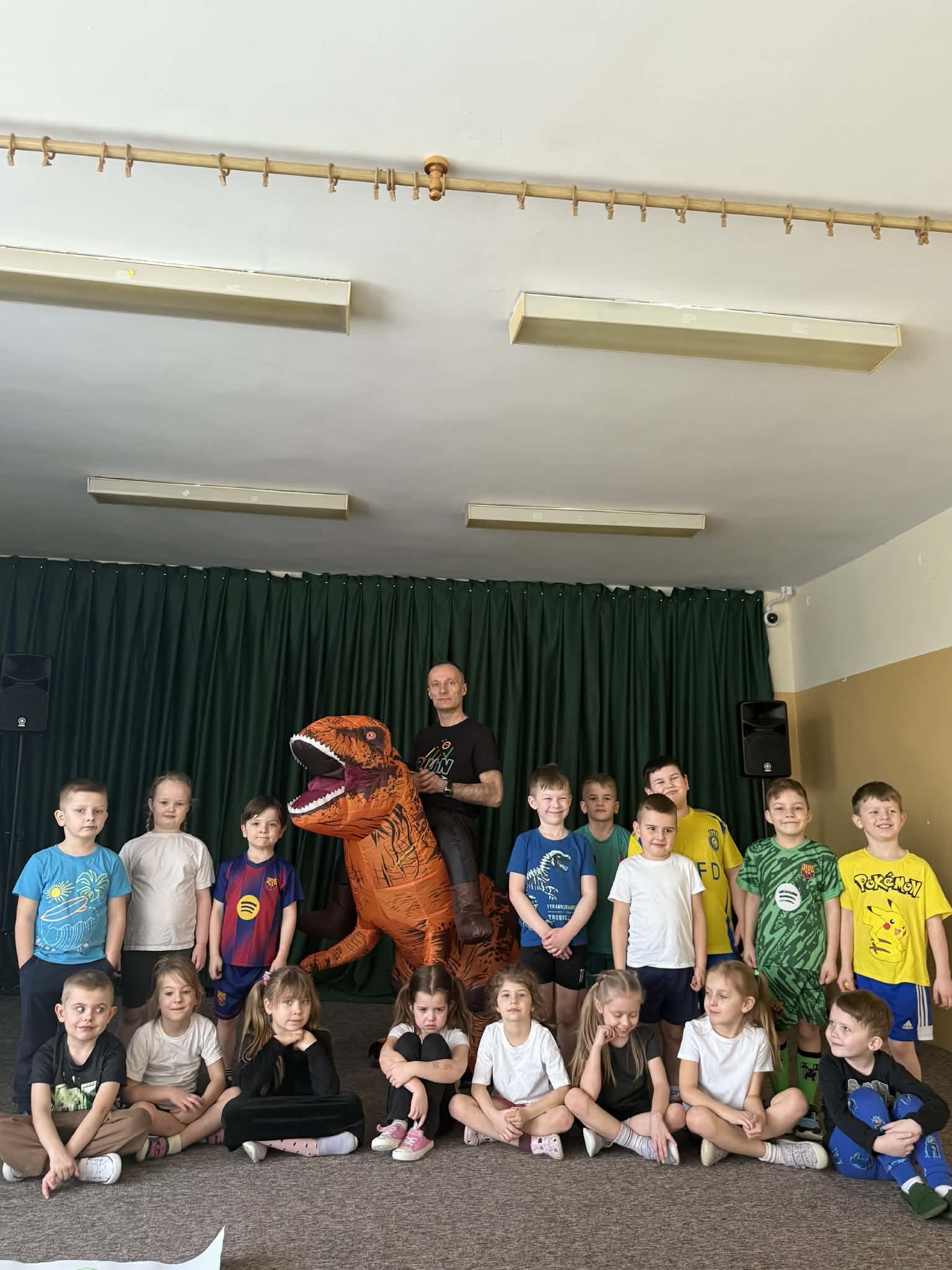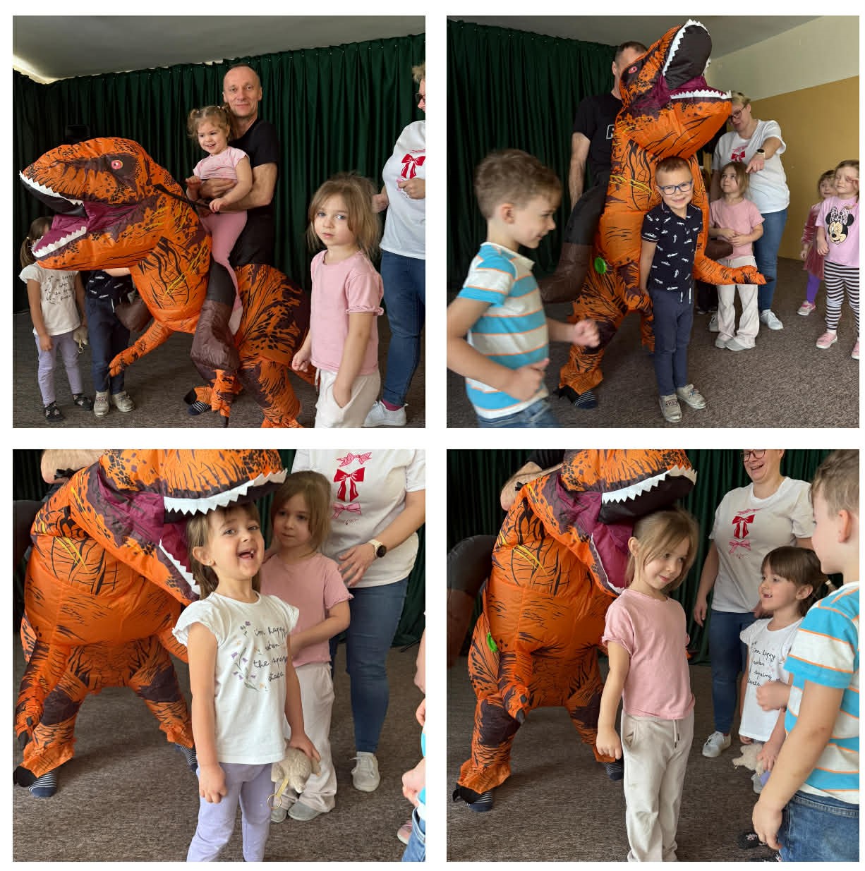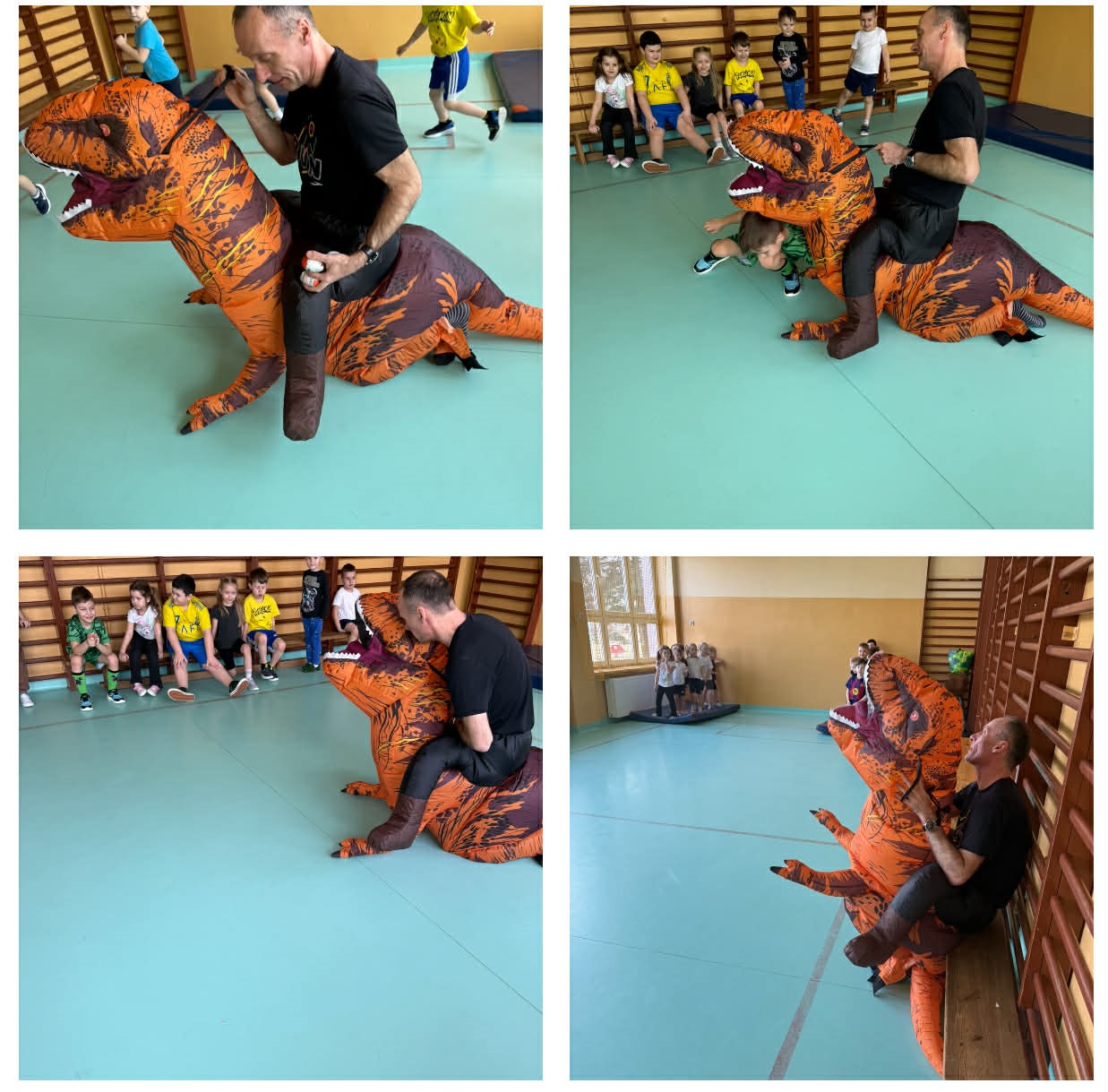 W grupach Żabki i Słoneczka odbył się wyjątkowy Dzień Dinozaura, który na długo pozostanie w pamięci naszych przedszkolaków. Tego dnia dzieci przeniosły się miliony lat wstecz, do fascynującego świata prehistorycznych gadów. Przedszkolaki poznały nazwy różnych dinozaurów, oglądały je z bliska, a nawet… zaglądały do ich paszczy i brzuszków, by odgadnąć, co mogły zjeść. Dopasowywały dinozaury do odpowiednich jaj, tańczyły w rytm dinozaurowych przebojów i z ogromnym zaangażowaniem brały udział w przygotowanych aktywnościach. Na chwilę wszystkie dzieci stały się prawdziwymi paleontologami – poszukiwały szczątków kości i śladów dinozaurów, a następnie z wielką starannością składały odkryte elementy w całość, odtwarzając sylwetki prehistorycznych stworzeń. W grupie Słoneczka przedszkolaki wykazały się ogromną skutecznością, budując z wielu elementów imponująco dużego dinozaura. Niespodziewanie wydarzył się moment, który wywołał prawdziwą eksplozję emocji! Rozległ się głośny huk do drzwi… a po chwili okazało się, że odwiedził nas Wujek Andrzej, który przyjechał… na ogromnym dinozaurze! Wielki, z potężnymi zębami, wzbudził najpierw podziw, a potem szerokie uśmiechy. Okazał się niezwykle przyjaznym gościem i chętne dzieci mogły przejechać się na jego grzbiecie. To był prawdziwy hit dnia! Dinozaur został zaproszony również na zajęcia ruchowe. Po intensywnym wysiłku wydarzyło się coś zupełnie niespodziewanego – zaczął znosić jajka! Zniósł aż cztery, a dzieci z niecierpliwością i radością obserwowały to niezwykłe zjawisko, zastanawiając się, kto zabierze dinozaurowe jajko do domu. Teraz już każdy wie, skąd biorą się dinozaury! Ogromne wrażenie zrobiły także wybuchające wulkany, które „eksplodowały” w obu grupach, wywołując wielkie „wow!” na twarzach dzieci. Było mnóstwo emocji, radości i naukowych odkryć. Na zakończenie tego niezwykłego dnia przedszkolaki radośnie pozowały do zdjęć w fotobudce oraz z wyjątkowym gościem – dinozaurem. To był dzień pełen śmiechu, ruchu, odkryć i niezapomnianych wrażeń. Jedno jest pewne – prehistoria jeszcze nigdy nie była tak blisko nas!