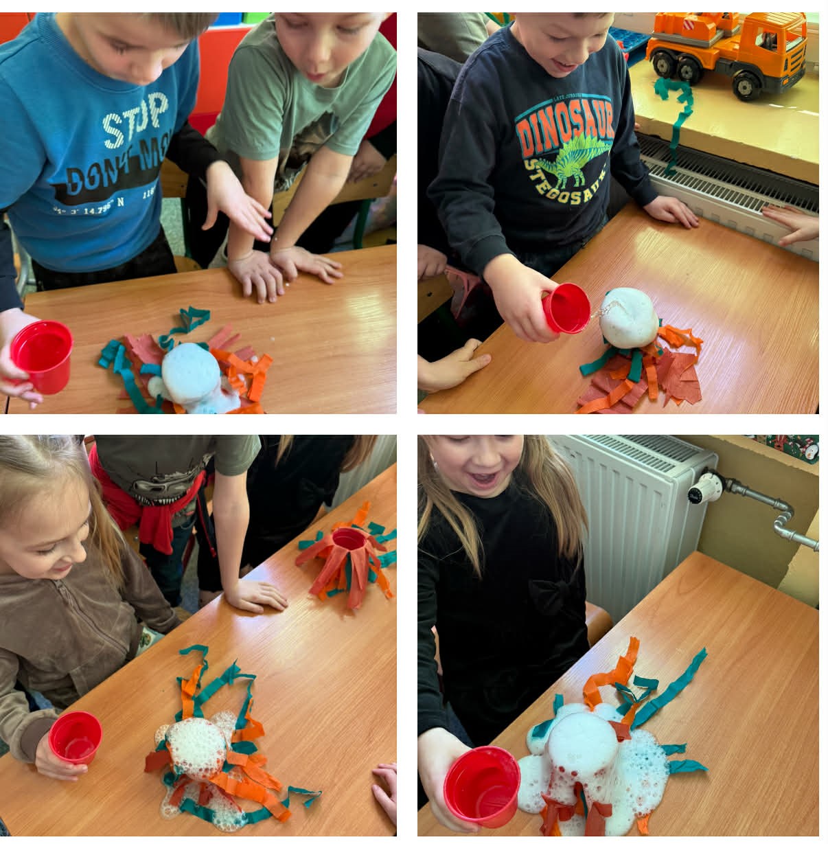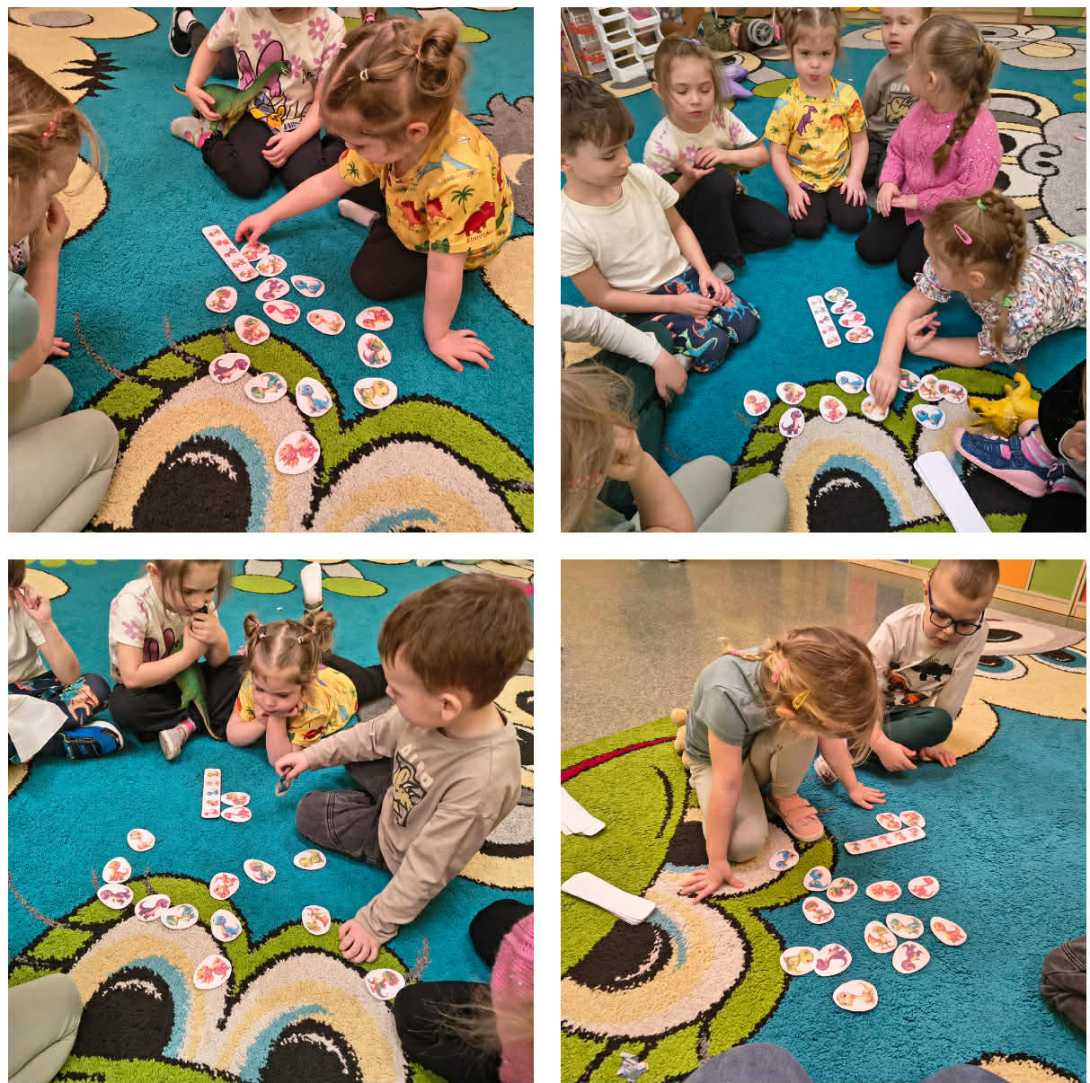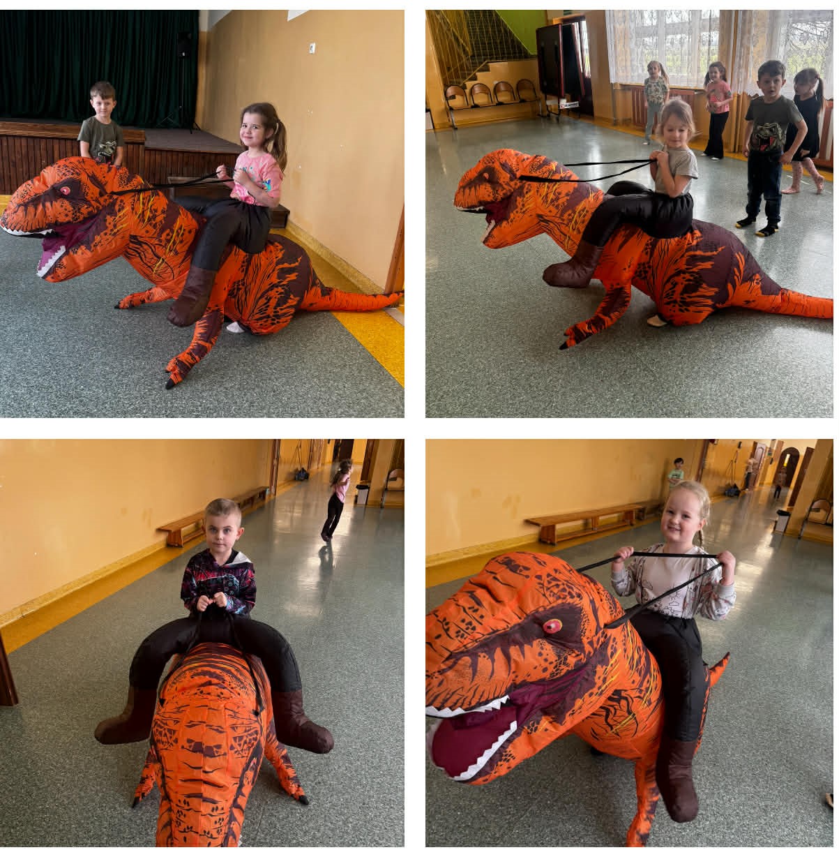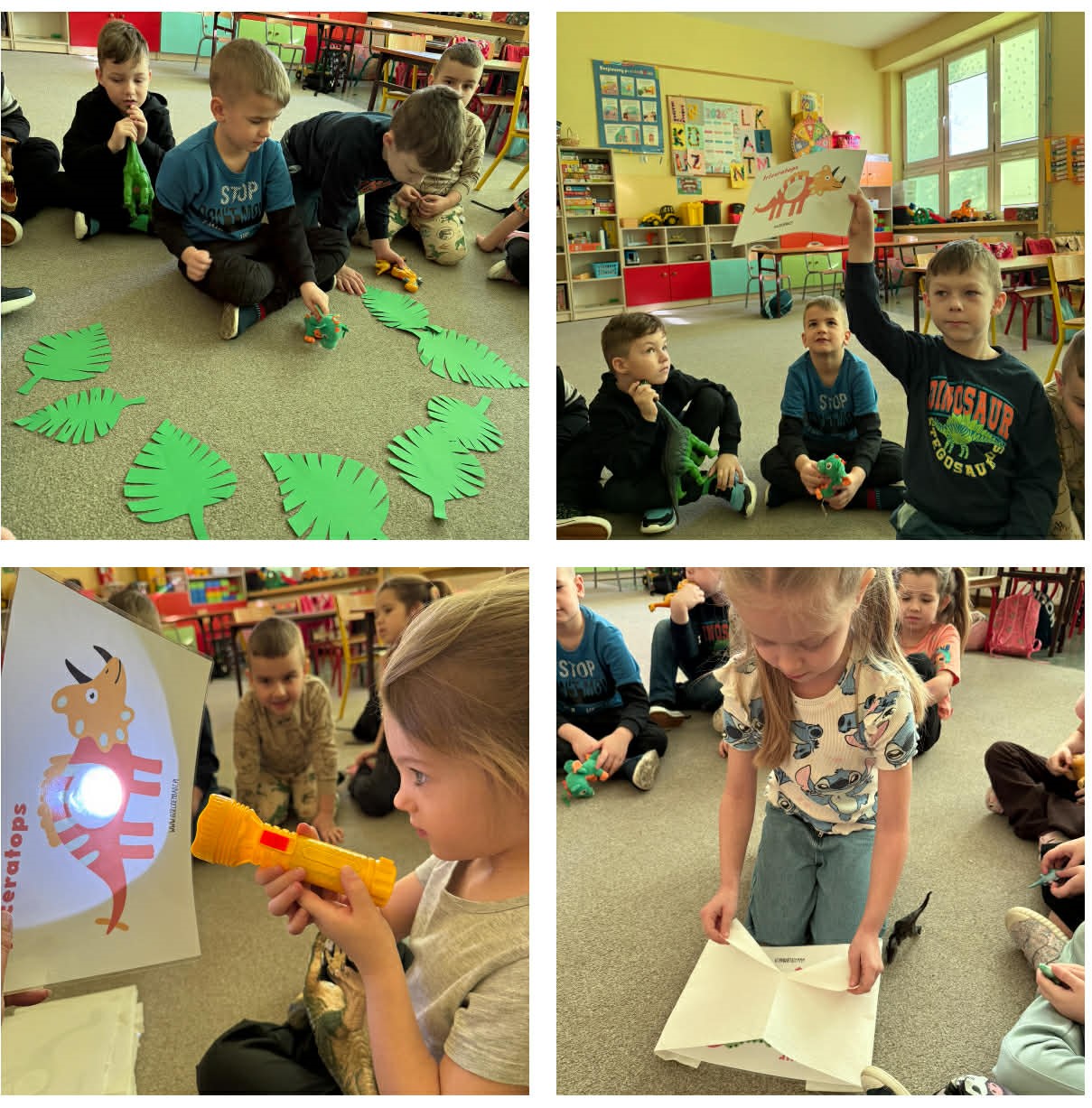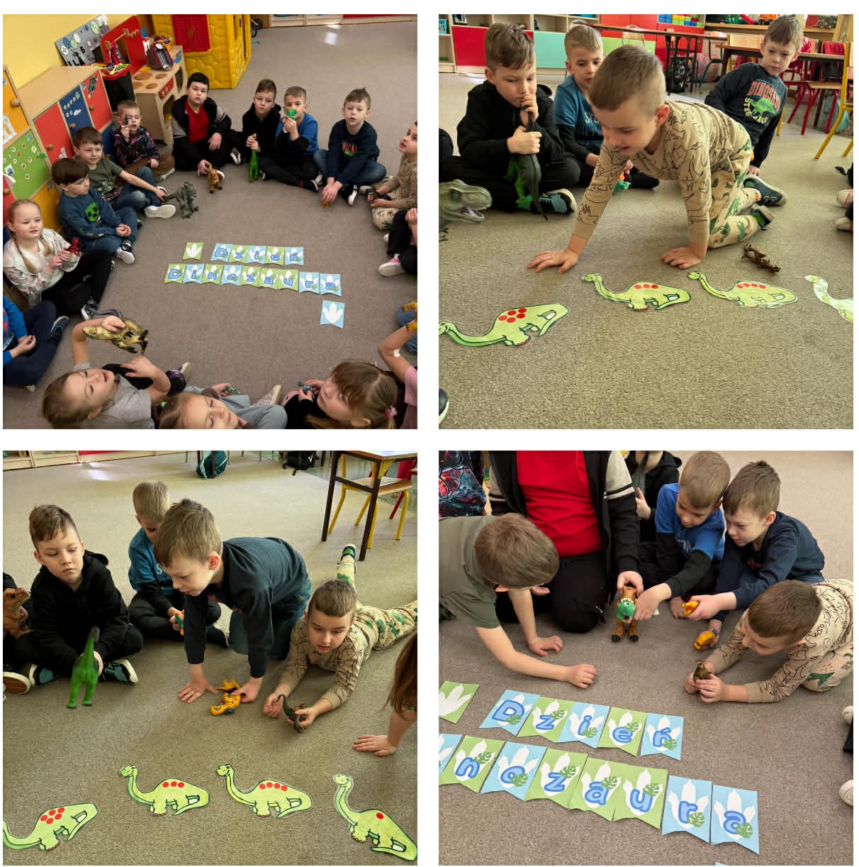W grupach Żabki i Słoneczka odbył się wyjątkowy Dzień Dinozaura, który na długo pozostanie w pamięci naszych przedszkolaków. Tego dnia dzieci przeniosły się miliony lat wstecz, do fascynującego świata prehistorycznych gadów. Przedszkolaki poznały nazwy różnych dinozaurów, oglądały je z bliska, a nawet… zaglądały do ich paszczy i brzuszków, by odgadnąć, co mogły zjeść. Dopasowywały dinozaury do odpowiednich jaj, tańczyły w rytm dinozaurowych przebojów i z ogromnym zaangażowaniem brały udział w przygotowanych aktywnościach. Na chwilę wszystkie dzieci stały się prawdziwymi paleontologami – poszukiwały szczątków kości i śladów dinozaurów, a następnie z wielką starannością składały odkryte elementy w całość, odtwarzając sylwetki prehistorycznych stworzeń. W grupie Słoneczka przedszkolaki wykazały się ogromną skutecznością, budując z wielu elementów imponująco dużego dinozaura. Niespodziewanie wydarzył się moment, który wywołał prawdziwą eksplozję emocji! Rozległ się głośny huk do drzwi… a po chwili okazało się, że odwiedził nas Wujek Andrzej, który przyjechał… na ogromnym dinozaurze! Wielki, z potężnymi zębami, wzbudził najpierw podziw, a potem szerokie uśmiechy. Okazał się niezwykle przyjaznym gościem i chętne dzieci mogły przejechać się na jego grzbiecie. To był prawdziwy hit dnia! Dinozaur został zaproszony również na zajęcia ruchowe. Po intensywnym wysiłku wydarzyło się coś zupełnie niespodziewanego – zaczął znosić jajka! Zniósł aż cztery, a dzieci z niecierpliwością i radością obserwowały to niezwykłe zjawisko, zastanawiając się, kto zabierze dinozaurowe jajko do domu. Teraz już każdy wie, skąd biorą się dinozaury! Ogromne wrażenie zrobiły także wybuchające wulkany, które „eksplodowały” w obu grupach, wywołując wielkie „wow!” na twarzach dzieci. Było mnóstwo emocji, radości i naukowych odkryć. Na zakończenie tego niezwykłego dnia przedszkolaki radośnie pozowały do zdjęć w fotobudce oraz z wyjątkowym gościem – dinozaurem. To był dzień pełen śmiechu, ruchu, odkryć i niezapomnianych wrażeń. Jedno jest pewne – prehistoria jeszcze nigdy nie była tak blisko nas!