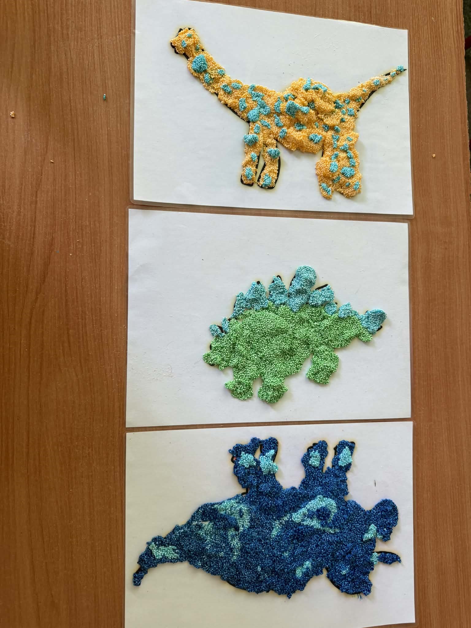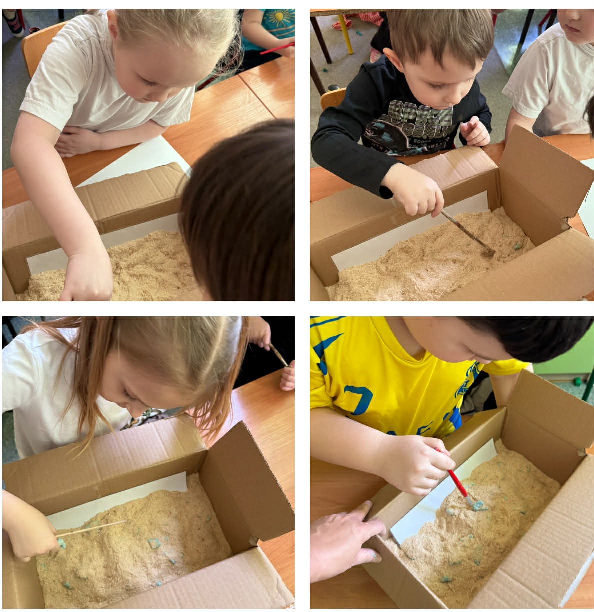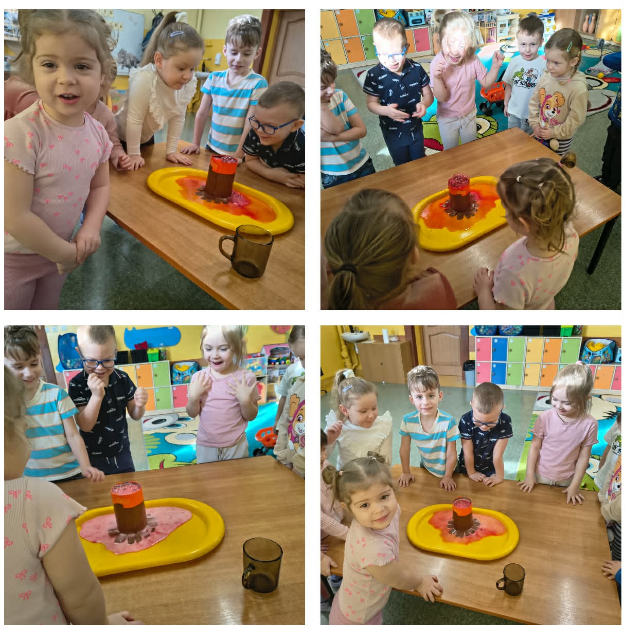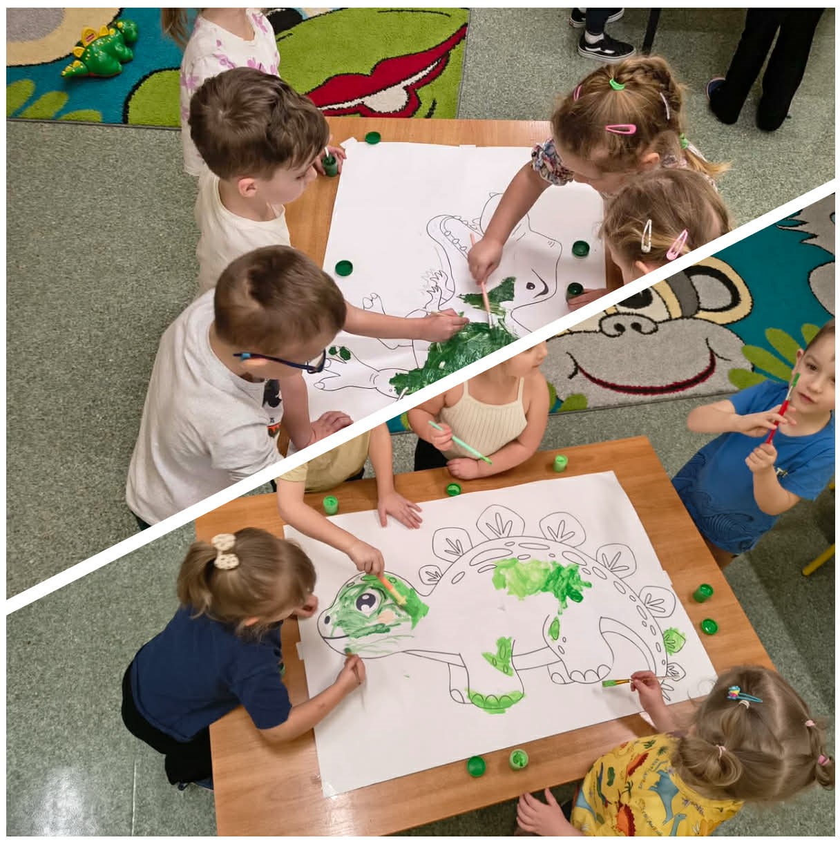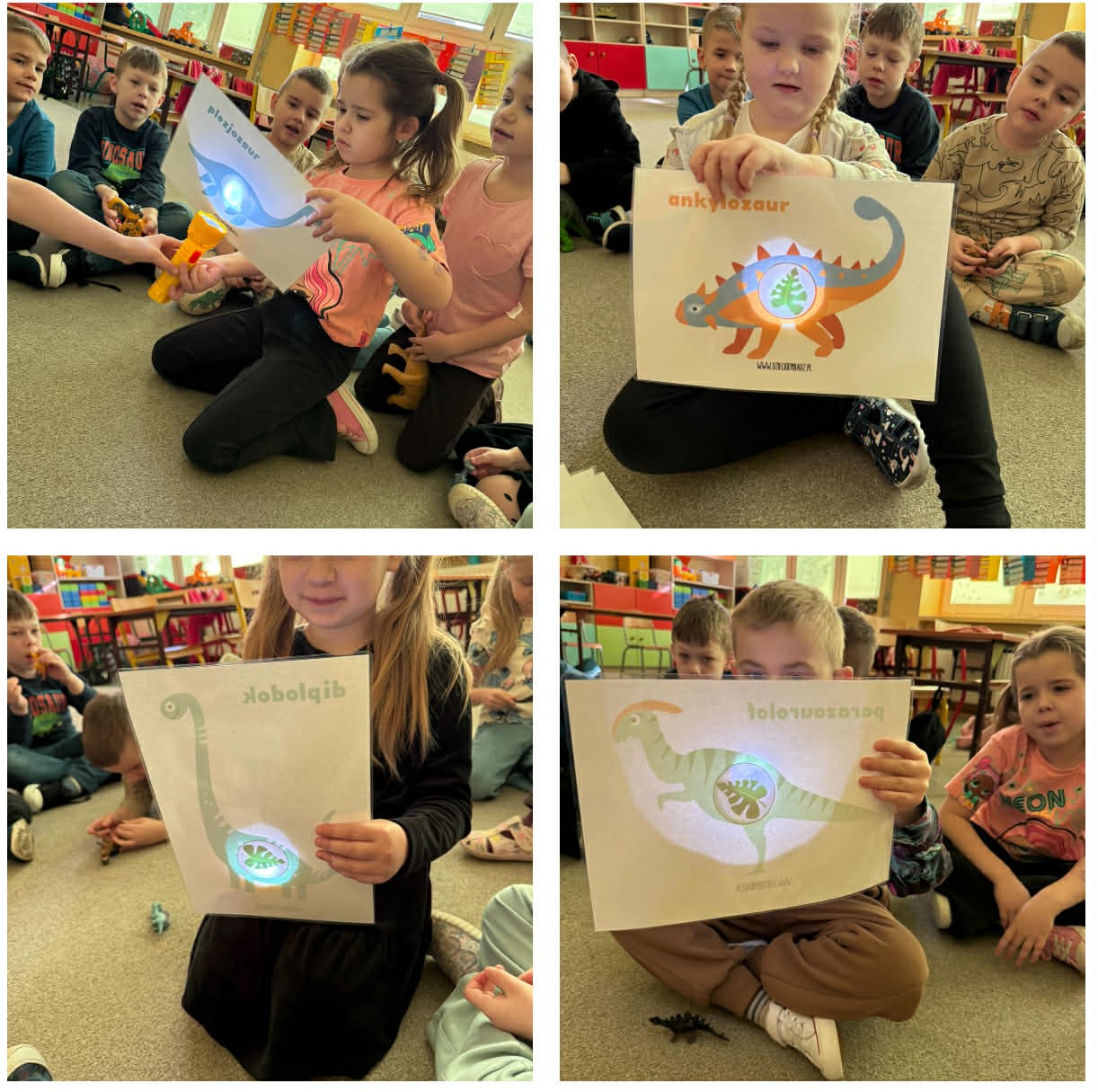 W grupach Żabki i Słoneczka odbył się wyjątkowy Dzień Dinozaura, który na długo pozostanie w pamięci naszych przedszkolaków. Tego dnia dzieci przeniosły się miliony lat wstecz, do fascynującego świata prehistorycznych gadów. Przedszkolaki poznały nazwy różnych dinozaurów, oglądały je z bliska, a nawet… zaglądały do ich paszczy i brzuszków, by odgadnąć, co mogły zjeść. Dopasowywały dinozaury do odpowiednich jaj, tańczyły w rytm dinozaurowych przebojów i z ogromnym zaangażowaniem brały udział w przygotowanych aktywnościach. Na chwilę wszystkie dzieci stały się prawdziwymi paleontologami – poszukiwały szczątków kości i śladów dinozaurów, a następnie z wielką starannością składały odkryte elementy w całość, odtwarzając sylwetki prehistorycznych stworzeń. W grupie Słoneczka przedszkolaki wykazały się ogromną skutecznością, budując z wielu elementów imponująco dużego dinozaura. Niespodziewanie wydarzył się moment, który wywołał prawdziwą eksplozję emocji! Rozległ się głośny huk do drzwi… a po chwili okazało się, że odwiedził nas Wujek Andrzej, który przyjechał… na ogromnym dinozaurze! Wielki, z potężnymi zębami, wzbudził najpierw podziw, a potem szerokie uśmiechy. Okazał się niezwykle przyjaznym gościem i chętne dzieci mogły przejechać się na jego grzbiecie. To był prawdziwy hit dnia! Dinozaur został zaproszony również na zajęcia ruchowe. Po intensywnym wysiłku wydarzyło się coś zupełnie niespodziewanego – zaczął znosić jajka! Zniósł aż cztery, a dzieci z niecierpliwością i radością obserwowały to niezwykłe zjawisko, zastanawiając się, kto zabierze dinozaurowe jajko do domu. Teraz już każdy wie, skąd biorą się dinozaury! Ogromne wrażenie zrobiły także wybuchające wulkany, które „eksplodowały” w obu grupach, wywołując wielkie „wow!” na twarzach dzieci. Było mnóstwo emocji, radości i naukowych odkryć. Na zakończenie tego niezwykłego dnia przedszkolaki radośnie pozowały do zdjęć w fotobudce oraz z wyjątkowym gościem – dinozaurem. To był dzień pełen śmiechu, ruchu, odkryć i niezapomnianych wrażeń. Jedno jest pewne – prehistoria jeszcze nigdy nie była tak blisko nas!