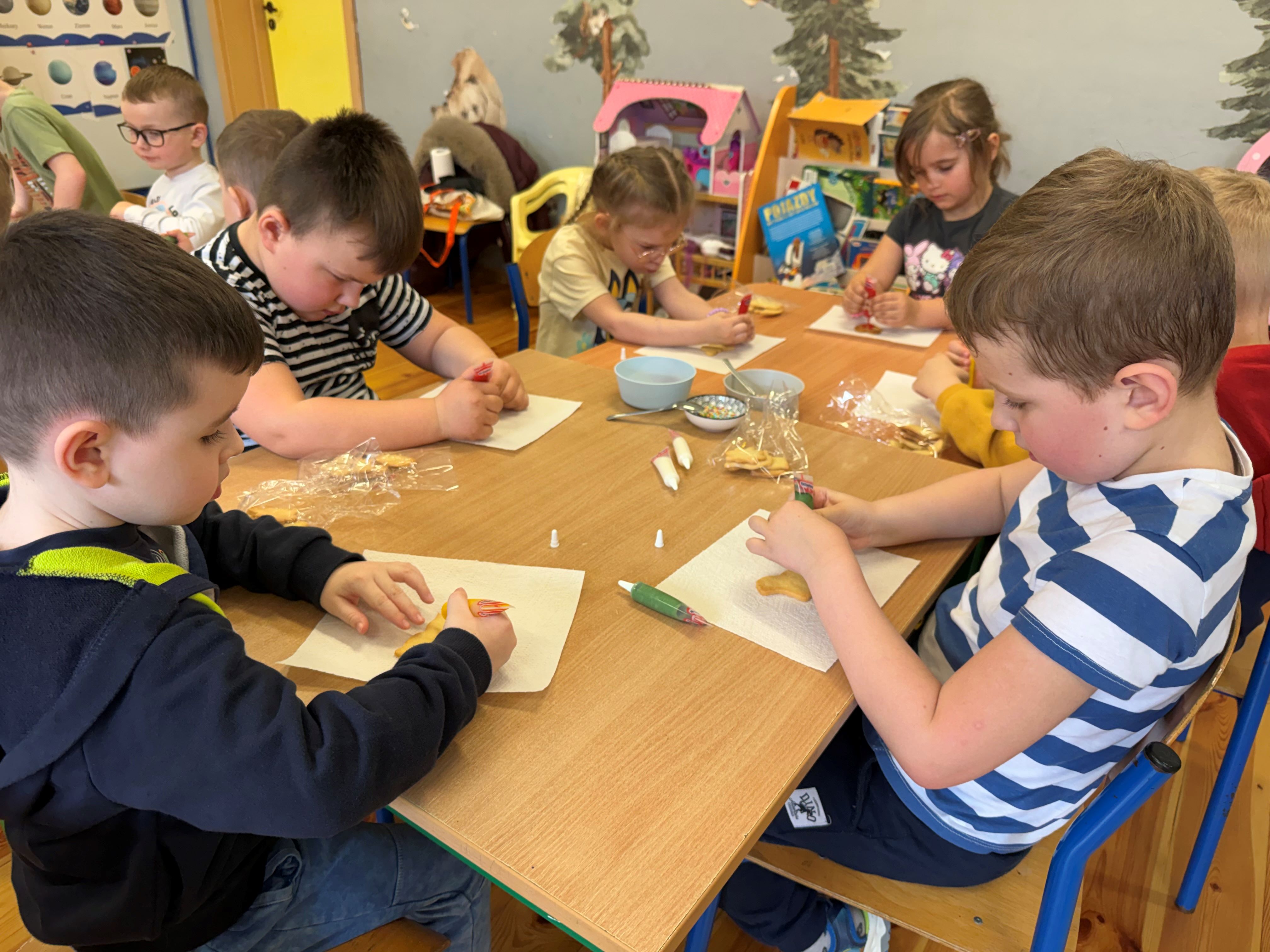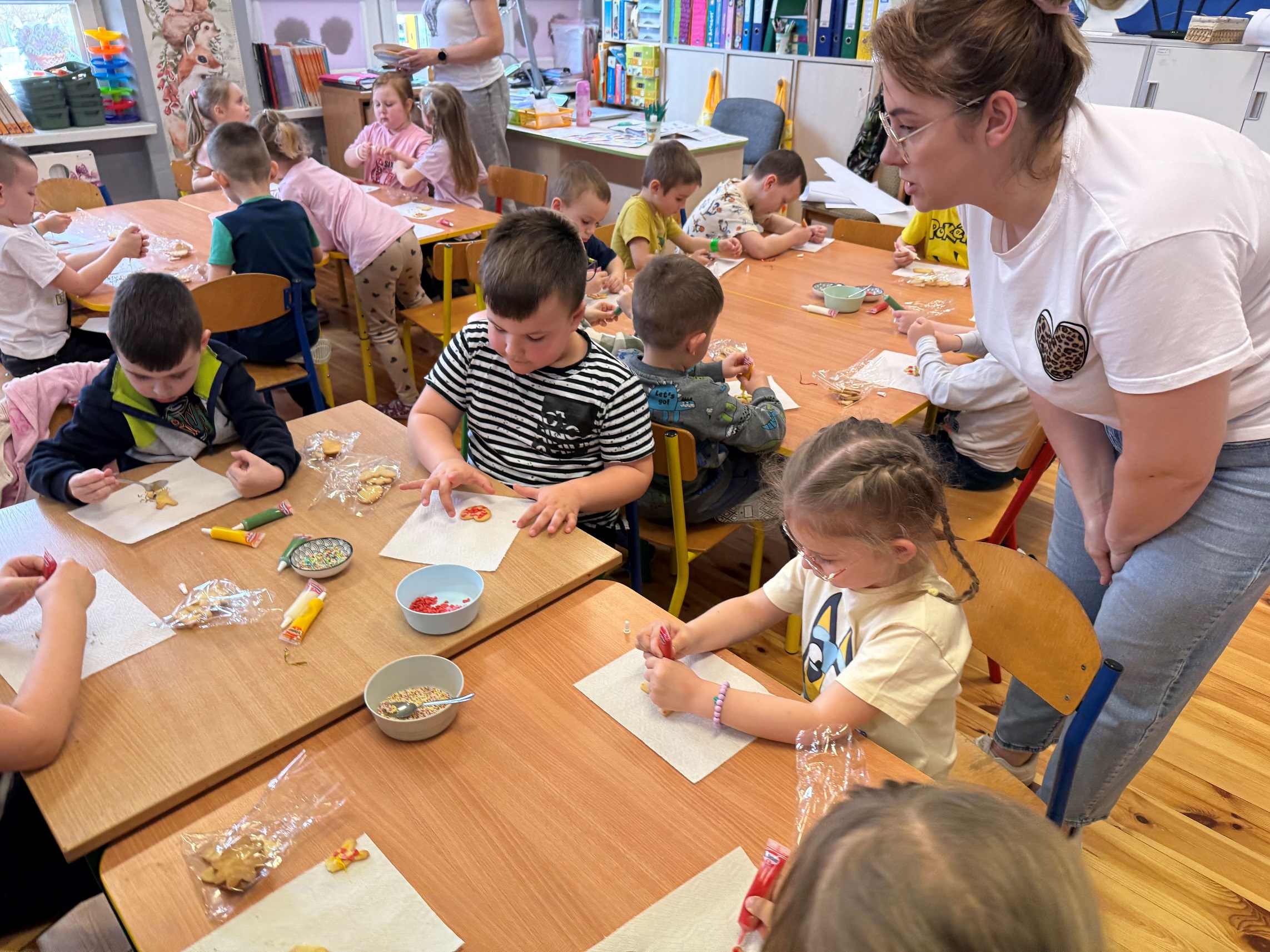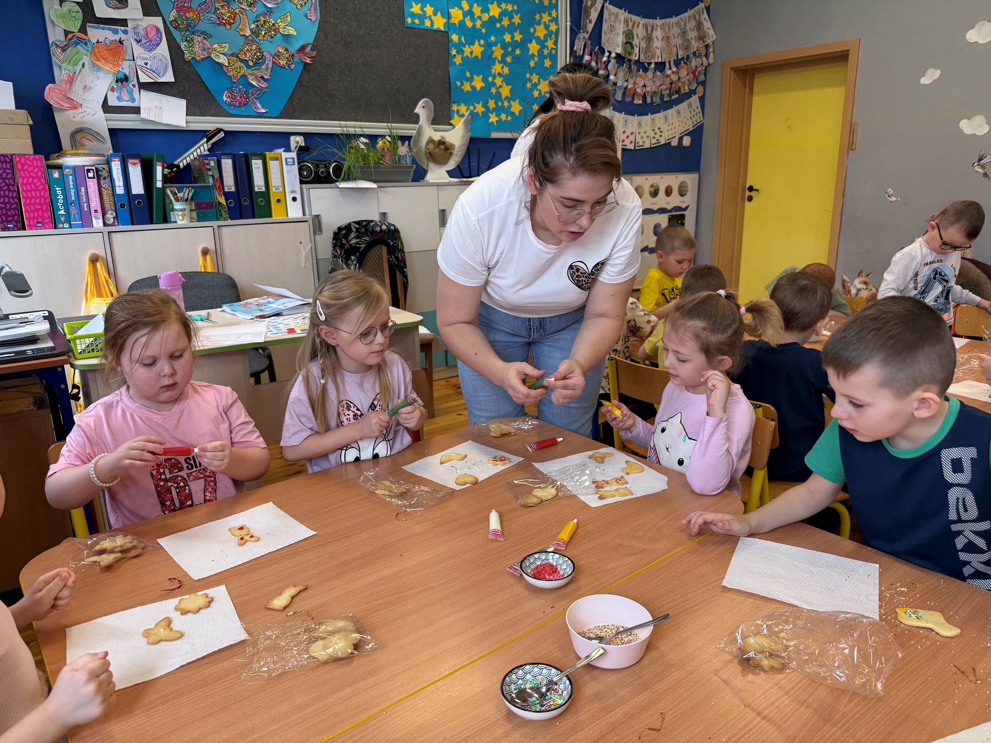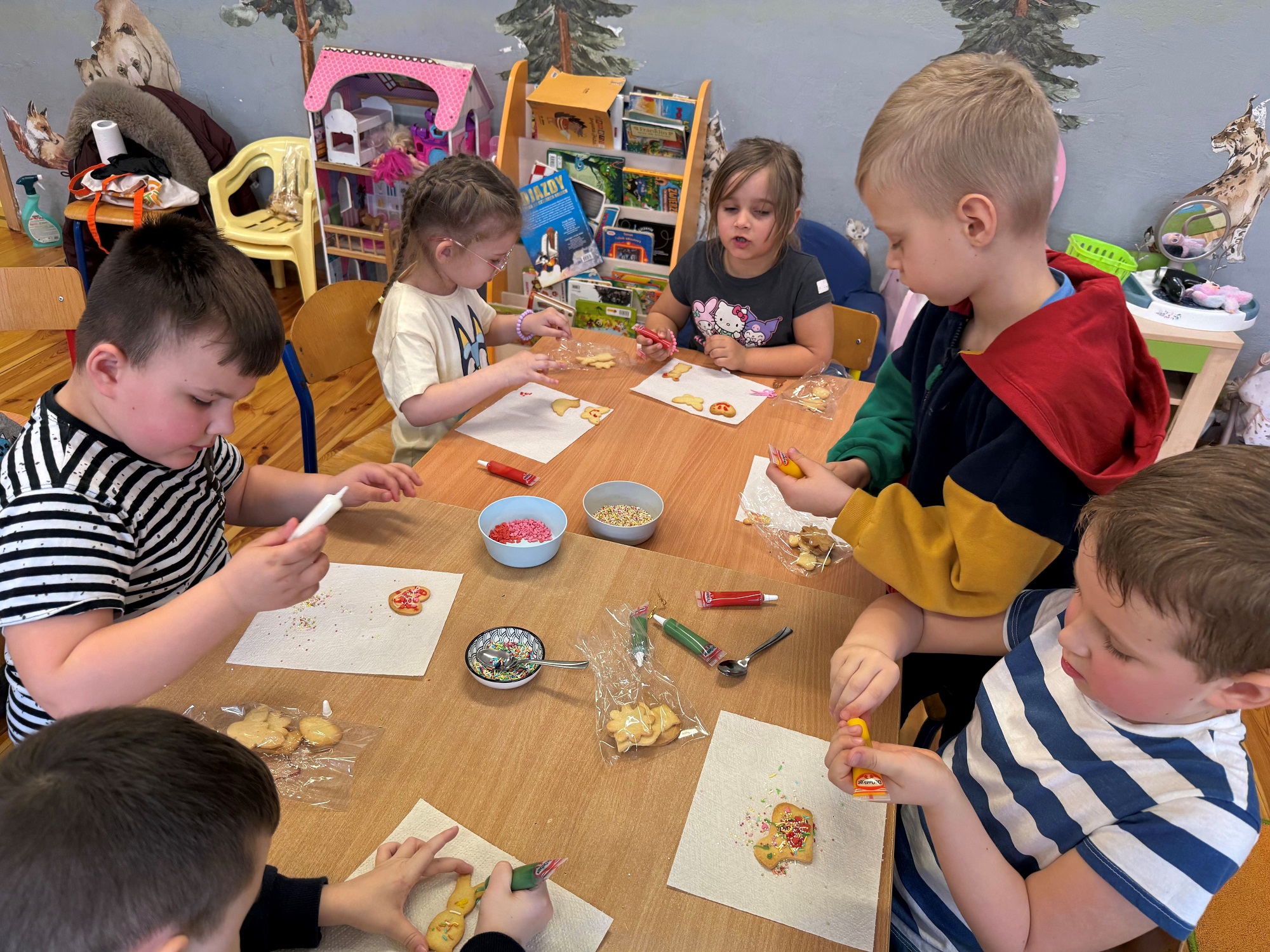 Z inicjatywy pani Klaudii Wójciak – właścicielki lokalnej pracowni cukierniczej, 14 kwietnia w grupie Promyczki odbyły się warsztaty dekorowania ciasteczek. Tuż przez rozpoczęciem warsztatów przedszkolaki dokładnie umyły ręce i przestrzegały wszystkich ustalonych zasad - cukierniczy savoir-vivre to podstawa. Następnie przystąpiły do rozpakowywania torebek z kruchymi ciasteczkami, ćwicząc przy okazji motorykę małą i precyzję ruchów. Dzieci z wielką radością się zamieniły się w małych cukierników. Były lukrowe mazaki w ruchu, kolorowe wzorki, a cukrowe posypki sypały się niemal jak confetti! Każde ciasteczko było inne i absolutnie wyjątkowe – dokładnie tak jak ich autorzy. Dzieci z ciekawością podglądały swoje pomysły oraz dzieliły się swoimi wrażeniami. W czasie warsztatów było kolorowo i bardzo kreatywnie. Na zakończenie dzieci serdecznie podziękowały pani Klaudii za super warsztaty zapraszając do wspólnej zabawy i pamiątkowego zdjęcia. Słodko dziękujemy – grupa Promyczki.
