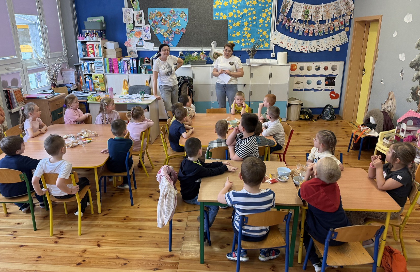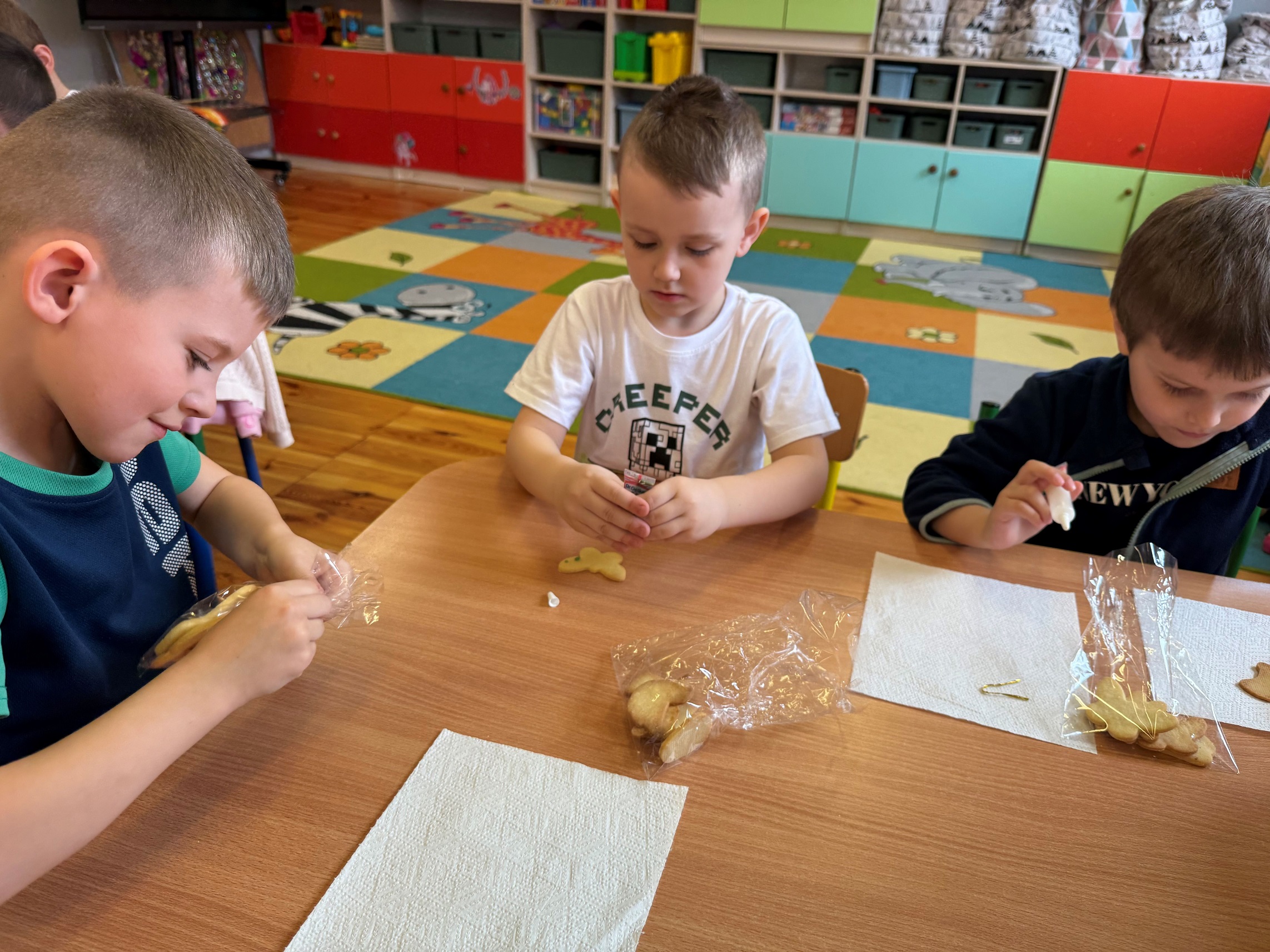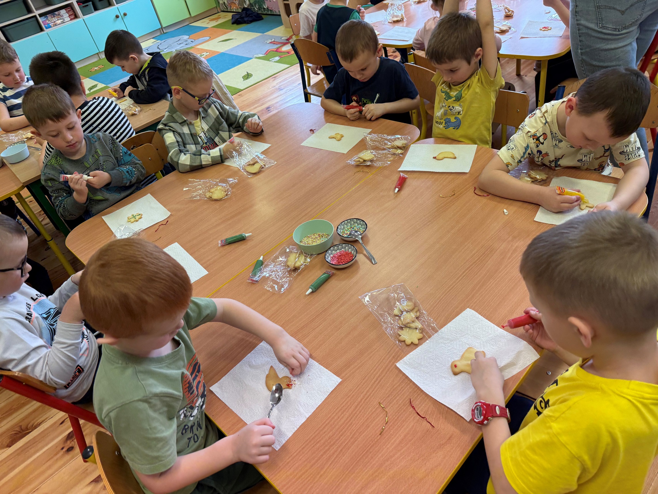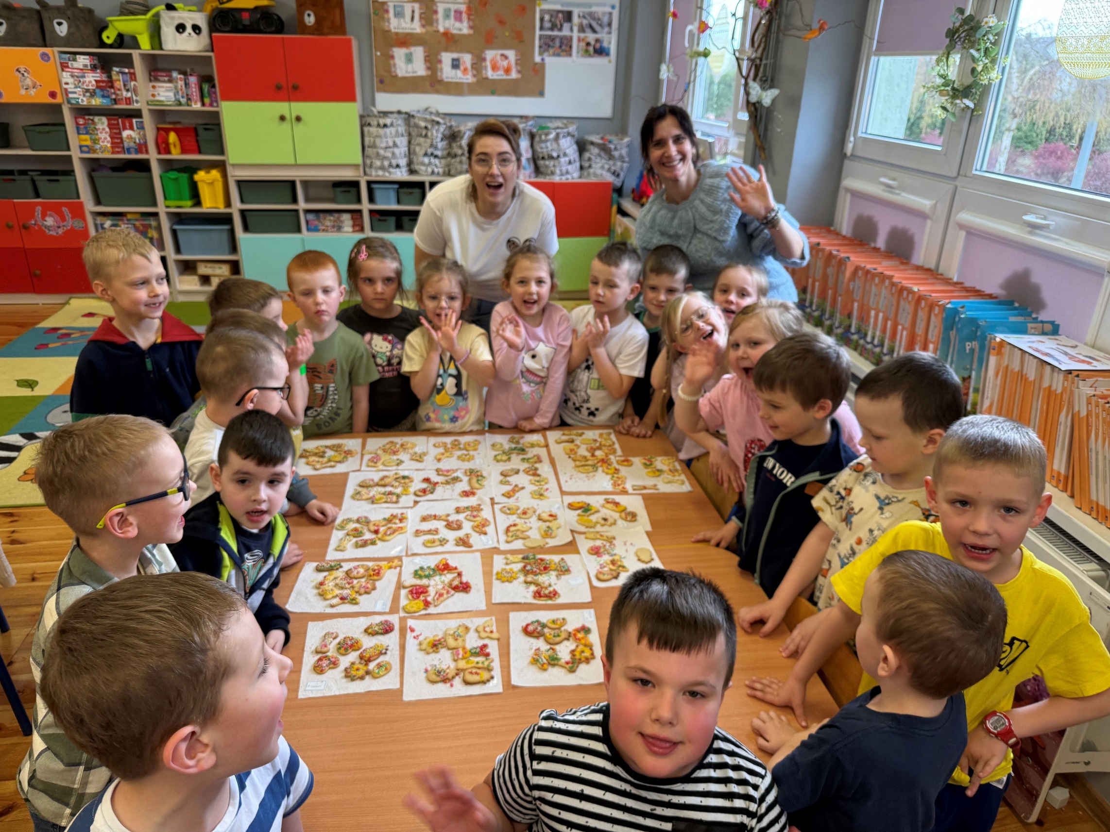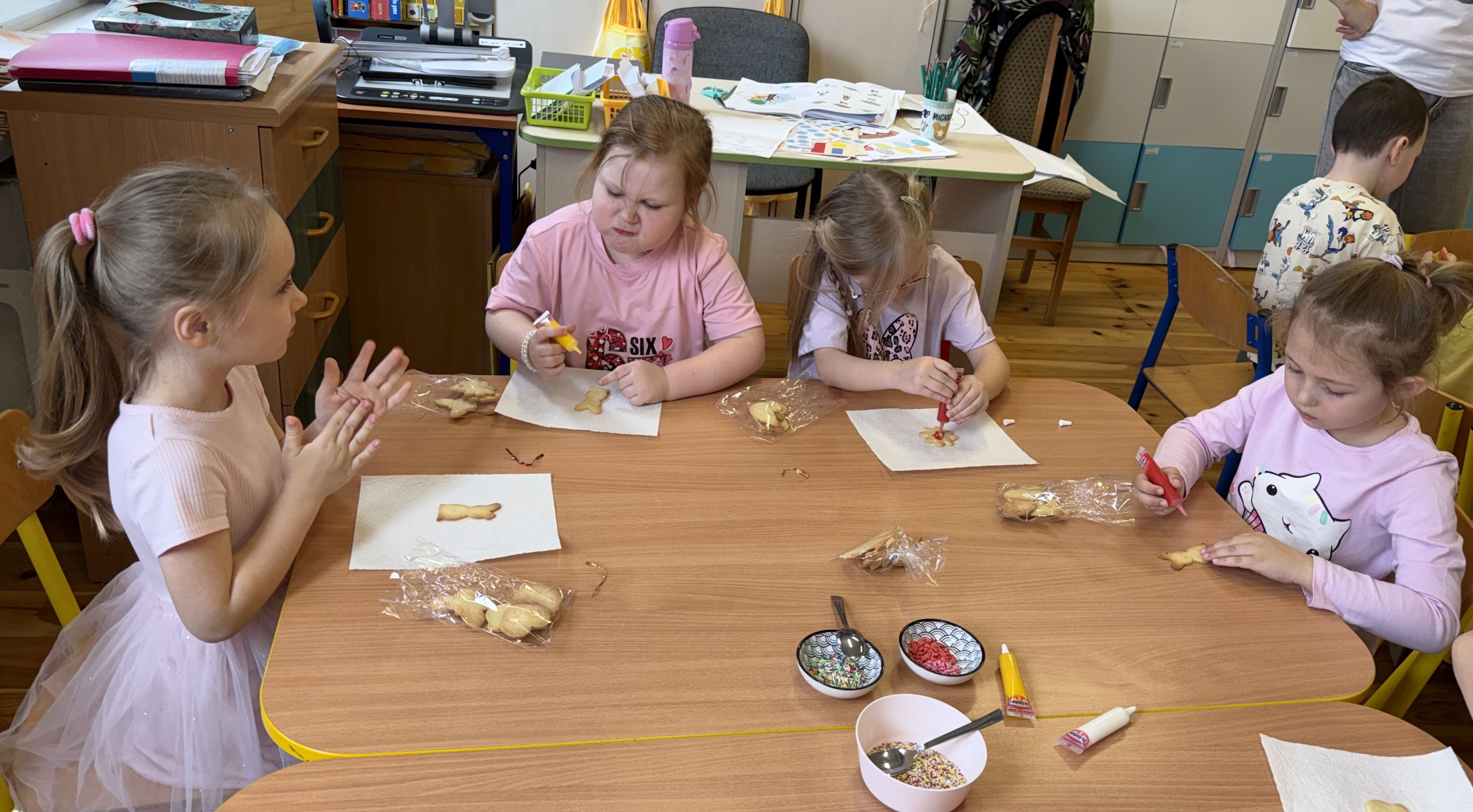 Z inicjatywy pani Klaudii Wójciak – właścicielki lokalnej pracowni cukierniczej, 14 kwietnia w grupie Promyczki odbyły się warsztaty dekorowania ciasteczek. Tuż przez rozpoczęciem warsztatów przedszkolaki dokładnie umyły ręce i przestrzegały wszystkich ustalonych zasad - cukierniczy savoir-vivre to podstawa. Następnie przystąpiły do rozpakowywania torebek z kruchymi ciasteczkami, ćwicząc przy okazji motorykę małą i precyzję ruchów. Dzieci z wielką radością się zamieniły się w małych cukierników. Były lukrowe mazaki w ruchu, kolorowe wzorki, a cukrowe posypki sypały się niemal jak confetti! Każde ciasteczko było inne i absolutnie wyjątkowe – dokładnie tak jak ich autorzy. Dzieci z ciekawością podglądały swoje pomysły oraz dzieliły się swoimi wrażeniami. W czasie warsztatów było kolorowo i bardzo kreatywnie. Na zakończenie dzieci serdecznie podziękowały pani Klaudii za super warsztaty zapraszając do wspólnej zabawy i pamiątkowego zdjęcia. Słodko dziękujemy – grupa Promyczki.