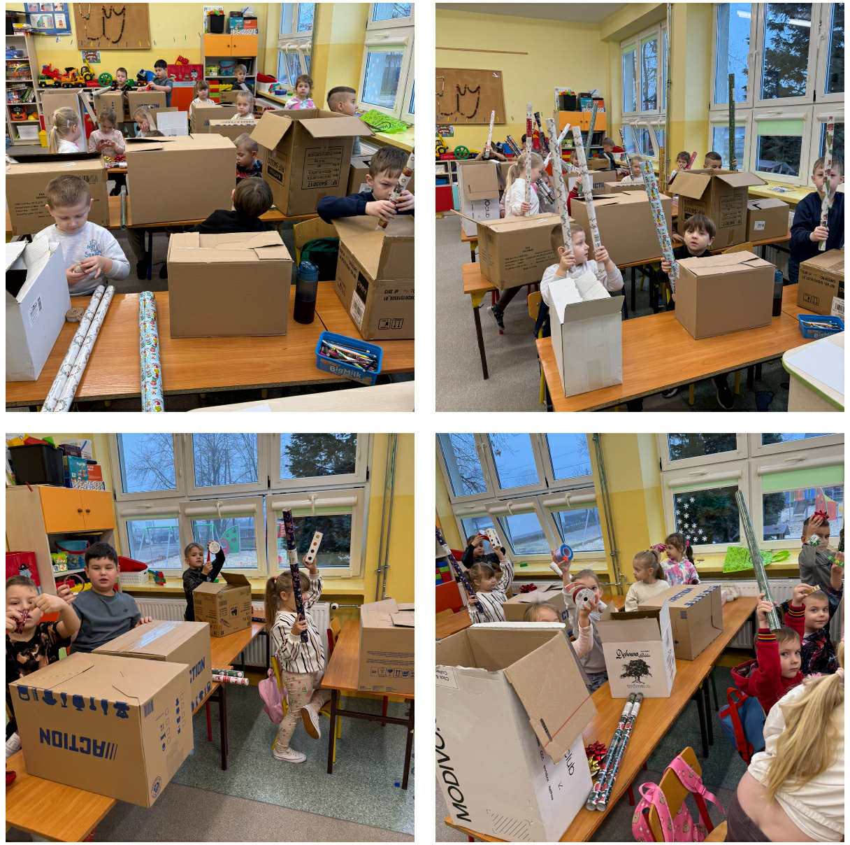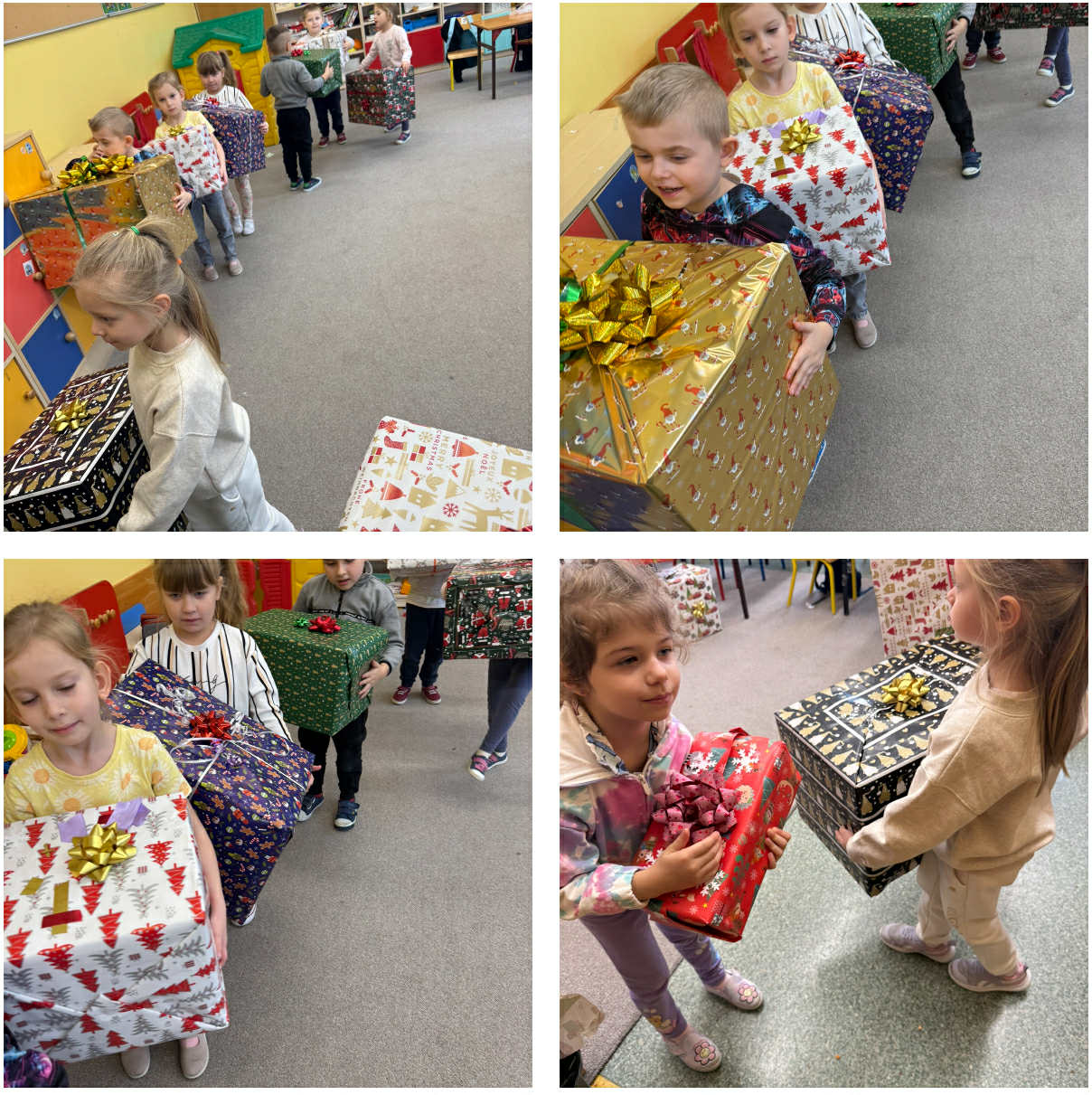 Dzieci przyniosły tekturowe pudełka różnej wielkości, papier ozdobny i dekoracyjne kokardy. Rozpoczęliśmy rozmowy o tym, kto co chciałby dostać lub podarować komuś.Mówiliśmy o sprawianiu przyjemności oraz o dzieleniu się dobrem. Doszliśmy do wniosku, że wielkimi krokami zbliża się czas, kiedy będziemy mieli taką możliwość, czyli Boże Narodzenie i należy sie podszkolić, aby pieknie zapakować prezenty dla wszystkich, którym chcemy je podarować. Dzieci szybko zabrały się za ćwiczenia w pakowaniu prezentów i powiem szczerze, wychodziło im świetnie. Z zaangażowaniem dobierały odpowiednie papiery i kokardy, zwracając uwagę na kolory i wzory. Wspólnie uczyliśmy się, jak mierzyć papier, jak delikatnie zawijać rogi oraz jak przewiązywać wstążkę, aby tworzyła piękną ozdobę. Podczas zajęć panowała radosna, świąteczna atmosfera, a dzieci chętnie sobie pomagały — jedne trzymały papier, inne dbały o taśmę czy kokardę. Warsztaty były nie tylko świetną zabawą, ale też okazją do rozwijania zdolności manualnych, kreatywności oraz współpracy w grupie.Wszystkie przygotowane prezenty zostały następnie ustawione w przedszkolnym wnętrzu jako dekoracja. Nadały one przestrzeni wyjątkowy, świąteczny nastrój i już z daleka przyciągały wzrok kolorowymi papierami oraz fantazyjnymi kokardami. Dzięki pracy dzieci w naszym przedszkolu pojawiła się pierwsza zapowiedź zbliżających się świąt.