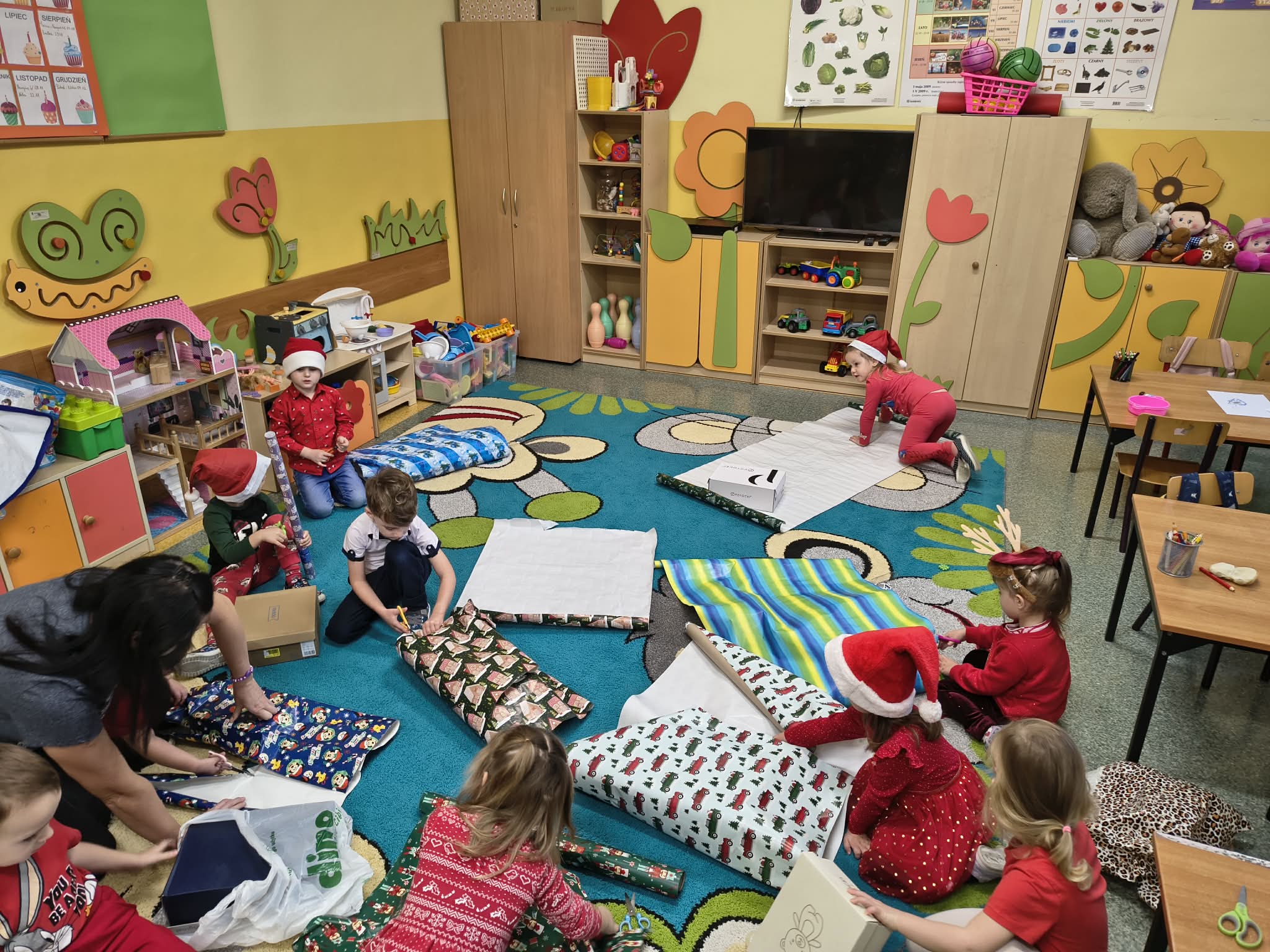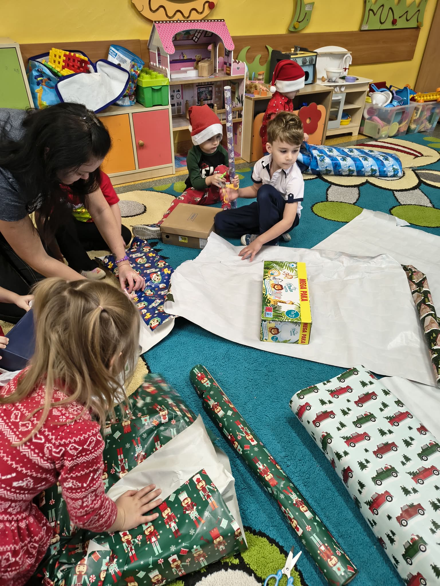 Warsztaty pakowania prezentów w przedszkolu w Sadykierzu odbyły się w dwóch grupach: Słoneczka uczestniczyły w zajęciach 5 grudnia, natomiast Żabki 2 grudnia. Każda z grup z zaangażowaniem tworzyła swoje świąteczne pudełka, dobierając papiery i ozdoby według własnych pomysłów.