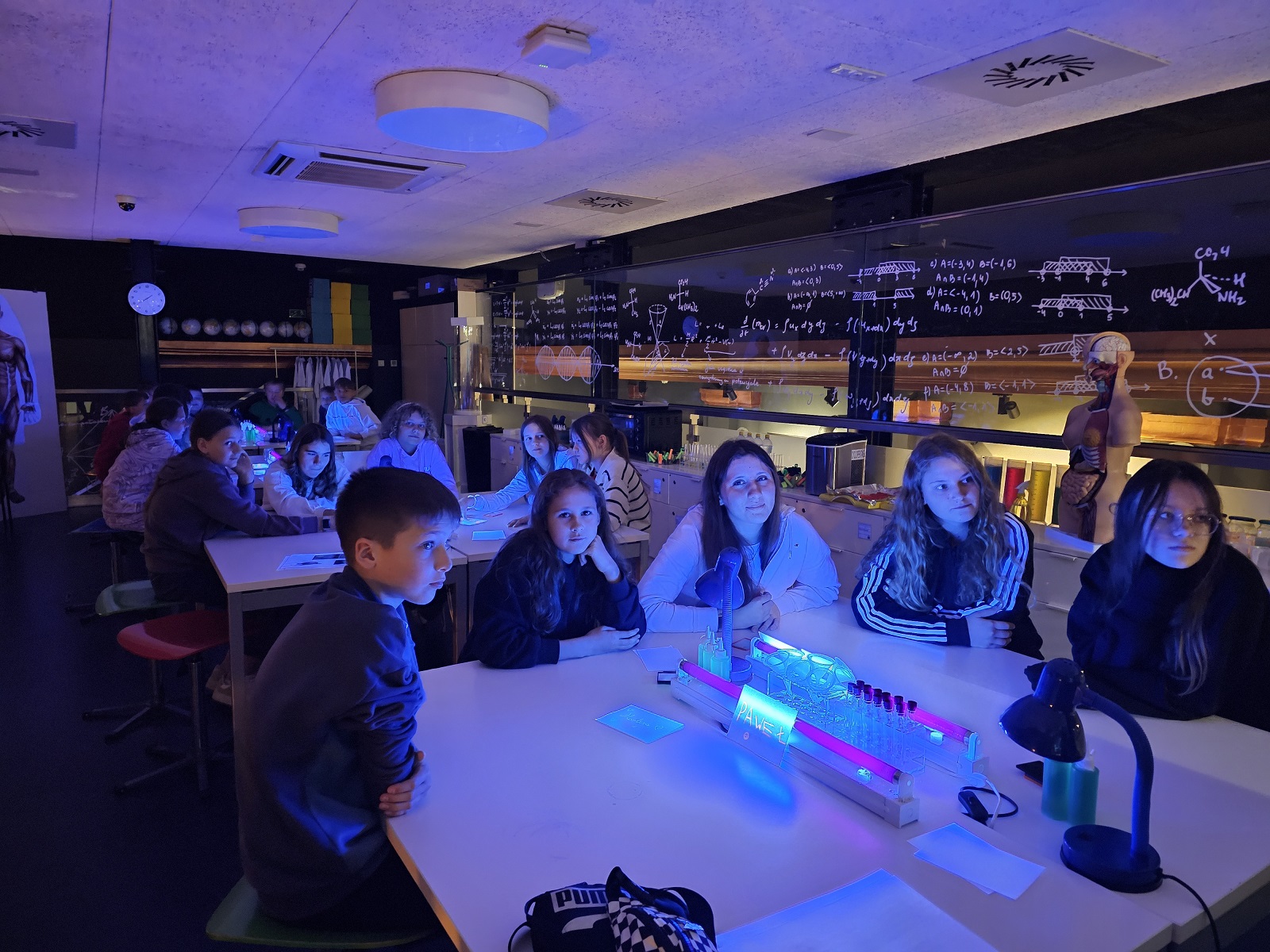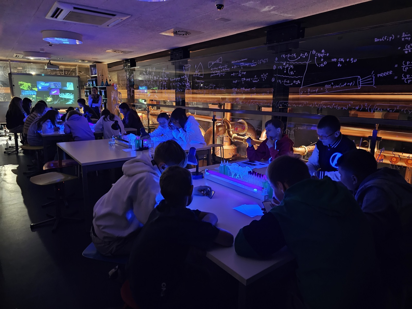 Kolejnym punktem programu wycieczki były warsztaty oraz zwiedzanie ekspozycji Energetycznego Centrum Nauki Fundacji PGE w Kielcach. Podczas warsztatów „Świecące w ciemności – luminescencja” uczniowie w trakcie eksperymentowania po ciemku poznali odpowiedź na pytania: Czy świetliki świecą tak samo jak żarówki? Czy istnieją świecące grzyby? Dowiedzieli się, na czym polega zjawisko bioluminescencji i jakie organizmy żywe potrafią emitować światło. Podczas warsztatów było wiele intrygujących doświadczeń, w trakcie których uczniowie sprawdzali m.in. czy pieniądze i dokumenty świecą w ciemności, jakie substancje emitują światło i w jaki sposób zjawisko luminescencji pomaga w prowadzeniu śledztwa.