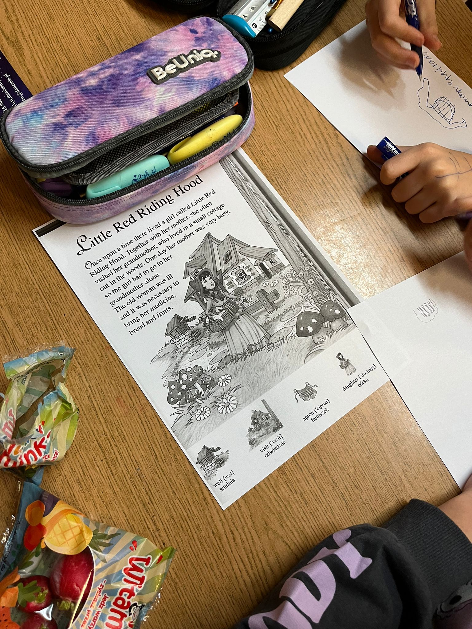 Kolejne spotkania miały charakter czytelniczo-językowy. Dzieci z dużym zainteresowaniem wysłuchały bajek "Czerwony Kapturek" i "Dziewczynka z zapałkami", czytanych z elementami języka angielskiego. Dzięki temu uczniowie mieli okazję osłuchać się z obcym językiem w przystępnej, atrakcyjnej formie, a także poznać nowe słownictwo w kontekście znanych opowieści.